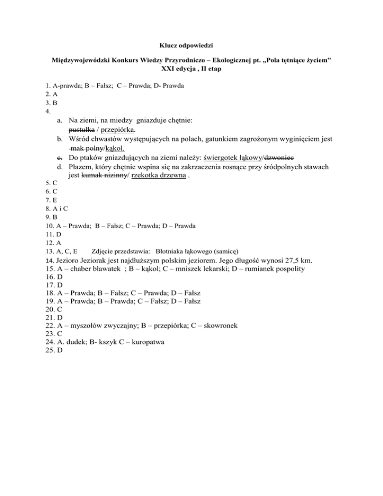Klucz odpowiedzi Międzywojewódzki Konkurs Wiedzy Przyrodniczo – Ekologicznej pt. „Pola tętniące życiem” XXI edycja , II etap 1. A-prawda; B – Fałsz; C – Prawda; D- Prawda 2. A 3. B 4. a. Na ziemi, na miedzy gniazduje chętnie: pustułka / przepiórka. b. Wśród chwastów występujących na polach, gatunkiem zagrożonym wyginięciem jest mak polny/kąkol. c. Do ptaków gniazdujących na ziemi należy: świergotek łąkowy/dzwoniec d. Płazem, który chętnie wspina się na zakrzaczenia rosnące przy śródpolnych stawach jest kumak nizinny/ rzekotka drzewna . 5. C 6. C 7. E 8. A i C 9. B 10. A – Prawda; B – Fałsz; C – Prawda; D – Prawda 11. D 12. A 13. A, C, E Zdjęcie przedstawia: Błotniaka łąkowego (samicę) 14. Jezioro Jeziorak jest najdłuższym polskim jeziorem. Jego długość wynosi 27,5 km. 15. A – chaber bławatek ; B – kąkol; C – mniszek lekarski; D – rumianek pospolity 16. D 17. D 18. A – Prawda; B – Fałsz; C – Prawda; D – Fałsz 19. A – Prawda; B – Prawda; C – Fałsz; D – Fałsz 20. C 21. D 22. A – myszołów zwyczajny; B – przepiórka; C – skowronek 23. C 24. A. dudek; B- kszyk C – kuropatwa 25. D