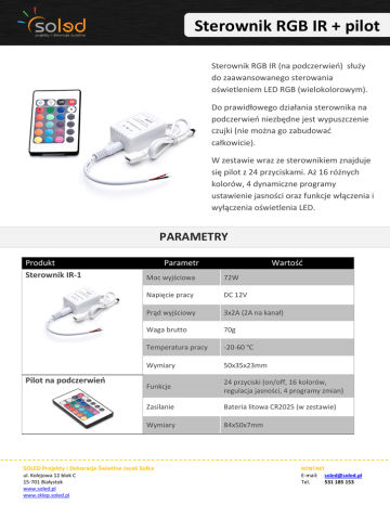 Sterownik RGB IR + pilot Sterownik RGB IR (na podczerwień) służy do zaawansowanego sterowania oświetleniem LED RGB (wielokolorowym). Do prawidłowego działania sterownika na podczerwień niezbędne jest wypuszczenie czujki (nie można go zabudować całkowicie). W zestawie wraz ze sterownikiem znajduje się pilot z 24 przyciskami. Aż 16 różnych kolorów, 4 dynamiczne programy ustawienie jasności oraz funkcje włączenia i wyłączenia oświetlenia LED. PARAMETRY Produkt Sterownik IR-1 Pilot na podczerwień Parametr Moc wyjściowa 72W Napięcie pracy DC 12V Prąd wyjściowy 3x2A (2A na kanał) Waga brutto 70g Temperatura pracy -20-60 ℃ Wymiary 50x35x23mm Funkcje 24 przyciski (on/off, 16 kolorów, regulacja jasności, 4 programy zmian) Zasilanie Bateria litowa CR2025 (w zestawie) Wymiary 84x50x7mm SOLED Projekty i Dekoracje Świetlne Jacek Solka ul. Kolejowa 12 blok C 15-701 Białystok www.soled.pl www.sklep.soled.pl Wartość TKO KONTAKT E-mail: [email protected] Tel. 531 185 153 FUNKCJE PILOTA IR WYMIARY STEROWNIKA PODŁĄCZENIE STEROWNIKA SOLED Projekty i Dekoracje Świetlne Jacek Solka ul. Kolejowa 12 blok C 15-701 Białystok www.soled.pl www.sklep.soled.pl KONTAKT E-mail: [email protected] Tel. 531 185 153