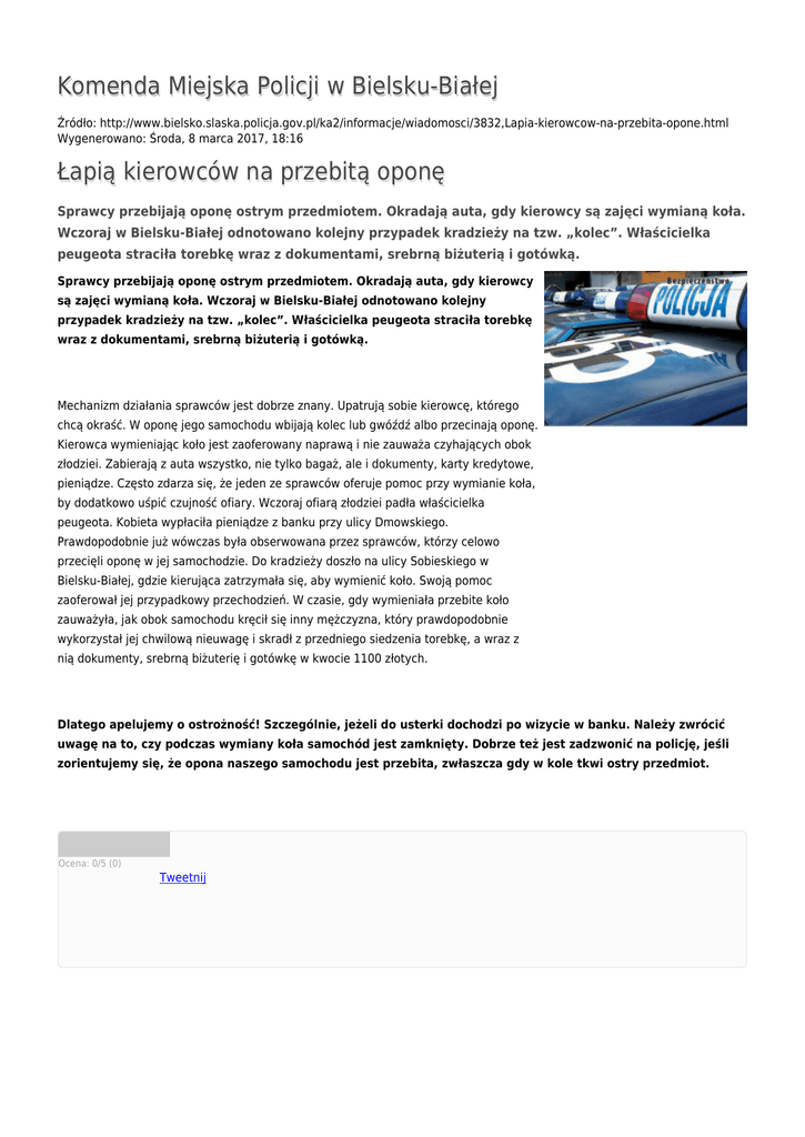 Komenda Miejska Policji w Bielsku-Białej Źródło: http://www.bielsko.slaska.policja.gov.pl/ka2/informacje/wiadomosci/3832,Lapia-kierowcow-na-przebita-opone.html Wygenerowano: Środa, 8 marca 2017, 18:16 Łapią kierowców na przebitą oponę Sprawcy przebijają oponę ostrym przedmiotem. Okradają auta, gdy kierowcy są zajęci wymianą koła. Wczoraj w Bielsku-Białej odnotowano kolejny przypadek kradzieży na tzw. „kolec”. Właścicielka peugeota straciła torebkę wraz z dokumentami, srebrną biżuterią i gotówką. Sprawcy przebijają oponę ostrym przedmiotem. Okradają auta, gdy kierowcy są zajęci wymianą koła. Wczoraj w Bielsku-Białej odnotowano kolejny przypadek kradzieży na tzw. „kolec”. Właścicielka peugeota straciła torebkę wraz z dokumentami, srebrną biżuterią i gotówką. Mechanizm działania sprawców jest dobrze znany. Upatrują sobie kierowcę, którego chcą okraść. W oponę jego samochodu wbijają kolec lub gwóźdź albo przecinają oponę. Kierowca wymieniając koło jest zaoferowany naprawą i nie zauważa czyhających obok złodziei. Zabierają z auta wszystko, nie tylko bagaż, ale i dokumenty, karty kredytowe, pieniądze. Często zdarza się, że jeden ze sprawców oferuje pomoc przy wymianie koła, by dodatkowo uśpić czujność ofiary. Wczoraj ofiarą złodziei padła właścicielka peugeota. Kobieta wypłaciła pieniądze z banku przy ulicy Dmowskiego. Prawdopodobnie już wówczas była obserwowana przez sprawców, którzy celowo przecięli oponę w jej samochodzie. Do kradzieży doszło na ulicy Sobieskiego w Bielsku-Białej, gdzie kierująca zatrzymała się, aby wymienić koło. Swoją pomoc zaoferował jej przypadkowy przechodzień. W czasie, gdy wymieniała przebite koło zauważyła, jak obok samochodu kręcił się inny mężczyzna, który prawdopodobnie wykorzystał jej chwilową nieuwagę i skradł z przedniego siedzenia torebkę, a wraz z nią dokumenty, srebrną biżuterię i gotówkę w kwocie 1100 złotych. Dlatego apelujemy o ostrożność! Szczególnie, jeżeli do usterki dochodzi po wizycie w banku. Należy zwrócić uwagę na to, czy podczas wymiany koła samochód jest zamknięty. Dobrze też jest zadzwonić na policję, jeśli zorientujemy się, że opona naszego samochodu jest przebita, zwłaszcza gdy w kole tkwi ostry przedmiot. Ocena: 0/5 (0) Tweetnij