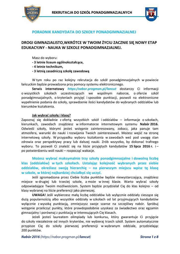 PORADNIK KANDYDATA DO SZKOŁY PONADGIMNAZJALNEJ DROGI GIMNAZJALISTO,WKRÓTCE W TWOIM ŻYCIU ZACZNIE SIĘ NOWY ETAP EDUKACYJNY - NAUKA W SZKOLE PONADGIMNAZJALNEJ. Masz do wyboru: - 3 letnie liceum ogólnokształcące, - 4 letnie technikum, - 3 letnią zasadniczą szkołę zawodową W tym roku po raz kolejny rekrutacja do szkół ponadgimnazjalnych w powiecie łańcuckim będzie prowadzona przy pomocy systemu elektronicznego. Serwis internetowy https:/nabor.progman.pl/lancut dostarczy Ci informacji o wszystkich szkołach uczestniczących we wspólnym naborze, o ofercie szkół ponadgimnazjalnych, o kryteriach przyjęć i sposobie punktacji, pozwoli na elektroniczne wypełnienie podania do szkoły, sprawdzenie ilości kandydatów do wybranych oddziałów lub kierunków kształcenia. Jak wybrać szkołę i klasę? Zapoznaj się dokładnie z ofertą wszystkich szkół i oddziałów – informacje o szkołach, kierunkach, zawodach znajdziesz w informatorze internetowym systemu Nabór 2016. Odwiedź szkoły, którymi jesteś wstępnie zainteresowany, zobacz, jaka panuje tam atmosfera, warunki do nauki i rozwijania Twoich zainteresowań. Możesz wejść na stronę internetową szkoły. W przypadku wyboru kształcenia w zawodach weź pod uwagę stan zdrowia oraz perspektywy pracy lub dalszej nauki. Zrób wszystko, by dokonać trafnego wyboru. To pozwoli Ci znaleźć się na liście przyjętych kandydatów 15 lipca 2016 r. i – po potwierdzeniu woli nauki – rozpocząć wakacje. Możesz wybrać maksymalnie trzy szkoły ponadgimnazjalne i dowolną liczbę klas (oddziałów) w tych szkołach. Ustalając kolejność wybranych przez siebie oddziałów, określasz swoją hierarchię – na pierwszym miejscu wpisz tę klasę w szkole, w której najbardziej chciałbyś się uczyć. Jeśli zgromadzona przez Ciebie liczba punktów będzie niewystarczająca, znajdziesz miejsce w drugiej lub trzeciej szkole, a może w innej klasie. Warto wybrać szkoły odpowiadające Twoim możliwościom. System będzie przydzielał Cię do klas kolejno – od klasy wybranej na liście preferencji jako pierwszej. UWAGA! Jeśli wybierzesz małą liczbę oddziałów lub wyłącznie oddziały cieszące się dużą popularnością albo wszystkie oddziały w szkołach od lat przyjmujących kandydatów wyłącznie z wysoką punktacją, zmniejszysz swoje szanse na szczęśliwy nabór. Spróbuj wstępnie przeliczyć punkty, które prawdopodobnie uzyskasz za świadectwo oraz egzamin gimnazjalny i porównaj z punktacją w interesujących Cię klasach. Jeżeli jesteś laureatem olimpiady lub konkursu, który gwarantuje Ci przyjęcie do szkoły niezależnie od innych kryteriów, nie wybieraj trzech szkół. System automatycznie przypisze Cię do szkoły pierwszej preferencji w wybranym oddziale, przydzielając 200 punktów. REKRUTACJA KROK PO KROKU I Wybór szkół i klas, w których chcesz kontynuować naukę To, oczywiście, pierwszy krok. Wskazówki, jak to zrobić, przedstawiono w poprzedniej części tego opracowania. Starając się o przyjęcie do oddziałów, do których wymagane są dodatkowe dokumenty, tj. do klas w niektórych technikach, zasadniczych szkołach zawodowych, sprawdź dokładnie, jakie to są dokumenty i kiedy masz je dostarczyć. Szczegółowe informacje na ten temat znajdziesz w informatorach tych szkół. II Wypełnienie i złożenie podania do szkoły ponadgimnazjalnej – od 25 kwietnia do 28 czerwca 2016 r. To formalne potwierdzenie Twojego wyboru. Podanie i sposób jego wypełnienia są szczegółowo opisane w następnej części poradnika. Lista preferencji Jest to lista, gdzie wpisujesz w kolejności wybrane przez Ciebie szkoły i klasy. W elektronicznej rekrutacji kandydat otrzymuje miejsce w jednym oddziale, usytuowanym najwyżej na indywidualnej liście preferencji Szkoła pierwszego wyboru Szkoła, którą wpisałeś jako pierwszą na swojej liście preferencji. Zmiana listy preferencji Być może już po dokonaniu przez Ciebie wyboru i złożeniu podania wraz z całą dokumentacją pojawią się wątpliwości, co do słuszności podjętej decyzji. Jeżeli zdecydujesz, że musisz dokonać zmian w swoich preferencjach, będziesz mógł to zrobić za zgodą rodzica, pod pewnymi warunkami. Jeżeli zdecydowałeś się na zmiany na liście preferencji, musisz zgłosić się do szkoły pierwszego wyboru wraz z rodzicem i odebrać dokumenty, które tam złożyłeś (potwierdzasz wraz z rodzicem odbiór dokumentów na podaniu i pozostawiasz je w szkole). Następnie wypełniasz podanie ponownie, podając nową listę preferencji i dostarczasz wraz z kompletem pozostałych dokumentów do nowej szkoły pierwszego wyboru. Nie decyduj pochopnie, dobrze przemyśl swoją decyzję, bowiem zmiany w obrębie całej listy oddziałów możesz dokonać do 28 czerwca 2016 r. III Dostarczenie kopii świadectwa i zaświadczenia do szkoły pierwszego wyboru – 24 czerwca - 28 czerwca 2016 r. do godz. 15.00 Wraz ze świadectwem otrzymasz potwierdzone za zgodność z oryginałem kopie świadectwa i zaświadczenia OKE o wynikach egzaminu. Kopię świadectwa i zaświadczenia o wynikach egzaminu zanosisz tylko do szkoły pierwszego wyboru. Jeżeli jesteś laureatem olimpiady lub konkursu, który gwarantuje Ci automatyczne przyjęcie do szkoły lub finalistą konkursu organizowanego przez kuratora oświaty, koniecznie przynieś oryginał odpowiedniego zaświadczenia. Oryginały dokumentów zaniesiesz do szkoły, która umieści Cię na liście przyjętych kandydatów, celem potwierdzenia woli nauki w tej szkole. IV Ogłoszenie wyników wstępnego przydziału – 15 lipca 2016 r. do godz. 10.00 Na podstawie Twojej listy preferencji oraz liczby punktów system dokona przydziału. Informację o tym, do której klasy się dostałeś, znajdziesz w Internecie oraz w Twojej szkole pierwszego wyboru. Jeśli nie zostałeś przyjęty do żadnej z klas (szkół), wówczas przejrzyj listę wolnych miejsc. Będzie ona dostępna w każdej s
