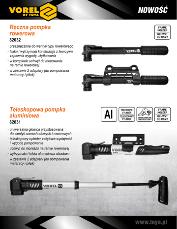 NOWOŚĆ Ręczna pompka rowerowa 82032 • przeznaczona do wentyli typu rowerowego • lekka i wytrzymała konstrukcja z tworzywa zapewnia wygodę użytkowania • w komplecie uchwyt do mocowania na ramie rowerowej • w zestawie 2 adaptery (do pompowania materacy i piłek) Teleskopowa pompka aluminiowa 82031 • uniwersalna głowica przystosowana do wentyli samochodowych i rowerowych • teleskopowy cylinder zwiększa wydajność i wygodę pompowania • uchwyt do montażu na ramie rowerowej • wytrzymała i lekka aluminiowa obudowa • w zestawie 2 adaptery (do pompowania materacy i piłek) www.toya.pl