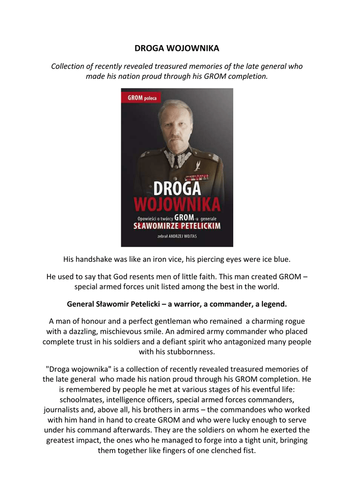 DROGA WOJOWNIKA Collection of recently revealed treasured memories of the late general who made his nation proud through his GROM completion. His handshake was like an iron vice, his piercing eyes were ice blue. He used to say that God resents men of little faith. This man created GROM – special armed forces unit listed among the best in the world. General Sławomir Petelicki – a warrior, a commander, a legend. A man of honour and a perfect gentleman who remained a charming rogue with a dazzling, mischievous smile. An admired army commander who placed complete trust in his soldiers and a defiant spirit who antagonized many people with his stubbornness. "Droga wojownika" is a collection of recently revealed treasured memories of the late general who made his nation proud through his GROM completion. He is remembered by people he met at various stages of his eventful life: schoolmates, intelligence officers, special armed forces commanders, journalists and, above all, his brothers in arms – the commandoes who worked with him hand in hand to create GROM and who were lucky enough to serve under his command afterwards. They are the soldiers on whom he exerted the greatest impact, the ones who he managed to forge into a tight unit, bringing them together like fingers of one clenched fist. “General Sławomir Petelicki was a courageous and entrepreneurial officer, and they are rare, who had the character, vision and drive, during a period of transformation and confusion, to set up GROM in the face of considerable opposition. It was also a capability his country greatly needed. There are few military men who can claim to be founders of such a unit. To a great friend and a great Pole!” Aldwin Wight, former SAS Commander “While I knew General Petelicki and had great respect for his initiative in creating GROM, I am afraid I do not have much to contribute. I did visit his unit on his invitation, and I thoroughly enjoyed the event and was impressed by what he had accomplished. When I was serving in the US government, one of my responsibilities was to be informed about the development of similar units in the United States (which in fact General Petelicki told me precipitated his own initiative), and I was very struck by the similarity of the rigorous training and the demanding expectations placed on the young men eager to be challenged and determined to serve their country on the very front line”. Zbigniew Brzezinski, USA National Security Advisor to President Jimmy Carter “Sławomir Petelicki symbolized Poland for Americans - proud, patriotic and always hopeful despite adversity. His legacy and achievements should be an inspiration to all Poles”. Michael Sulick, former Director of the U.S. National Clandestine Service Znak Publishers 304 pages ISBN 978-83-240-2403-2