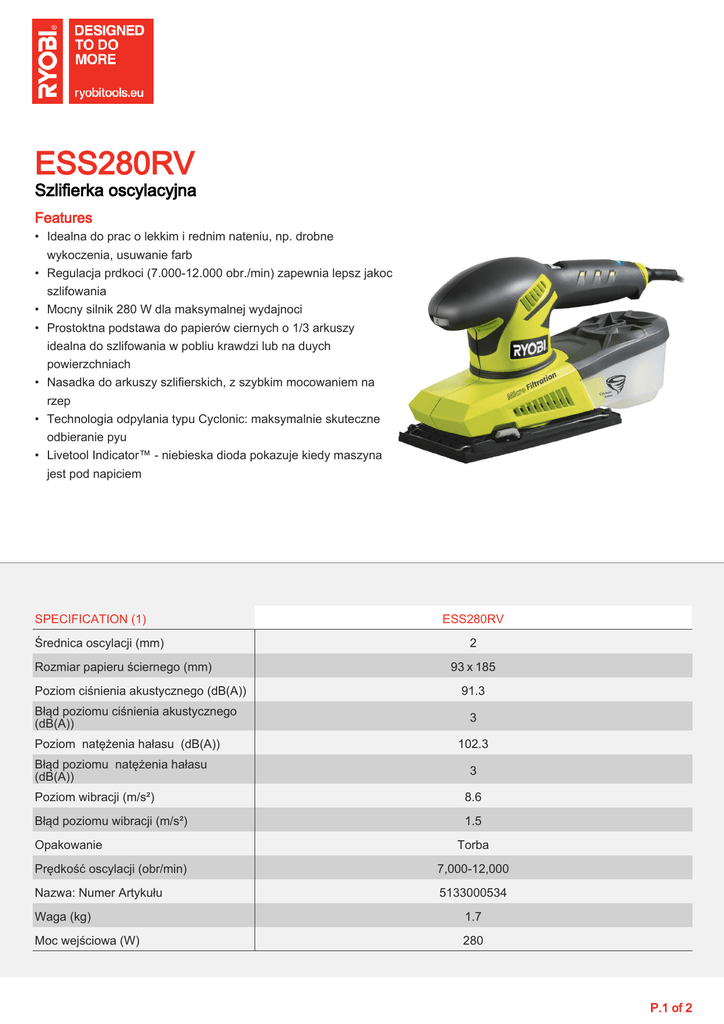 ESS280RV Szlifierka oscylacyjna Features • Idealna do prac o lekkim i rednim nateniu, np. drobne wykoczenia, usuwanie farb • Regulacja prdkoci (7.000-12.000 obr./min) zapewnia lepsz jakoc szlifowania • Mocny silnik 280 W dla maksymalnej wydajnoci • Prostoktna podstawa do papierów ciernych o 1/3 arkuszy idealna do szlifowania w pobliu krawdzi lub na duych powierzchniach • Nasadka do arkuszy szlifierskich, z szybkim mocowaniem na rzep • Technologia odpylania typu Cyclonic: maksymalnie skuteczne odbieranie pyu • Livetool Indicator™ - niebieska dioda pokazuje kiedy maszyna jest pod napiciem SPECIFICATION (1) Średnica oscylacji (mm) Rozmiar papieru ściernego (mm) Poziom ciśnienia akustycznego (dB(A)) Błąd poziomu ciśnienia akustycznego (dB(A)) Poziom natężenia hałasu (dB(A)) Błąd poziomu natężenia hałasu (dB(A)) ESS280RV 2 93 x 185 91.3 3 102.3 3 Poziom wibracji (m/s²) 8.6 Błąd poziomu wibracji (m/s²) 1.5 Opakowanie Torba Prędkość oscylacji (obr/min) 7,000-12,000 Nazwa: Numer Artykułu 5133000534 Waga (kg) 1.7 Moc wejściowa (W) 280 P.1 of 2