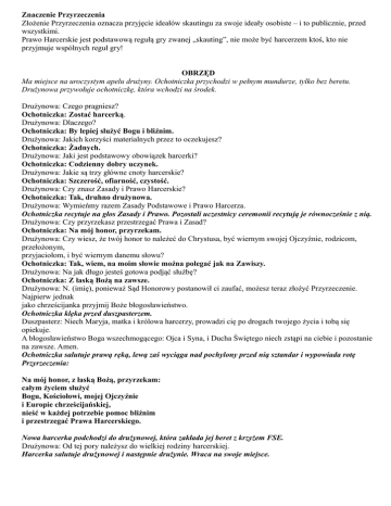 Znaczenie Przyrzeczenia Złożenie Przyrzeczenia oznacza przyjęcie ideałów skautingu za swoje ideały osobiste – i to publicznie, przed wszystkimi. Prawo Harcerskie jest podstawową regułą gry zwanej „skauting”, nie może być harcerzem ktoś, kto nie przyjmuje wspólnych reguł gry! OBRZĘD Ma miejsce na uroczystym apelu drużyny. Ochotniczka przychodzi w pełnym mundurze, tylko bez beretu. Drużynowa przywołuje ochotniczkę, która wchodzi na środek. Drużynowa: Czego pragniesz? Ochotniczka: Zostać harcerką. Drużynowa: Dlaczego? Ochotniczka: By lepiej służyć Bogu i bliźnim. Drużynowa: Jakich korzyści materialnych przez to oczekujesz? Ochotniczka: Żadnych. Drużynowa: Jaki jest podstawowy obowiązek harcerki? Ochotniczka: Codzienny dobry uczynek. Drużynowa: Jakie są trzy główne cnoty harcerskie? Ochotniczka: Szczerość, ofiarność, czystość. Drużynowa: Czy znasz Zasady i Prawo Harcerskie? Ochotniczka: Tak, druhno drużynowa. Drużynowa: Wymieńmy razem Zasady Podstawowe i Prawo Harcerza. Ochotniczka recytuje na głos Zasady i Prawo. Pozostali uczestnicy ceremonii recytują je równocześnie z nią. Drużynowa: Czy przyrzekasz przestrzegać Prawa i Zasad? Ochotniczka: Na mój honor, przyrzekam. Drużynowa: Czy wiesz, że twój honor to należeć do Chrystusa, być wiernym swojej Ojczyźnie, rodzicom, przełożonym, przyjaciołom, i być wiernym danemu słowu? Ochotniczka: Tak, wiem, na moim słowie można polegać jak na Zawiszy. Drużynowa: Na jak długo jesteś gotowa podjąć służbę? Ochotniczka: Z łaską Bożą na zawsze. Drużynowa: N. (imię), ponieważ Sąd Honorowy postanowił ci zaufać, możesz teraz złożyć Przyrzeczenie. Najpierw jednak jako chrześcijanka przyjmij Boże błogosławieństwo. Ochotniczka klęka przed duszpasterzem. Duszpasterz: Niech Maryja, matka i królowa harcerzy, prowadzi cię po drogach twojego życia i tobą się opiekuje. A błogosławieństwo Boga wszechmogącego: Ojca i Syna, i Ducha Świętego niech zstąpi na ciebie i pozostanie na zawsze. Amen. Ochotniczka salutuje prawą ręką, lewą zaś wyciąga nad pochylony przed nią sztandar i wypowiada rotę Przyrzeczenia: Na mój honor, z łaską Bożą, przyrzekam: całym życiem służyć Bogu, Kościołowi, mojej Ojczyźnie i Europie chrześcijańskiej, nieść w każdej potrzebie pomoc bliźnim i przestrzegać Prawa Harcerskiego. Nowa harcerka podchodzi do drużynowej, która zakłada jej beret z krzyżem FSE. Drużynowa: Od tej pory należysz do wielkiej rodziny harcerskiej. Harcerka salutuje drużynowej i następnie drużynie. Wraca na swoje miejsce.