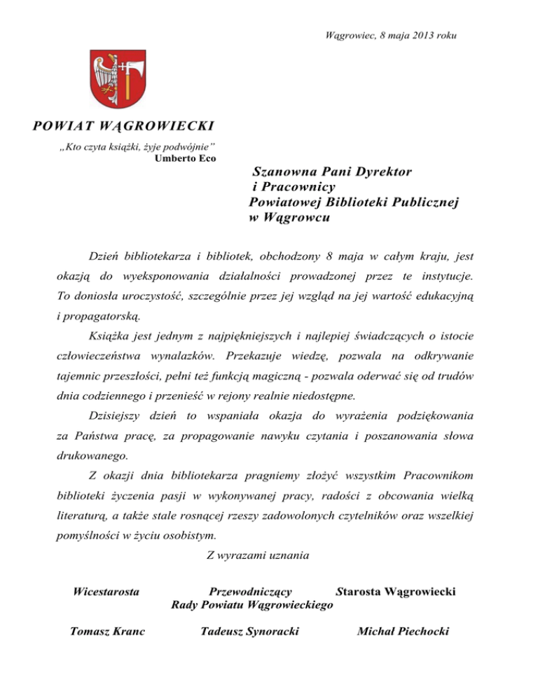 Wągrowiec, 8 maja 2013 roku POWIAT WĄGROWIECKI „Kto czyta książki, żyje podwójnie” Umberto Eco Szanowna Pani Dyrektor i Pracownicy Powiatowej Biblioteki Publicznej w Wągrowcu Dzień bibliotekarza i bibliotek, obchodzony 8 maja w całym kraju, jest okazją do wyeksponowania działalności prowadzonej przez te instytucje. To doniosła uroczystość, szczególnie przez jej wzgląd na jej wartość edukacyjną i propagatorską. Książka jest jednym z najpiękniejszych i najlepiej świadczących o istocie człowieczeństwa wynalazków. Przekazuje wiedzę, pozwala na odkrywanie tajemnic przeszłości, pełni też funkcją magiczną - pozwala oderwać się od trudów dnia codziennego i przenieść w rejony realnie niedostępne. Dzisiejszy dzień to wspaniała okazja do wyrażenia podziękowania za Państwa pracę, za propagowanie nawyku czytania i poszanowania słowa drukowanego. Z okazji dnia bibliotekarza pragniemy złożyć wszystkim Pracownikom biblioteki życzenia pasji w wykonywanej pracy, radości z obcowania wielką literaturą, a także stale rosnącej rzeszy zadowolonych czytelników oraz wszelkiej pomyślności w życiu osobistym. Z wyrazami uznania Wicestarosta Tomasz Kranc Przewodniczący Starosta Wągrowiecki Rady Powiatu Wągrowieckiego Tadeusz Synoracki Michał Piechocki Wągrowiec, 8 maja 2013 roku. POWIAT WĄGROWIECKI „Kto czyta książki, żyje podwójnie” Umberto Eco Szanowna Pani Dyrektor i Pracownicy Biblioteki Publicznej Gminy Mieścisko Dzień bibliotekarza i bibliotek, obchodzony 8 maja w całym kraju, jest okazją do wyeksponowania działalności prowadzonej przez te instytucje. To doniosła uroczystość, szczególnie przez jej wzgląd na jej wartość edukacyjną i propagatorską. Książka jest jednym z najpiękniejszych i najlepiej świadczących o istocie człowieczeństwa wynalazków. Przekazuje wiedzę, pozwala na odkrywanie tajemnic przeszłości, pełni też funkcję magiczną - pozwala oderwać się od trudów dnia codziennego i przenieść w rejony realnie niedostępne. Dzisiejszy dzień to wspaniała okazja do wyrażenia podziękowania za Państwa pracę, za propagowanie nawyku czytania i poszanowania słowa drukowanego. Z okazji dnia bibliotekarza pragniemy złożyć wszystkim Pracownikom biblioteki życzenia pasji w wykonywanej pracy, radości z obcowania wielką literaturą, a także stale rosnącej rzeszy zadowolonych czytelników oraz wszelkiej pomyślności w życiu osobistym. Z wyrazami uznania Wicestarosta Tomasz Kranc Przewodniczący Starosta Wągrowiecki Rady Powiatu Wągrowieckiego Tadeusz Synoracki Michał Piechocki Wągrowiec, 8 maja 2013 roku. POWIAT WĄGROWIECKI „Kto czyta książki, żyje podwójnie” Umberto Eco Szanowna Pani Kierownik i Pracownicy Biblioteki Publicznej Gminy Damasławek Dzień bibliotekarza i bibliotek, obchodzony 8 maja w całym kraju, jest okazją do wyeksponowania działalności prowadzonej przez te instytucje. To doniosła uroczystość, szczególnie przez jej wzgląd na jej wartość edukacyjną i propagatorską. Książka jest jednym z najpiękniejszych i najlepiej świadczących o istocie człowieczeństwa wynalazków. Przekazuje wiedzę, pozwala na odkrywanie tajemnic przeszłości, pełni też funkcję magiczną - pozwala oderwać się od trudów dnia codziennego i przenieść w rejony realnie niedostępne. Dzisiejszy dzień to wspaniała okazja do wyrażenia podziękowania za Państwa pracę, za propagowanie nawyku czytania i poszanowania słowa drukowanego. Z okazji dnia bibliotekarza pragniemy złożyć wszystkim Pracownikom biblioteki życzenia pasji w wykonywanej pracy, radości z obcowania wielką literaturą, a także stale rosnącej rzeszy zadowolonych czytelników oraz wszelkiej pomyślności w życiu osobistym. Z wyrazami uznania Wicestarosta Tomasz Kranc Przewodniczący Starosta Wągrowiecki Rady Powiatu Wągrowieckiego Tadeusz Synoracki Michał Piechocki Wągrowiec, 8 maja 2013 roku. POWIAT WĄGROWIECKI „Kto czyta książki, żyje podwójnie” Umberto Eco Szanowna Pani Dyrektor i Pracownicy Biblioteki Publicznej Gminy Wapno Dzień bibliotekarza i bibliotek, obchodzony 8 maja w całym kraju, jest okazją do wyeksponowania działalności prowadzonej przez te instytucje. To doniosła uroczystość, szczególnie przez jej wzgląd na jej wartość edukacyjną i propagatorską. Książka jest jednym z najpiękniejszych i najlepiej świadczących o istocie człowieczeństwa wynalazków. Przekazuje wiedzę, pozwala na odkrywanie tajemnic przeszłości, pełni też funkcję magiczną - pozwala oderwać się od trudów dnia codziennego i przenieść w rejony realnie niedostępne. Dzisiejszy dzień to wspaniała okazja do wyrażenia podziękowania za Państwa pracę, za propagowanie nawyku czytania i poszanowania słowa drukowanego. Z okazji dnia bibliotekarza pragniemy złożyć wszystkim Pracownikom biblioteki życzenia pasji w wykonywanej pracy, radości z obcowania wielką literaturą, a także stale rosnącej rzeszy zadowolonych czytelników oraz wszelkiej pomyślności w życiu osobistym. Z wyrazami uznania Wicestarosta Tomasz Kranc Przewodniczący Starosta Wągrowiecki Rady Powiatu Wągrowieckiego Tadeusz Synoracki Michał Piechocki Wągrowiec, 8 maja 2013 roku. POWIAT WĄGROWIECKI „Kto czyta książki, żyje podwójnie” Umberto Eco Szanowny Pan Dyrektor i Pracownicy Biblioteki Publicznej Gminy Wągrowiec Dzień bibliotekarza i bibliotek, obchodzony 8 maja w całym kraju, jest okazją do wyeksponowania działalności prowadzonej przez te instytucje. To doniosła uroczystość, szczególnie przez jej wzgląd na jej wartość edukacyjną i propagatorską. Książka jest jednym z najpiękniejszych i najlepiej świadczących o istocie człowieczeństwa wynalazków. Przekazuje wiedzę, pozwala na odkrywanie tajemnic przeszłości, pełni też funkcję magiczną - pozwala oderwać się od trudów dnia codziennego i przenieść w rejony realnie niedostępne. Dzisiejszy dzień to wspania