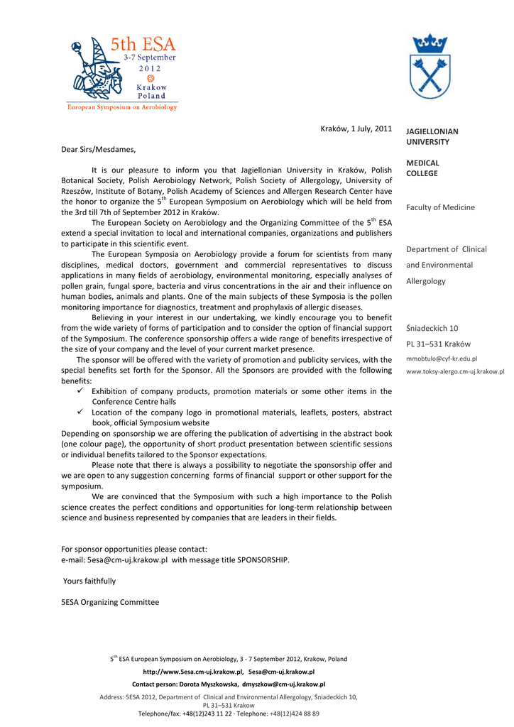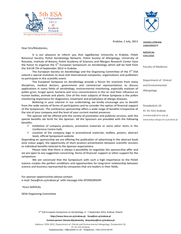 Kraków, 1 July, 2011 Dear Sirs/Mesdames, It is our pleasure to inform you that Jagiellonian University in Kraków, Polish Botanical Society, Polish Aerobiology Network, Polish Society of Allergology, University of Rzeszów, Institute of Botany, Polish Academy of Sciences and Allergen Research Center have th the honor to organize the 5 European Symposium on Aerobiology which will be held from the 3rd till 7th of September 2012 in Kraków. th The European Society on Aerobiology and the Organizing Committee of the 5 ESA extend a special invitation to local and international companies, organizations and publishers to participate in this scientific event. The European Symposia on Aerobiology provide a forum for scientists from many disciplines, medical doctors, government and commercial representatives to discuss applications in many fields of aerobiology, environmental monitoring, especially analyses of pollen grain, fungal spore, bacteria and virus concentrations in the air and their influence on human bodies, animals and plants. One of the main subjects of these Symposia is the pollen monitoring importance for diagnostics, treatment and prophylaxis of allergic diseases. Believing in your interest in our undertaking, we kindly encourage you to benefit from the wide variety of forms of participation and to consider the option of financial support of the Symposium. The conference sponsorship offers a wide range of benefits irrespective of the size of your company and the level of your current market presence. The sponsor will be offered with the variety of promotion and publicity services, with the special benefits set forth for the Sponsor. All the Sponsors are provided with the following benefits: Exhibition of company products, promotion materials or some other items in the Conference Centre halls Location of the company logo in promotional materials, leaflets, posters, abstract book, official Symposium website Depending on sponsorship we are offering the publication of advertising in the abstract book (one colour page), the opportunity of short product presentation between scientific sessions or individual benefits tailored to the Sponsor expectations. Please note that there is always a possibility to negotiate the sponsorship offer and we are open to any suggestion concerning forms of financial support or other support for the symposium. We are convinced that the Symposium with such a high importance to the Polish science creates the perfect conditions and opportunities for long-term relationship between science and business represented by companies that are leaders in their fields. For sponsor opportunities please contact: e-mail: [email protected] with message title SPONSORSHIP. Yours faithfully 5ESA Organizing Committee 5th ESA European Symposium on Aerobiology, 3 - 7 September 2012, Krakow, Poland http://www.5esa.cm-uj.krakow.pl, [email protected] Contact person: Dorota Myszkowska, [email protected] Address: 5ESA 2012, Department of Clinical and Environmental Allergology, Śniadeckich 10, PL 31–531 Krakow Telephone/fax: +48(12)243 11 22 · Telephone: +48(12)424 88 89 JAGIELLONIAN UNIVERSITY MEDICAL COLLEGE Faculty of Medicine Department of Clinical and Environmental Allergology Śniadeckich 10 PL 31–531 Kraków [email protected] www.toksy-alergo.cm-uj.krakow.pl