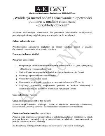 „Walidacja metod badań i szacowanie niepewności pomiaru w analizie chemicznej - przykłady obliczeń” Szkolenie doskonalące, adresowane dla personelu laboratoriów analitycznych, posiadających akredytację lub przygotowujących się do akredytacji. Celem szkolenia jest: Przedstawienie aktualnych poglądów na proces walidacji metod w analizie chemicznej i szacowanie niepewności pomiaru. Forma szkolenia: Wykład Program szkolenia: 1. Kompetencje techniczne laboratorium wg normy PN-EN ISO/IEC 17025:2005 - aktualizacja wymagań akredytacji 2. Spójność pomiarowa wyników badań; wymagania dokumentu DA-06 3. Walidacja a potwierdzenie metod badań 4. Charakterystyka metod badań 5. Szacowanie niepewności pomiaru; wymagania dokumentu EA-04/16 6. Przykłady szacowania niepewności pomiaru w analizie klasycznej i instrumentalnej, na podstawie aktualnych wytycznych i norm Czas szkolenia: 7 godzin Cena szkolenia za osobę: 590 zł/netto Podana cena szkolenia obejmuje: udział w szkoleniu, materiały szkoleniowe, lunch/brunch, przerwy kawowe i zaświadczenie o uczestnictwie w szkoleniu Cena szkolenia za osobę: 730 zł/netto Podana cena szkolenia obejmuje: udział w szkoleniu, materiały szkoleniowe, obiad, przerwy kawowe i zaświadczenie o uczestnictwie w szkoleniu, zakwaterowanie w pokoju 2-osobowym wraz z kolacją. Za dodatkową opłatą (100 zł netto) zakwaterowanie w pokoju 1-osobowym.