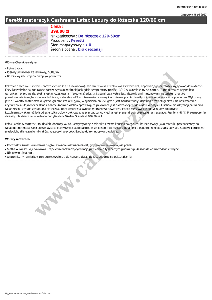 Informacje o produkcie Utworzono 08-03-2017 Feretti materacyk Cashmere Latex Luxury do łóżeczka 120/60 cm Cena : 399,00 zł Nr katalogowy : Do łóżeczek 120-60cm Producent : Feretti Stan magazynowy : < 0 Średnia ocena : brak recenzji Główna Charakterystyka: ● ● pl ● Pełny Latex. Idealny pokrowiec kaszmirowy, 550g/m2. Bardzo wysoki stopień przepływ powietrza. zk a. Pokrowiec Idealny. Kaszmir - bardzo cienkie (16-18 mikronów), miękkie włókna z wełny kóz kaszmirskich, zapewniają puszystość i wyjątkową delikatność. Kozy kaszmirskie są hodowane bardzo wysoko w Himalajach gdzie temperatury poniżej -30°C w okresie zimy są normą. Runo termoizolacyjne jest warunkiem przetrwania. Wełna jest wyczesywana (nie golona) wiosną. Kaszmirowa wełna jest niezwykłym i nietypowym materiałem. Jest to prawdopodobnie najbardziej wartościowe, naturalne włókno. Pokrowiec z wełną kaszmirową pochłania wilgoć i dobrze przepuszcza powietrze. Wykonany jest z 5 warstw materiałów o łącznej gramaturze 450 g/m2, w tymdzianina 250 g/m2. Jest bardzo trwały, dzianina przez długi okres nie nosi znamion użytkowania. Odpowiedni skład i dobrze dobrane włókna sprawiają, że pokrowiec jest bardzo ciepły i delikatny w dotyku. Fiselina, nieoddychająca tkanina wewnętrzna, została zastąpiona siateczką, która umożliwia swobodny przepływ powietrza. Jest to rzeczywiście oddychający pokrowiec. Rozpinanysuwak umożliwia zdjęcie tylko połowy pokrowca. W przypadku, gdy jedna jest prana, druga pozostaje na materacu. Pranie w 60°C. Przeznaczenie dzianiny dla dzieci potwierdzone certyfikatem OkoTex Standard 100 Klasa I. ec Pełny Lateks w materacu to idealnie dobrany wkład. Otrzymywany z mleczka drzewa kauczukowego,jest bardzo trwały, jako materiał przeznaczony na wkład do materaca. Cechuje się wysoką elastycznością, dopasowuje się idealnie do kształtu ciała. Jest absolutnie nieodkształcający się. Stanowi bardzo złe środowisko dla rozwoju mikrobów, roztoczy i grzybów. Bardzo dobry przepływ powietrza. ● ● ● Rozdzielny suwak - umożliwia ciągłe używanie materaca nawet, gdy połowa pokrowca jest prana. Siatka w konstrukcji pokrowca - zapewnia doskonałą cyrkulację powietrza a tym samym gwarantuje doskonałe odprowadzanie wilgoci. Nie powoduje alergii. Anatomiczny– umiarkowanie dostosowuje się do kształtu ciała, ale jest odporny na odkształcenia. w w w .c al ● in Walory materaca: Wygenerowano w programie www.oscGold.com