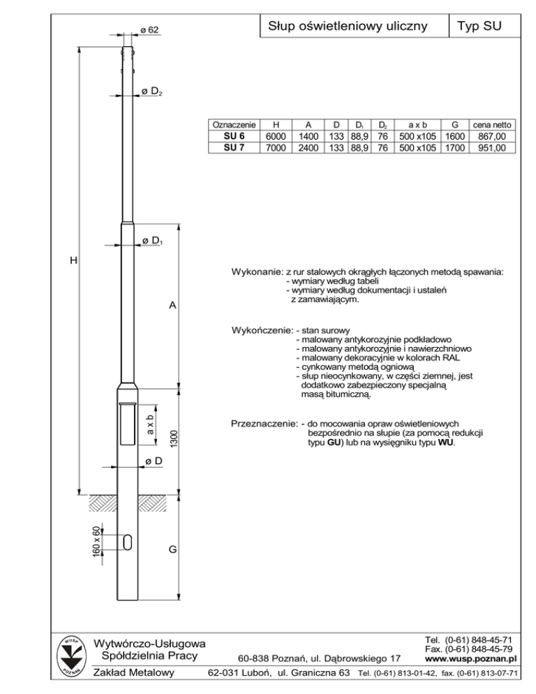 Słup oświetleniowy uliczny ø 62 Typ SU ø D2 Oznaczenie H SU 6 SU 7 6000 7000 A D D1 D2 1400 133 88,9 76 2400 133 88,9 76 axb G 500 x105 1600 500 x105 1700 cena netto 867,00 951,00 ø D1 H A Wykonanie: z rur stalowych okrągłych łączonych metodą spawania: - wymiary według tabeli - wymiary według dokumentacji i ustaleń z zamawiającym. 1300 axb Wykończenie: - stan surowy - malowany antykorozyjnie podkładowo - malowany antykorozyjnie i nawierzchniowo - malowany dekoracyjnie w kolorach RAL - cynkowany metodą ogniową - słup nieocynkowany, w części ziemnej, jest dodatkowo zabezpieczony specjalną masą bitumiczną. Przeznaczenie: - do mocowania opraw oświetleniowych bezpośrednio na słupie (za pomocą redukcji typu GU) lub na wysięgniku typu WU. 160 x 60 øD G Wytwórczo-Usługowa Spółdzielnia Pracy P O Z N AŃ Zakład Metalowy 60-838 Poznań, ul. Dąbrowskiego 17 Tel. (0-61) 848-45-71 Fax. (0-61) 848-45-79 www.wusp.poznan.pl 62-031 Luboń, ul. Graniczna 63 Tel. (0-61) 813-01-42, fax. (0-61) 813-07-71