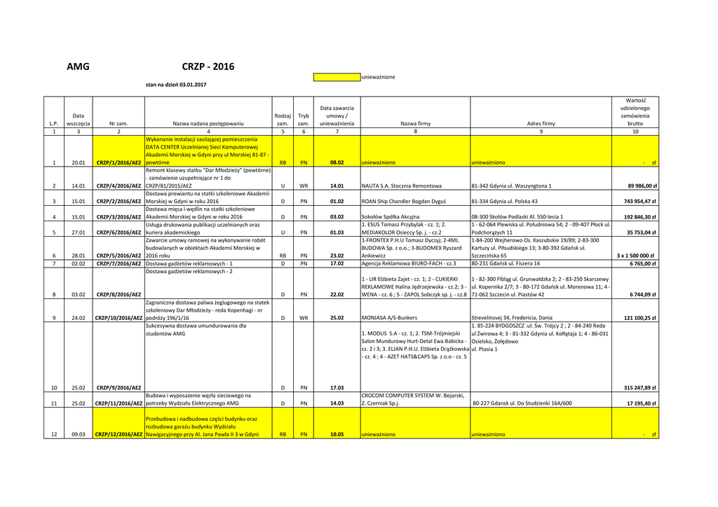 AMG CRZP - 2016 unieważnione stan na dzień 03.01.2017 L.P. 1 Data wszczęcia 3 Nr zam. 2 1 20.01 CRZP/1/2016/AEZ 2 14.01 CRZP/4/2016/AEZ 3 15.01 CRZP/2/2016/AEZ 4 15.01 CRZP/3/2016/AEZ 5 27.01 CRZP/6/2016/AEZ 6 7 28.01 02.02 CRZP/5/2016/AEZ CRZP/7/2016/AEZ Nazwa nadana postępowaniu 4 Wykonanie instalacji zasilającej pomieszczenia DATA CENTER Uczelnianej Sieci Komputerowej Akademii Morskiej w Gdyni przy ul Morskiej 81-87 powtórne Remont klasowy statku "Dar Młodzieży" (powtórne) - zamówienie uzupełniające nr 1 do CRZP/81/2015/AEZ Dostawa prowiantu na statki szkoleniowe Akademii Morskiej w Gdyni w roku 2016 Dostawa mięsa i wędlin na statki szkoleniowe Akademii Morskiej w Gdyni w roku 2016 Usługa drukowania publikacji uczelnianych oraz kuriera akademickiego Zawarcie umowy ramowej na wykonywanie robót budowlanych w obiektach Akademii Morskiej w 2016 roku Dostawa gadżetów reklamowych - 1 Dostawa gadżetów reklamowych - 2 Rodzaj zam. 5 Tryb zam. 6 Data zawarcia umowy / unieważnienia 7 RB PN 08.02 unieważniono unieważniono U WR 14.01 NAUTA S.A. Stocznia Remontowa 81-342 Gdynia ul. Waszyngtona 1 D PN 01.02 ROAN Ship Chandler Bogdan Dyguś 81-334 Gdynia ul. Polska 43 743 954,47 zł D PN 03.02 PN 01.03 RB D PN PN 23.02 17.02 08-300 Skołów Podlaski Al. 550-lecia 1 1 - 62-064 Plewiska ul. Południowa 54; 2 - 09-407 Płock ul. Podchorążych 11 1-84-200 Wejherowo Os. Kaszubskie 19/89; 2-83-300 Kartuzy ul. Piłsudskiego 13; 3-80-392 Gdańsk ul. Szczecińska 65 80-231 Gdańsk ul. Fiszera 14 192 846,30 zł U Sokołów Spółka Akcyjna 1. ESUS Tomasz Przybylak - cz. 1; 2. MEDIAKOLOR Osieccy Sp. j. - cz.2 1-FRONTEX P.H.U Tomasz Dyczyj; 2-4ML BUDOWA Sp. z o.o.; 3-BUDOMEX Ryszard Ankiewicz Agencja Reklamowa BIURO-FACH - cz.3 3 x 1 500 000 zł 6 765,00 zł 6 744,09 zł Nazwa firmy 8 Adres firmy 9 03.02 CRZP/8/2016/AEZ D PN 22.02 1 - LIR Elżbieta Zajet - cz. 1; 2 - CUKIERKI 1 - 82-300 Flbląg ul. Grunwaldzka 2; 2 - 83-250 Skarszewy REKLAMOWE Halina Jędrzejewska - cz.2; 3 - ul. Kopernika 2/7; 3 - 80-172 Gdańsk ul. Morenowa 11; 4 WENA - cz. 6 ; 5 - ZAPOL Sobczyk sp. j. - cz.8 71-062 Szczecin ul. Piastów 42 9 24.02 Zagraniczna dostawa paliwa żeglugowego na statek szkoleniowy Dar Młodzieży - reda Kopenhagi - nr CRZP/10/2016/AEZ podróży 196/1/16 Sukcesywna dostawa umundurowania dla studentów AMG D WR 25.02 MONJASA A/S-Bunkers 10 25.02 CRZP/9/2016/AEZ D PN 17.03 11 25.02 Budowa i wyposażenie węzła sieciowego na CRZP/11/2016/AEZ potrzeby Wydziału Elektrycznego AMG D PN 14.03 CROCOM COMPUTER SYSTEM W. Bojarski, Z. Czerniak Sp.j. 80-227 Gdansk ul. Do Studzienki 16A/600 09.03 Przebudowa i nadbudowa części budynku oraz rozbudowa garażu budynku Wydziału CRZP/12/2016/AEZ Nawigacyjnego przy Al. Jana Pawła II 3 w Gdyni RB PN 10.05 unieważniono unieważniono 8 12 Wartość udzielonego zamówienia brutto 10 Strevelinsvej 34, Fredericia, Dania 1. 85-224 BYDGOSZCZ .ul. Św. Trójcy 2 ; 2 - 84-240 Reda 1. MODUS S.A - cz. 1; 2. TSM-Trójmiejski ul Żwirowa 4; 3 - 81-332 Gdynia ul. Kołłątaja 1; 4 - 86-031 Salon Mundurowy Hurt-Detal Ewa Babicka - Osielsko, Żołędowo cz. 2 i 3; 3. ELJAN P.H.U. Elżbieta Drążkowska ul. Ptasia 1 - cz. 4 ; 4 - AZET HATS&CAPS Sp. z o.o - cz. 5 - zł 89 986,00 zł 35 753,04 zł 121 100,25 zł 315 247,89 zł 17 195,40 zł - zł 13 11.03 14 16.03 15 22.03 16 18.03 17 15.04 18 24.03 19 20 25.03 11.04 21 15.04 22 15.04 23 20.04 24 27.04 25 26 10.05 12.05 27 25.05 28 25.05 29 06.06 30 06.06 31 08.06 CRZP/13/2016/AEZ Dostawa gadżetów reklamowych - 3 Usługi ubezpieczeń majątkowych i osobowych w CRZP/14/2016/AEZ latach 2016-2019 Dostawa oprogramowania i sprzętu komputerowego dla Akademii Morskiej w Gdyni w roku 2016 - część 1 CRZP/15/2016/AEZ Zagraniczna dostawa paliwa żeglugowego na statek szkoleniowy Dar Młodzieży - Port Sete - nr podróży CRZP/16/2016/AEZ 196/1/16 Usługa drukowania Informatora z nadanym CRZP/17/2016/AEZ numerem ISSN Dostawa mebli biurowych na potrzeby AMG -1 CRZP/18/2016/AEZ Przebudowa wewnętrznej sieci oświetleniowej na terenie Akademii Morskiej przy ul. Morskiej 81-87 w CRZP/19/2016/AEZ Gdyni CRZP/20/2016/AEZ Modernizacja symulatora GMDSS Dostawa infrastruktury serwerowej dla Uczelnianej CRZP/21/2016/AEZ Sieci Komputerowej AMG Remont elewacji i wykonanie izolacji ścian fundamentowych - budynek C Akademii Morskiej w CRZP/22/2016/AEZ Gdyni przy ul. Morskiej 81-87 Zagraniczna dostawa paliwa żeglugowego na state CRZP/23/2016/AEZ szkoleniowy Dar Młodzieży - nr podróży 196/3/16 Rezerwacja, sprzedaż i dostawa biletów lotniczych CRZP/24/2016/AEZ dla Akademii Morskiej w Gdyni Przebudowa i nadbudowa części budynku Wydziału CRZP/25/2016/AEZ Nawigacyjnego przy Al. Jana Pawła II 3 w Gdyni CRZP/26/2016/AEZ Usługa drukowania publikacji uczelnianych Remont i modernizacja wiertarko-frezarki typu CRZP/27/2016/AEZ 2Ł614 CRZP/28/2016/AEZ Dostawa gadżetów reklamowych - 4 Sukcesywna dostawa artykułów chemii CRZP/29/2016/AEZ gospodarczej oraz akcesoriów Świadczenie usług ubezpieczeń grupowych dla pracowników Akademii Morskiej w Gdyni (2016 CRZP/30/2016/AEZ 2018) Remont stolarki okiennej w Studenckim Domu Marynarza nr 2 w Gdyni przy ul. Sędzickiego 19 CRZP/31/2016/AEZ ETAP I D PN 06.04; 12.04; 15.04 U PN 01.04 1. WENA S.C. Jolanta Łyszkowska - Socha i Tomasz Socha - cz.1,2,3,4,5; 2. PROMOTEX PL Odzież i gadżety reklamowe Marek Polinski - cz. 6 ; 3. BIURO-EACH Agencja Reklamowa Arkadiusz Brzeziński - cz.7 1. 80-172 Gdańsk ul. Morenowa 11; 2. 61-623 Poznań ul. Wilczak 16A/216; 3. 80-231 Gdańsk ul Fiszera 14 PZU S.A. 00-133 Warszawa Al. Jana Pawła II 24 1. EL TORO Bobrowski Blatkiewicz Sp. j. - cz. 7, 15, 20, 23; 2. ALICO Sp. z o.o. - cz.6,10,11; 3. ALLTECH s.j. Z.Pajak A. Pajak - cz. 9,16,18,19,22; 4. GM&MIKROPRINT sp. z o.o. -cz.21; 5. DRUK FHU Eugenia Angierska cz. 24; 5. ZYCOM Sp.z o.o. - cz. 2 1. 73-110 Stargard ul. Racławicka 23; 2. 80-309 Gdańsk ul. Grunwaldzka 481; 3. 09-407 Płock ul. Spółdzielcza 33; 4. 62-7