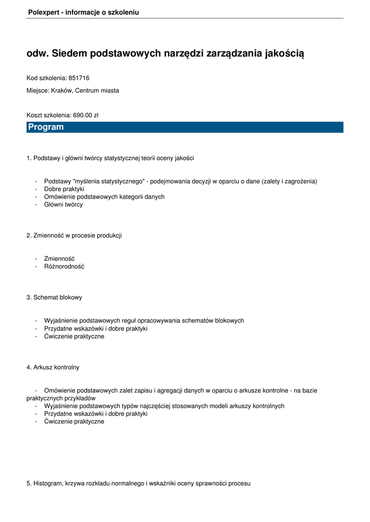 Polexpert - informacje o szkoleniu odw. Siedem podstawowych narzędzi zarządzania jakością Kod szkolenia: 851716 Miejsce: Kraków, Centrum miasta Koszt szkolenia: 690.00 zł Program 1. Podstawy i główni twórcy statystycznej teorii oceny jakości - Podstawy "myślenia statystycznego" - podejmowania decyzji w oparciu o dane (zalety i zagrożenia) Dobre praktyki Omówienie podstawowych kategorii danych Główni twórcy 2. Zmienność w procesie produkcji - Zmienność Różnorodność 3. Schemat blokowy - Wyjaśnienie podstawowych reguł opracowywania schematów blokowych Przydatne wskazówki i dobre praktyki Ćwiczenie praktyczne 4. Arkusz kontrolny - Omówienie podstawowych zalet zapisu i agregacji danych w oparciu o arkusze kontrolne - na bazie praktycznych przykładów - Wyjaśnienie podstawowych typów najczęściej stosowanych modeli arkuszy kontrolnych - Przydatne wskazówki i dobre praktyki - Ćwiczenie praktyczne 5. Histogram, krzywa rozkładu normalnego i wskaźniki oceny sprawności procesu Polexpert - informacje o szkoleniu - Wprowadzenie teoretyczne do oceny zmienności procesu - Dwa podstawowe typy/przyczyny zmienności - Wyjaśnienie podstawowych zalet oraz zasad związanych z przygotowywaniem histogramu - Przydatne wskazówki i dobre praktyki - Ćwiczenie praktyczne - Omówienie zasad interpretacji histogramu - Podstawowe metody pomiaru poziomu zmienności (podstawowe miary zmienności i położenia) - Rozkład normalny i reguła +/- 3 sigma oraz +/- 6 sigma - Podstawowe parametry oceny zmienności procesu - wyjaśnienie zasad obliczeń i interpretacji współczynnika Cp i Cpk 6. Wykres rozrzutu - Omówienie celu i zalet zastosowania wykresu rozrzutu Wyjaśnienie zasad związanych z przygotowywaniem wykresu rozrzutu Ćwiczenie praktyczne Zasady interpretacji wykresu Współczynnik korelacji Pearsona Przydatne wskazówki i dobre praktyki 7. Rybia ość - Wyjaśnienie podstawowych reguł opracowywania diagramu Przydatne wskazówki i dobre praktyki Ćwiczenie praktyczne 8. Wykres Pareto - Omówienie celu i zalet zastosowania wykresu Pareto Zasada 20/80 Wyjaśnienie podstawowych reguł opracowywania wykresu Ćwiczenie praktyczne Przydatne wskazówki i dobre praktyki Polexpert - informacje o szkoleniu 9. Wykresy kontrolne - Cel i zastosowanie Wpływ czasu na poziom i rodzaj zmienności Wyjaśnienie podstawowych reguł opracowywania wykresu Rodzaje wykresów kontrolnych Podstawowe zasady interpretacji wykresu i pojawiających się na nim sygnałów Ćwiczenie praktyczne - tworzenie wykresu XR Prowadzący