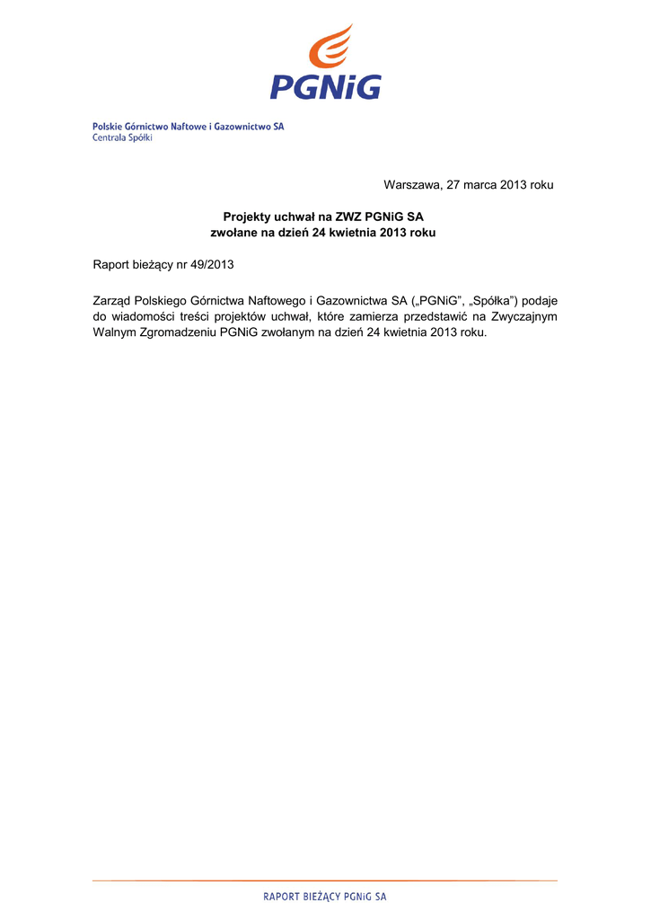 Warszawa, 27 marca 2013 roku Projekty uchwał na ZWZ PGNiG SA zwołane na dzień 24 kwietnia 2013 roku Raport bieżący nr 49/2013 Zarząd Polskiego Górnictwa Naftowego i Gazownictwa SA („PGNiG”, „Spółka”) podaje do wiadomości treści projektów uchwał, które zamierza przedstawić na Zwyczajnym Walnym Zgromadzeniu PGNiG zwołanym na dzień 24 kwietnia 2013 roku. Uchwała nr …… Zwyczajnego Walnego Zgromadzenia Spółki pod firmą Polskie Górnictwo Naftowe i Gazownictwo Spółka Akcyjna z siedzibą w Warszawie z dnia 24 kwietnia 2013 roku w sprawie: PGNiG SA. przyjęcia porządku obrad Zwyczajnego Walnego Zgromadzenia §1 Zwyczajne Walne Zgromadzenie PGNiG SA postanawia przyjąć następujący porządek obrad: 1. Otwarcie obrad Walnego Zgromadzenia, 2. Wybór Przewodniczącego Walnego Zgromadzenia, 3. Stwierdzenie prawidłowości zwołania Walnego Zgromadzenia oraz jego zdolności do podejmowania uchwał, 4. Przyjęcie porządku obrad, 5. Sporządzenie listy obecności, 6. Rozpatrzenie i zatwierdzenie sprawozdania finansowego PGNiG S.A. sporządzonego zgodnie z Międzynarodowymi Standardami Sprawozdawczości Finansowej za rok 2012 oraz sprawozdania Zarządu z działalności Spółki w 2012 roku, 7. Rozpatrzenie i zatwierdzenie skonsolidowanego sprawozdania finansowego Grupy Kapitałowej PGNiG sporządzonego zgodnie z Międzynarodowymi Standardami Sprawozdawczości Finansowej za rok 2012 oraz sprawozdania Zarządu z działalności Grupy Kapitałowej PGNiG w 2012 roku, 8. Podjęcie uchwał w sprawie udzielenia członkom Zarządu Spółki PGNiG S.A. absolutorium z wykonania obowiązków w roku 2012, 9. Podjęcie uchwał w sprawie udzielenie członkom Rady Nadzorczej PGNiG S.A. absolutorium z wykonania obowiązków w roku 2012, 10. Podjęcie uchwały w sprawie podziału zysku za rok obrotowy 2012, przeznaczenia zysku zatrzymanego z lat ubiegłych oraz ustalenia dnia dywidendy i dnia wypłaty dywidendy, 11. Podjęcie uchwały w sprawie wyrażenia zgody na objęcie przez PGNiG S.A. udziałów w podwyższonym kapitale zakładowym spółki pod firmą Operator Systemu Magazynowania Sp. z o.o. z siedziba w Dębogórzu w ramach połączenia spółki Operator Systemu Magazynowania Sp. z o.o. i spółki Investgas S.A. z siedzibą w Warszawie, 12. Podjęcie uchwały w sprawie wyrażenia zgody na objęcie udziałów w podwyższonym kapitale zakładowym PGNIG SPV 4 Sp. z o.o. z siedzibą w Warszawie, podwyższonym w związku z połączeniem PGNIG SPV 4 Sp. z o.o. ze spółkami: Karpacka Spółka Gazownictwa Sp. z o.o. z siedzibą 2 w Tarnowie, Górnośląska Spółka Gazownictwa Sp. z o.o. z siedzibą w Zabrzu, Mazowiecka Spółka Gazownictwa Sp. z o.o. z siedzibą w Warszawie, Wielkopolska Spółka Gazownictwa Sp. z o.o. z siedzibą w Poznaniu, Pomorska Spółka Gazownictwa Sp. z o.o. z siedzibą w Gdańsku, Dolnośląska Spółka Gazownictwa Sp. z o.o. z siedzibą we Wrocławiu, 13. Podjęcie uchwały w sprawie wyrażenia zgody na sprzedaż przez PGNiG S.A. w drodze przetargu ustnego (licytacji) składnika aktywów trwałych w postaci wybudowanego odcinka gazociąg wysokiego ciśnienia relacji Toruń-Lisewo DN 500 MOP 8,4 MPa o długości 36,948 km wraz z infrastrukturą towarzyszącą, 14. Podjęcie uchwały w sprawie wyrażenia zgody na sprzedaż przez PGNiG S.A. w drodze przetargu ustnego (licytacji) nieruchomości zabudowanej budynkiem biurowo - usługowym, położonej w Dzielnicy Wola m. st. Warszawy, w rejonie ulicy Kasprzaka i Bema, obejmującej działki nr ew. 6/2 i 64 z obrębu 6-04-07, 15. Zamknięcie obrad Walnego Zgromadzenia. §2 Uchwała wchodzi w życie z dniem podjęcia. 3 Uchwała nr …… Zwyczajnego Walnego Zgromadzenia Spółki pod firmą Polskie Górnictwo Naftowe i Gazownictwo Spółka Akcyjna z siedzibą w Warszawie z dnia 24 kwietnia 2013 roku w sprawie: rozpatrzenia i zatwierdzenia sprawozdania finansowego PGNiG S.A. sporządzonego za rok 2012 oraz sprawozdania Zarządu z działalności Spółki w 2012 roku. §1 Działając na podstawie § 56 ust. 1 pkt 1 Statutu Spółki, Walne Zgromadzenie Polskiego Górnictwa Naftowego i Gazownictwa S.A. postanawia zatwierdzić : 1. Sprawozdanie finansowe PGNiG S.A. sporządzone zgodnie z Międzynarodowymi Standardami Sprawozdawczości Finansowej za rok obrotowy rozpoczynający się 1 stycznia 2012 roku a kończący się 31 grudnia 2012 roku, obejmujące: rachunek zysków i strat za okres od dnia 1 stycznia 2012 roku do dnia 31 grudnia 2012 roku, wykazujący zysk netto w kwocie 1 918 milionów złotych; sprawozdanie z całkowitych dochodów za okres od dnia 1 stycznia 2012 roku do dnia 31 grudnia 2012 roku, wykazujące całkowity dochody 1 707 milionów złotych; sprawozdanie z sytuacji finansowej sporządzone na dzień 31 grudnia 2012 roku, które po stronie aktywów i pasywów wykazuje sumę 36 641 milionów złotych; sprawozdanie z przepływów pieniężnych za okres od dnia 1 stycznia 2012 roku do dnia 31 grudnia 2012 roku, wykazujące zwiększenie stanu środków pieniężnych netto o kwotę 99 milionów złotych; sprawozdanie ze zmian w kapitale własnym za okres od dnia 1 stycznia 2012 roku do dnia 31 grudnia 2012 roku, wykazujące zwiększenie kapitału własnego o kwotę 1 707 milionów złotych; informację dodatkową do sprawozdania finansowego. 2. Sprawozdanie Zarządu z działalności Spółki w 2012 roku. §2 Uchwała wchodzi w życie z dniem powzięcia. 4 Uzasadnienie: Zarząd Spółki Polskie Górnictwo Naftowe i Gazownictwo S.A. w Warszawie, działając na podstawie art. 399 § 1 Kodeksu spółek handlowych oraz § 22 ust. 2 pkt 10 Statutu Spółki PGNiG S.A. w związku z § 56 ust 1 pkt 1 Statutu Spółki PGNiG S.A. wnosi o rozpatrzenie i zatwierdzenie przez Walne Zgromadzenie PGNiG S.A. sprawozdania finansowego PGNiG S.A. sporządzonego zgodnie z Międzynarodowymi Standardami Sprawozdawczości Finansowej za rok 2012 oraz sprawozdania Zarządu z działalności Spółki w 2012 roku. Sprawozdanie PGNiG S.A.