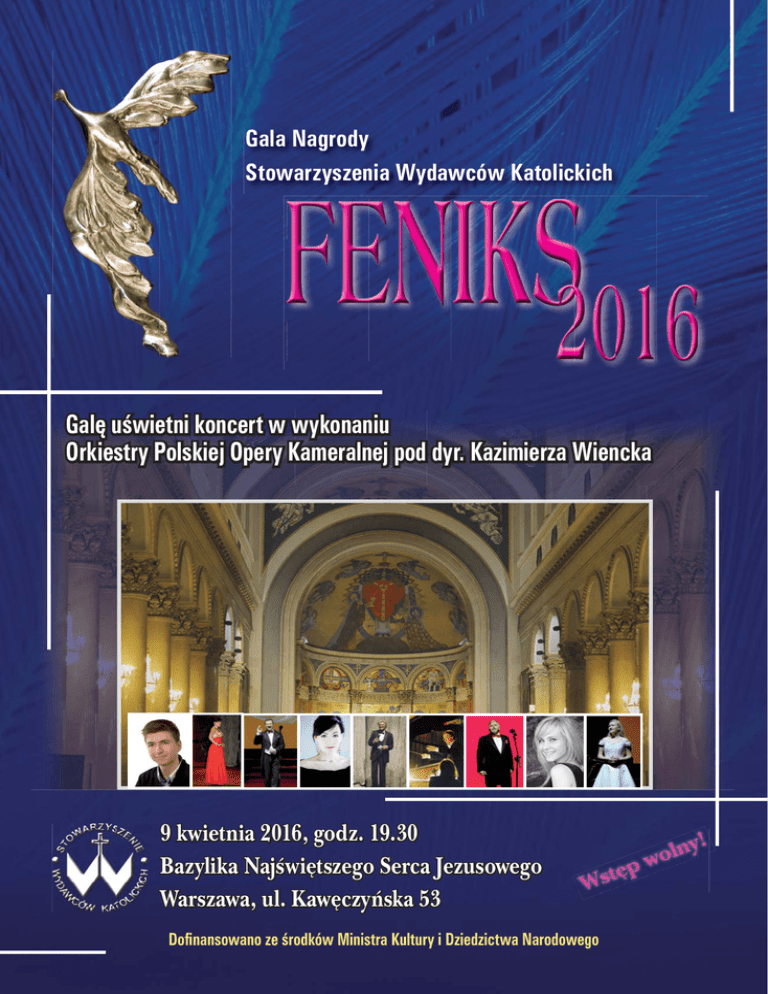 Gala Nagrody Stowarzyszenia Wydawców Katolickich Galę uświetni koncert w wykonaniu Orkiestry Polskiej Opery Kameralnej pod dyr. Kazimierza Wiencka 9 kwietnia 2016, godz. 19.30 Bazylika Najświętszego Serca Jezusowego Warszawa, ul. Kawęczyńska 53 Dofinansowano ze środków Ministra Kultury i Dziedzictwa Narodowego
