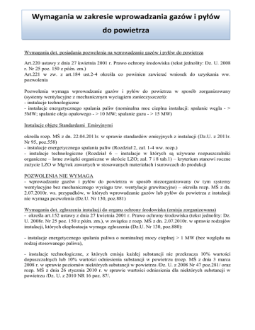 Wymagania w zakresie wprowadzania gazów i pyłów do powietrza Wymagania dot. posiadania pozwolenia na wprowadzanie gazów i pyłów do powietrza Art.220 ustawy z dnia 27 kwietnia 2001 r. Prawo ochrony środowiska (tekst jednolity: Dz. U. 2008 r. Nr 25 poz. 150 z późn. zm.) Art.221 w zw. z art.184 ust.2-4 określa co powinien zawierać wniosek do uzyskania ww. pozwolenia Pozwolenia wymaga wprowadzanie gazów i pyłów do powietrza w sposób zorganizowany (systemy wentylacyjne z mechanicznym wyciągiem zanieczyszczeń): - instalacje technologiczne - instalacje energetycznego spalania paliw (nominalna moc cieplna instalacji: spalanie węgla - > 5MW; spalanie oleju opałowego - > 10 MW; spalanie gazu - > 15 MW) Instalacje objęte Standardami Emisyjnymi określa rozp. MŚ z dn. 22.04.2011r. w sprawie standardów emisyjnych z instalacji (Dz.U. z 2011r. Nr 95, poz.558) - instalacje energetycznego spalania paliw (Rozdział 2, zał. 1-4 ww. rozp.) - instalacje technologiczne (Rozdział 6 – instalacje w których są używane rozpuszczalniki organiczne – lotne związki organiczne w skrócie LZO; zał. 7 i 8 tab.1) – kryterium stanowi roczne zużycie LZO w Mg/rok zawartych w stosowanych materiałach i surowcach do produkcji POZWOLENIA NIE WYMAGA - wprowadzanie gazów i pyłów do powietrza w sposób niezorganizowany (w tym systemy wentylacyjne bez mechanicznego wyciągu tzw. wentylacje grawitacyjne) – określa rozp. MŚ z dn. 2.07.2010r. ws. przypadków, w których wprowadzanie gazów lub pyłów do powietrza z instalacji nie wymaga pozwolenia (Dz.U. Nr 130, poz.881) Wymagania dot. zgłoszenia instalacji do organu ochrony środowiska (emisja zorganizowana) - określa art.152 ustawy z dnia 27 kwietnia 2001 r. Prawo ochrony środowiska (tekst jednolity: Dz. U. 2008r. Nr 25 poz. 150 z późn. zm.), w związku z rozp. MŚ z dn. 2.07.2010r. w sprawie rodzajów instalacji, których eksploatacja wymaga zgłoszenia (Dz.U. Nr 130, poz.880): - instalacje energetycznego spalania paliwa o nominalnej mocy cieplnej > 1 MW (bez względu na rodzaj stosowanego paliwa), - instalacje technologiczne, z których emisja każdej substancji nie przekracza 10% wartości dopuszczalnych lub 10% wartości odniesienia substancji w powietrzu (rozp. MŚ z dnia 3 marca 2008 r. w sprawie poziomów niektórych substancji w powietrzu /Dz. U. z 2008 Nr 47 poz.281/ oraz rozp. MŚ z dnia 26 stycznia 2010 r. w sprawie wartości odniesienia dla niektórych substancji w powietrzu /Dz. U. z 2010 NR 16 poz. 87/.