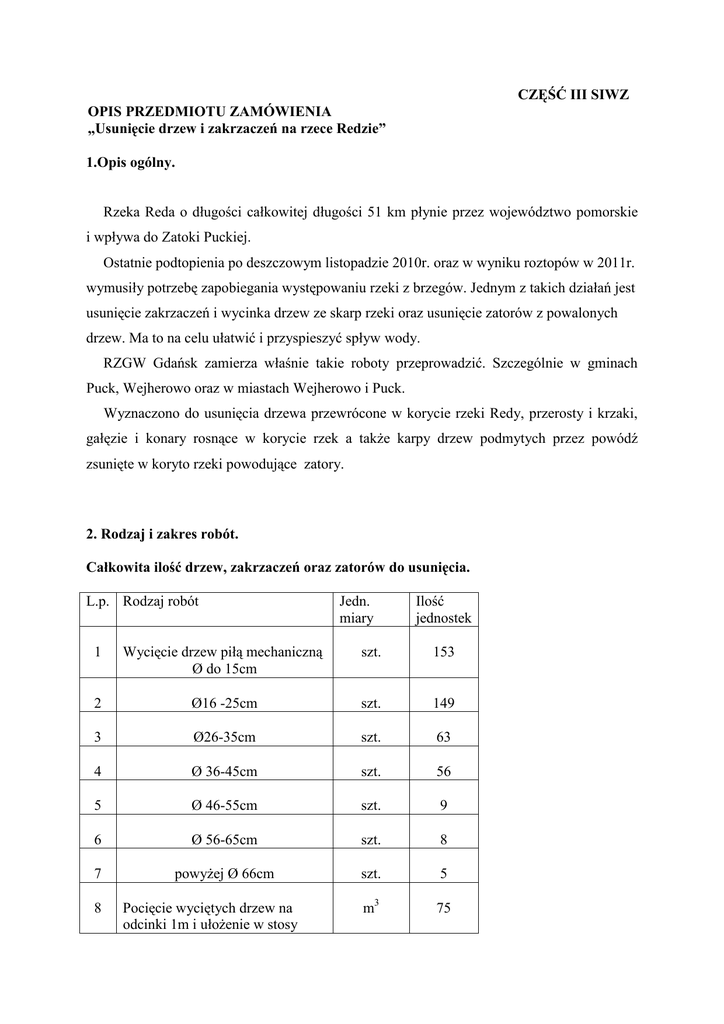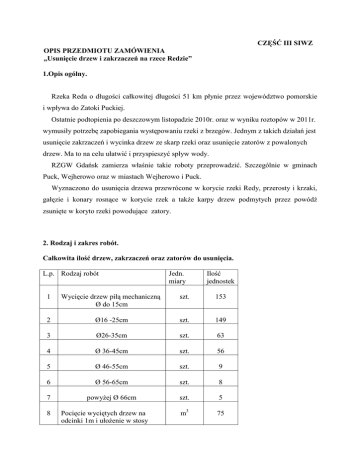 CZĘŚĆ III SIWZ OPIS PRZEDMIOTU ZAMÓWIENIA „Usunięcie drzew i zakrzaczeń na rzece Redzie” 1.Opis ogólny. Rzeka Reda o długości całkowitej długości 51 km płynie przez województwo pomorskie i wpływa do Zatoki Puckiej. Ostatnie podtopienia po deszczowym listopadzie 2010r. oraz w wyniku roztopów w 2011r. wymusiły potrzebę zapobiegania występowaniu rzeki z brzegów. Jednym z takich działań jest usunięcie zakrzaczeń i wycinka drzew ze skarp rzeki oraz usunięcie zatorów z powalonych drzew. Ma to na celu ułatwić i przyspieszyć spływ wody. RZGW Gdańsk zamierza właśnie takie roboty przeprowadzić. Szczególnie w gminach Puck, Wejherowo oraz w miastach Wejherowo i Puck. Wyznaczono do usunięcia drzewa przewrócone w korycie rzeki Redy, przerosty i krzaki, gałęzie i konary rosnące w korycie rzek a także karpy drzew podmytych przez powódź zsunięte w koryto rzeki powodujące zatory. 2. Rodzaj i zakres robót. Całkowita ilość drzew, zakrzaczeń oraz zatorów do usunięcia. L.p. Rodzaj robót Jedn. miary Ilość jednostek 1 Wycięcie drzew piłą mechaniczną Ø do 15cm szt. 153 2 Ø16 -25cm szt. 149 3 Ø26-35cm szt. 63 4 Ø 36-45cm szt. 56 5 Ø 46-55cm szt. 9 6 Ø 56-65cm szt. 8 7 powyżej Ø 66cm szt. 5 m3 75 8 Pocięcie wyciętych drzew na odcinki 1m i ułożenie w stosy 9 10 11 12 13 Utylizacja gałęzi Utylizacja wyciętych uprzednio krzaków z powierzchni Oczyszczenie terenu z pozostałości po wycince krzaków, odrostów i przerostów Karczowanie, usuwanie starych pni z koryta rzeki i ich utylizacja Usunięcie zatorów i wywrotów drzew z wyciąganiem nagromadzonego materiału z pod wody z utrudnionym dostępem z lądu i utylizacja mp 2 260 m2 5 542 m2 6 550 lokalizacja 47 lokalizacja 31 Podane przedmiary traktować jako pomocne do obliczenia wartości robót, którą zamawiający będzie traktował jako ryczałtową. 3.Lokalizacja Lokalizacja orientacyjna znajduje się na załączonych mapkach. Dokładną lokalizację wycinki wskaże przedstawiciel RZGW Gdańsk Pan Tomasz Tobieński tel.58 308 05 17, kom. 506 12 95 88 4. Warunki wykonania robót Wycięte drzewa i wydobyte z zatorów należy pociąć na odcinki 1m i złożyć w stosy. Krzaki, gałęzie, wykarczowane pnie – należy zutylizować Pozyskane w ten sposób drewno Wykonawca może zakupić po cenach: - 42,00 zł/mp -liściaste miękkie (topola, wierzba, lipa) -liściaste pozostałych gatunków drzew(brzoza, olcha ,dąb ,jesion, wiąz, akacja )- 50,00 zł/mp -iglaste wszystkich gatunków - 42,00 zł/mp Zamawiający nie zapewnia dróg dojazdowych. Wszelkie szkody powstałe w wyniku robót usuwa Wykonawca. 5.Załączniki: Mapki poglądowe z lokalizacją wycinki – 4 kpl. Przedmiary- Nr 1-4(wycinka drzew) Przedmiar robót Nr 1 Ilość drzew i zakrzaczeń do wycinki, zatorów do likwidacji oraz karp drzew do usunięcia z koryta rzeki REDY km 16+250-20 +500 miasto Wejherowo L.p. Rodzaj robót 1 Jedn. miary Ilość jednostek Wycięcie drzew piłą mechaniczną szt. 12 Ø do 15cm 2 Ø16 -25cm szt. 22 3 Ø26-35cm szt. 3 4 Ø 36-45cm szt. 3 5 Ø 46-55cm szt. 1 6 Ø 56-65cm szt. 2 powyżej Ø 66cm Pocięcie wyciętych drzew na odcinki 1m i ułożenie w stosy szt. 3 m3 15 Utylizacja gałęzi Wycięcie i utylizacja krzaków z powierzchni ….. Oczyszczenie terenu z pozostałości po wycince krzaków, odrostów i przerostów Karczowanie, usuwanie starych pni z koryta rzeki i utylizacja Usunięcie zatorów i wywrotów drzew z wyciąganiem nagromadzonego materiału z pod wody z utrudnionym dostępem z lądu i utylizacja mp 700 m2 4 530 m2 4 500 lokalizacja 10 lokalizacja 1 7 8 9 10 11 12 13 Przedmiar Nr 2 Ilość drzew i zakrzaczeń do wycinki, zatorów do likwidacji oraz karp drzew do usunięcia z koryta rzeki REDY km 8+230-9+400-, 10+250-15+750 miasto Reda L.p. Rodzaj robót 1 Jedn. miary Ilość jednostek Wycięcie drzew piłą mechaniczną Ø do 15cm szt. 93 2 Ø16 -25cm szt. 92 3 Ø26-35cm szt. 40 4 Ø 36-45cm szt. 19 5 Ø 46-55cm szt. 5 6 Ø 56-65cm szt. 2 szt. 2 m3 38 mp 930 m2 619 m2 1 200 lokalizacja 11 lokalizacja 16 powyżej Ø 66cm 7 8 9 10 11 12 13 Pocięcie wyciętych drzew na odcinki 1m i ułożenie w stosy Utylizacja gałęzi Wycięcie i utylizacja krzaków z powierzchni ….. Oczyszczenie terenu z pozostałości po wycince krzaków, odrostów i przerostów Karczowanie, usuwanie starych pni z koryta rzeki i utylizacja Usunięcie zatorów i wywrotów drzew z wyciąganiem nagromadzonego materiału z pod wody z utrudnionym dostępem z lądu i utylizacja Przedmiar Nr 3 Ilość drzew i zakrzaczeń do wycinki, zatorów do likwidacji oraz karp drzew do usunięcia z koryta rzeki REDY km 4+730-6+700 gmina Puck L.p. Rodzaj robót 1 Jedn. miary Ilość jednostek Wycięcie drzew piłą mechaniczną Ø do 15cm szt. 45 2 Ø16 -25cm szt. 35 3 Ø26-35cm szt. 11 4 Ø 36-45cm szt. 1 5 Ø 46-55cm szt. 3 6 Ø 56-65cm szt. 0 szt. 0 m3 12 mp 420 m2 178 m2 600 lokalizacja 7 lokalizacja 11 powyżej Ø 66cm 7 8 9 10 11 12 13 Pocięcie wyciętych drzew na odcinki 1m i ułożenie w stosy Utylizacja gałęzi Wycięcie i utylizacja krzaków z powierzchni ….. Oczyszczenie terenu z pozostałości po wycince krzaków, odrostów i przerostów Karczowanie, usuwanie starych pni z koryta rzeki i utylizacja Usunięcie zatorów i wywrotów drzew z wyciąganiem nagromadzonego materiału z pod wody z utrudnionym dostępem z lądu i utylizacja Przedmiar Nr 4 Ilość drzew i zakrzaczeń do wycinki, zatorów do likwidacji oraz karp drzew do usunięcia z koryta rzeki REDY km 26+250 - 31+350 gmina Wejherowo L.p. Rodzaj robót Jedn. Ilość miary jednostek 1 Wycięcie drzew piłą mechaniczną Ø do 15cm szt. 3 2 Ø16 -25cm szt. 0 3 Ø26-35cm szt. 9 4 Ø 36-45cm szt. 33 5 Ø 46-55cm szt. 0 6 Ø 56-65cm powyżej Ø 66cm szt. 2 szt. 0 m3 10 mp 210 m2 215 m2 250 lokalizacja 19 lokalizacja 3 7 8 9 10 11 12 13 Pocięcie wyciętych drzew na odcinki 1m i ułożenie w stosy Utylizacja gałęzi Wycięcie i utylizacja krzaków z powierzchni 