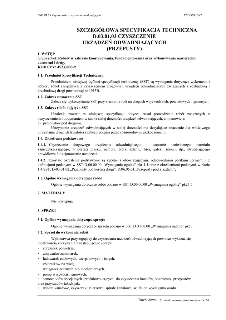 D.03.01.03. Czyszczenie urządzeń odwadniających PPI PROJEKT SZCZEGÓŁOWA SPECYFIKACJA TECHNICZNA D.03.01.03 CZYSZCZENIE URZĄDZEŃ ODWADNIAJĄCYCH (PRZEPUSTY) 1. WSTĘP Grupa robót: Roboty w zakresie konstruowania, fundamentowania oraz wykonywania nawierzchni autostrad i dróg. KOD CPV: 45233000-9 1.1. Przedmiot Specyfikacji Technicznej. Przedmiotem niniejszej ogólnej specyfikacji technicznej (SST) są wymagania dotyczące wykonania i odbioru robót związanych z czyszczeniem drogowych urządzeń odwadniających związanych z rozbudową i przebudową drogi powiatowej nr 1915B. 1.2. Zakres stosowania SST Zaleca się wykorzystanie SST przy zlecaniu robót na drogach wojewódzkich, powiatowych i gminnych. 1.3. Zakres robót objętych SST Ustalenia zawarte w niniejszej specyfikacji dotyczą zasad prowadzenia robót związanych z oczyszczeniem i utrzymaniem w stanie stałej drożności urządzeń odwadniających, a mianowicie: a) przepustów pod drogami, Utrzymanie urządzeń odwadniających w stałej drożności ma decydujące znaczenie dla właściwego utrzymania dróg, ich trwałości i zabezpieczenia przed różnorodnymi uszkodzeniami. 1.4. Określenia podstawowe 1.4.1. Czyszczenie drogowego urządzenia odwadniającego - usuwanie naniesionego materiału zanieczyszczającego, w postaci piasku, namułu, błota, szlamu, liści, gałęzi, śmieci, itp., utrudniającego prawidłowe funkcjonowanie urządzenia. 1.4.2. Pozostałe określenia podstawowe są zgodne z obowiązującymi, odpowiednimi polskimi normami i z definicjami podanymi w SST D.00.00.00 „Wymagania ogólne” pkt 1.4 oraz z określeniami podanymi w pkcie 1.4 SST: D-03.01.02 „Przepusty pod koroną drogi”, D.06.05.01.„Przepusty pod zjazdami”, 1.5. Ogólne wymagania dotyczące robót Ogólne wymagania dotyczące robót podano w SST D.00.00.00 „Wymagania ogólne” pkt 1.5. 2. MATERIAŁY Nie występują. 3. SPRZĘT 3.1. Ogólne wymagania dotyczące sprzętu Ogólne wymagania dotyczące sprzętu podano w SST D.00.00.00 „Wymagania ogólne” pkt 3. 3.2. Sprzęt do wykonania robót Wykonawca przystępujący do czyszczenia urządzeń odwadniających powinien wykazać się możliwością korzystania z następującego sprzętu: - sprężarek powietrza, - zmywarko-zamiatarek, - ładowarek czołowych, czerpakowych i innych, - zbiorników na wodę, - wciągarek ręcznych lub mechanicznych, - pomp wysokociśnieniowych, - samochodów specjalnych próżniowo-ssących do czyszczenia kanałów, studzienek, przepustów, oraz przyrządów takich jak: - wiadra kanałowe, czyszczaki talerzowe, spirale kanałowe, szufle do wyciągania osadu Rozbudowa i przebudowa drogi powiatowej nr 1915B. D.03.01.03. Czyszczenie urządzeń odwadniających PPI PROJEKT z osadników itp., bądź innego sprzętu zaakceptowanego przez Inżyniera. Preferuje się użycie sprzętu nie sprzyjającego powstawaniu kurzu, jak zmywarko-zamiatarek oraz szczotek wyposażonych w pochłaniacze pyłów. 4. TRANSPORT 4.1. Ogólne wymagania dotyczące transportu Ogólne wymagania dotyczące transportu podano w SST D.00.00.00 „Wymagania ogólne” pkt 4. 4.2. Środki transportu Do wywiezienia zebranych zanieczyszczeń Wykonawca użyje środków transportowych spełniających wymagania określone w pkcie 5. 5. WYKONANIE ROBÓT 5.1. Ogólne zasady wykonania robót Ogólne zasady wykonania robót podano w SST D.00.00.00 „Wymagania ogólne” pkt 5. 5.2. Oczyszczenie przepustów pod drogami. Wloty i wyloty przepustów pod drogami i zjazdami należy oczyścić z namułu, roślinności, liści lub innych zanieczyszczeń utrudniających spływ wody, ręcznie, za pomocą łopat, szpadli, siekier itp. Drożność przewodów rurowych należy zapewnić przy użyciu sprzętu wymienionego w pkt 5.5. Zebrane zanieczyszczenia powinny być wywiezione dowolnym środkiem transportu na składowisko odpadów. 5.3. Składowiska odpadów Wywożenie zanieczyszczeń należy dokonywać na składowiska odpadów, zlokalizowane na: - wysypiskach publicznych (np. gminnych, miejskich), - składowiskach własnych, urządzonych zgodnie z warunkami i decyzjami wydanymi przez właściwe władze ochrony środowiska. Sposób i miejsce wywozu zanieczyszczeń powinny być określone w SST i zaakceptowane przez Inżyniera. Jeśli Inżynier zezwoli na czasowe krótkotrwałe składowanie zanieczyszczeń w pobliżu oczyszczonych urządzeń odwadniających, to miejsce składowania należy wybrać w taki sposób, aby spływy deszczowe nie mogły przemieszczać zanieczyszczeń z powrotem do miejsc, z których je pobrano lub wprowadzać nieczystości do wód gruntowych i powierzchniowych. 6. KONTROLA JAKOŚCI ROBÓT 6.1. Ogólne zasady kontroli jakości robót Ogólne zasady kontroli jakości robót podano w SST D.00.00.00 „Wymagania ogólne” pkt 6. 6.2. Kontrola w czasie wykonywania robót W czasie wykonywania robót należy przeprowadzać ciągłą kontrolę poprawności oczyszczania urządzeń odwadniających, zgodnie z wymaganiami pktu 5. 7. OBMIAR ROBÓT 7.1. Ogólne zasady obmiaru robót Ogólne zasady obmiaru robót podano w SST D.00.00.00 „Wymagania ogólne” pkt 7. 7.2. Jednostka obmiarowa Jednostką obmiarową oczyszczenia poszczególnych urządzeń odwadniających jest dla oczyszczenia: a) przepustów - m (metr), 8. ODBIÓR ROBÓT Ogólne zasady odbioru robót podano w SST D.00.00.00 „Wymagania ogólne” pkt 8. Roboty uznaje się za wykonane zgodnie z dokumentacją projektową, SST i wymaganiami Inżyniera, Rozbudowa i przebudowa drogi powiatowej nr 1915B. D.03.01.03. Czyszczenie urządzeń odwadniających PPI PROJEKT jeśli wszystkie pomiary i badania z zachowaniem tolerancji według punktu 6 dały wyniki pozytywne. 9. PODSTAWA PŁATNOŚCI 9.1. Ogólne ustalenia dotyczące podstawy płatności Ogólne ustalenia dotyczące podstawy płatności podano w OST D.00.00.00 „Wymagania ogólne” pkt 9. 9.2. Cena jednostki obmiarowej - Cena jednostki obmiarowej (1 m) obejmuje: prace pomiarowe i r