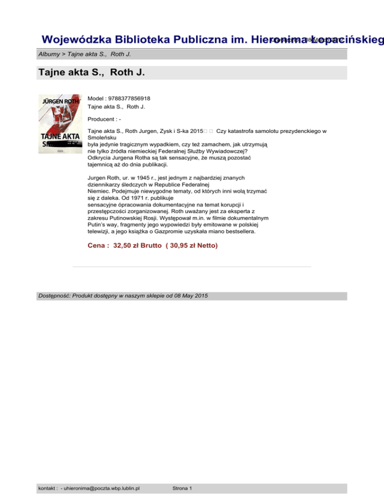 Utworzono : 08Łopacińskieg March 2017 Wojewódzka Biblioteka Publiczna im. Hieronima Albumy > Tajne akta S., Roth J. Tajne akta S., Roth J. Model : 9788377856918 Tajne akta S., Roth J. Producent : Tajne akta S., Roth Jurgen, Zysk i S-ka 2015�� Czy katastrofa samolotu prezydenckiego w Smoleńsku była jedynie tragicznym wypadkiem, czy też zamachem, jak utrzymują nie tylko źródła niemieckiej Federalnej Służby Wywiadowczej? Odkrycia Jurgena Rotha są tak sensacyjne, że muszą pozostać tajemnicą aż do dnia publikacji. Jurgen Roth, ur. w 1945 r., jest jednym z najbardziej znanych dziennikarzy śledczych w Republice Federalnej Niemiec. Podejmuje niewygodne tematy, od których inni wolą trzymać się z daleka. Od 1971 r. publikuje sensacyjne ópracowania dokumentacyjne na temat korupcji i przestępczości zorganizowanej. Roth uważany jest za eksperta z zakresu Putinowskiej Rosji. Występował m.in. w filmie dokumentalnym Putin’s way, fragmenty jego wypowiedzi były emitowane w polskiej telewizji, a jego książka o Gazpromie uzyskała miano bestsellera. Cena : 32,50 zł Brutto ( 30,95 zł Netto) Dostępność: Produkt dostępny w naszym sklepie od 08 May 2015 kontakt : - [email protected] Strona 1