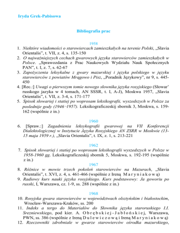Iryda Grek-Pabisowa Bibliografia prac 1958 1. Niektóre wiadomości o starowiercach zamieszkałych na terenie Polski, „Slavia Orientalis”, t. VII, z. 4, s. 135-150 2. O najważniejszych cechach gwarowych języka starowierców zamieszkałych w Polsce. „Sprawozdania z Prac Naukowych Wydziału Nauk Społecznych PAN”, t. I, z. 7, s. 62-67 3. Zapożyczenia leksykalne z gwary mazurskiej i języka polskiego w języku starowierców z powiatów Mrągowo i Pisz, „Poradnik Językowy”, nr 9, s. 445450 4. [Rec.:] Uwagi o pierwszym tomie nowego słownika języka rosyjskiego (Słowar’ russkogo jazyka w 4 tomach, AN SSSR, t. I, A-J), Moskwa 1957, „Slavia Orientalis”, t. VII, z. 3-4, s. 171-177 5. Spisok słowariej i statiej po woprosam leksikografii, wyszedszych w Polsze za poslednije gody (1946-1957). Leksikograficzeskij sbornik 3, Moskwa, s. 159162 (wspólnie z in.) 1960 6. [Spraw.:] Zagadnienia leksykografii gwarowej na VII Konferencji Dialektologicznej w Instytucie Języka Rosyjskiego AN ZSRR w Moskwie (1315 maja 1959 r.), „Slavia Orientalis”, t. IX, z. 1, s. 213-221 1962 7. Spisok słowariej i statiej po woprosam leksikografii wyszedszych w Polsze w 1958-1960 gg. Leksikograficzeskij sbornik 5, Moskwa, s. 192-195 (wspólnie z in.) 1967 8. Różnice w mowie trzech pokoleń starowierców na Mazurach, „Slavia Orientalis”, t. XVI, z. 4, s. 461-466 (wspólnie z Ireną M a r y n i a k o w ą) 9. Radiowy kurs nauki języka rosyjskiego. Kurs podstawowy: Ja goworiu po russki, I, Warszawa, cz. 1-9, ss. 288 (wspólnie z in.) 1968 10. Rosyjska gwara starowierców w województwach olsztyńskim i białostockim, Wrocław-Warszawa-Kraków, ss. 200 11. Indeks a tergo do Materiałów do Słownika języka staroruskiego I.I. Srezniewskiego, pod kier. A. O b r ę b s k i e j - J a b ł o ń s k i e j, Warszawa, PWN, ss. 386 (wspólnie z Ireną D u l e w i c z o w ą i Ireną M a r y n i a k o w ą) 12. Rzeczowniki zdrobniale w gwarze starowierców ośrodka mazurskiego, „Slavia Orientalis”, t. XVII, z. 3, s. 305-309 (wspólnie z Ireną M a r y n i a k o w ą) 13. Radiowy kurs nauki języka rosyjskiego. Kurs podstawowy: Ja goworiu po russki, II, Warszawa, cz. 1-9, ss. 288 (wspólnie z in.) 14. Radiowy kurs nauki języka rosyjskiego. Kurs podstawowy: Ja goworiu po russki, III, Warszawa, cz. 1-9, ss. 288 (wspólnie z in.) 1969 15. Radiowy kurs nauki języka rosyjskiego. Kurs dla zaawansowanych: Słuszajtie nas po czetwiergam, Warszawa, cz. 1-9, ss. 288 (wspólnie z in.) 1970 16. Wielki słownik rosyjsko-polski, t. I-II, Warszawa-Moskwa 1970, Wiedza Powszechna, ss. 1456 (współautorzy Irena Dulewiczowa, Irena Maryniakowa, Anatol Mirowicz); wyd. III rozszerzone i poprawione 1986, wydania dalsze IV-VIII w latach 1990-2004, Wiedza Powszechna, Warszawa. 1971 17. Radiowy kurs nauki języka rosyjskiego. Kurs dla średniozaawansowanych: Słuszajtie nas - goworitie s nami, Warszawa, cz. 1-9, ss. 576 (wspólnie z in.) 18. [Spraw.:] Konferencja leksykologiczno-leksykograficzna w Czechosłowacji, „Slavia Orientalis”, t. XX, z. 1, s. 107-108 1972 19. O tendencjach rozwoju gwary starowierców w Bułgarii, „Studia z Filologii Polskiej i Słowiańskiej”, Warszawa, t. XII, s. 221-232 20. Gwary rosyjskie w województwie białostockim, [w:] Teksty gwarowe z Białostocczyzny z komentarzem językowym, Warszawa, s. 113-131 (wspólnie z Ireną M a r y n i a k o w ą) 21. O pracy nad słownikiem gwary starowierców w Polsce, „Slavia Orientalis”, t. XXI, z. 3, s. 323-329 (wspólnie z Ireną M a r y n i a k o w ą) 22. Rosyjski w radiu. Kurs średni: Ja gotow rasskazat’ tiebie, Warszawa, cz. 1-9, ss. 576 (wspólnie z Eustachym Ł a p s k i m ) 1973 23. Rosyjski w radiu. Kurs dla zaawansowanych: Prigłaszajem w SSSR, Warszawa, cz 1-9, ss. 576 (wspólnie z in.) 24. Rosyjski w radiu. Kurs dla zaawansowanych: Słuszajtie nas - goworitie s nami, Warszawa, cz. 1-9, ss. 288 (wspólnie z in.) 25. Materiały pomocnicze do nauki języka rosyjskiego, rok 1. Dialogi i ćwiczenia oparte na radiowym kursie języka rosyjskiego dla początkujących: Pierwyje szagi [płyty i teksty] (wspólnie z in.) 26. Odbicie struktury słowotwórczej systemu leksykalnego języka wyjściowego w słownikach dwujęzycznych, [w:] Słowo a słownik. Zbornik referatow z lexikologicko-lexikografickej konferencie v Smolenicach (4-7 maja 1970), Bratislava, s. 107-111 (wspólnie z in.) 27. [Rec.:] Obrazowanie siewiernorusskogo narieczija i sriedniewielikorusskich goworow. Po matieriałam lingwisticzeskoj gieografii, Moskwa 1970, ss. 455; „Slavia Orientalis”, t. XXII, z. 1, s. 113-114 1974 28. Russkije staroobriadcy w Polsze i ich gowor, [w:] Dialektołogiczeskij sborniik. (Materiały IV dialektołogiczeskoj konfieriencyi po izuczeniju goworow w Pribałtikie. Oktiabr’ 1972), Vilnius, s. 37-45 (wspólnie z Ireną M a r y n i a k o w ą) 29. Rosyjski w radiu. Kurs podstawowy: W krugu druziej, Warszawa, cz. 1-9, ss. 576 (wspólnie z in.) 1975 30. [Rec.:] S t y p u ł a Ryszard, Słownik przysłów rosyjsko-polski i polskorosyjski, Warszawa 1974, ss. 560, „Slavia Orientalis”, t. XXIV, z. 1, s. 116118 31. [Rec.:] A v a n e s o v Ruben I., Russkoje litieraturnoje proiznoszenije, Moskwa 1972, „Slavia Orientalis”, t. XXIV, z. 2, s. 238-241 32. 33. 34. 35. 1976 Gwara starowierców a pólnocno-wschodnie gwary białoruskie. Cechy fonetyczne, „Acta Baltico-Slavica”, t. IX, s. 211-218 Odbicie dawnej rosyjsko-białoruskiej interferencji językowej w gwarze staroobrzędowców w Polsce, [w:] Języki i literatury wschodniosłowiańskie. Materiały Ogólnopolskiej Konferencji Naukowej, Łódź, s. 51-57 Kursy russkogo jazyka po radio dla polakow, [w:] III Kongriess MAPRJAŁ. Tiezisy dokładow i soobszczenij, Warszawa, s. 49 Rosyjski w radiu. Kurs dla zaawansowanych: ludi, sobytija, wriemia, Warszawa, cz. 1-9, ss. 576 (wspólnie z in.) 1977 36. Rosyjski w radiu. Kurs dla zaawansowanych: Cziełowiek i mir, Warszawa, cz. 1-9, ss. 576 (wspólnie z i
