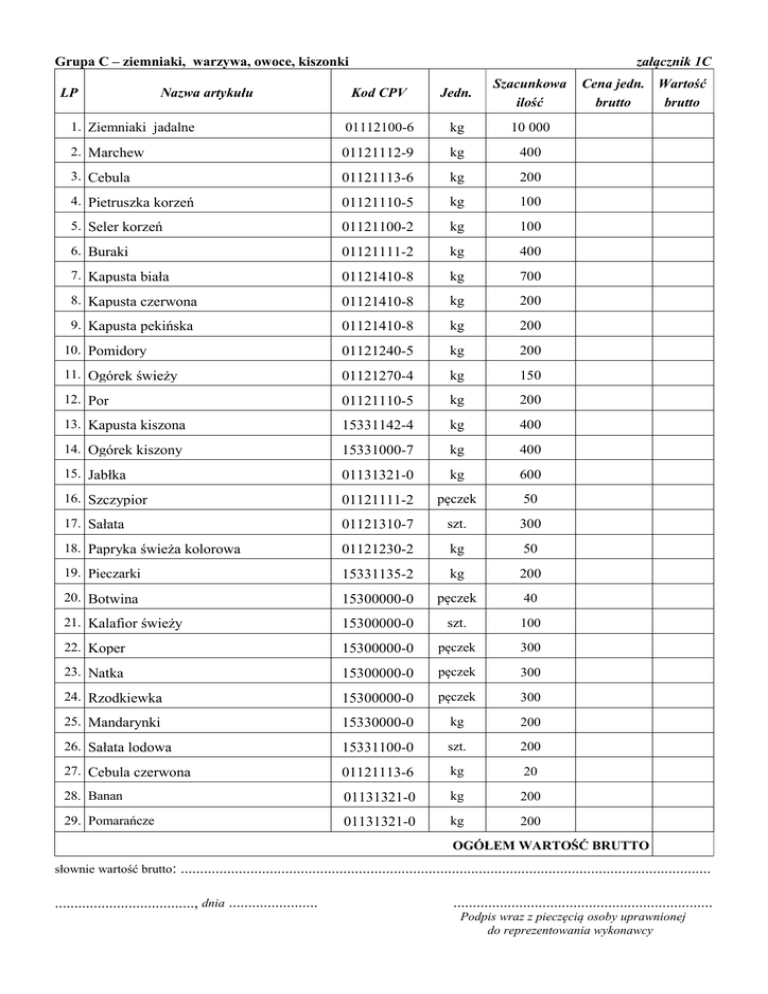Grupa C – ziemniaki, warzywa, owoce, kiszonki załącznik 1C Kod CPV Jedn. Szacunkowa ilość 1. Ziemniaki jadalne 01112100-6 kg 10 000 2. Marchew 01121112-9 kg 400 3. Cebula 01121113-6 kg 200 4. Pietruszka korzeń 01121110-5 kg 100 5. Seler korzeń 01121100-2 kg 100 6. Buraki 01121111-2 kg 400 7. Kapusta biała 01121410-8 kg 700 8. Kapusta czerwona 01121410-8 kg 200 9. Kapusta pekińska 01121410-8 kg 200 10. Pomidory 01121240-5 kg 200 11. Ogórek świeży 01121270-4 kg 150 12. Por 01121110-5 kg 200 13. Kapusta kiszona 15331142-4 kg 400 14. Ogórek kiszony 15331000-7 kg 400 15. Jabłka 01131321-0 kg 600 16. Szczypior 01121111-2 pęczek 50 17. Sałata 01121310-7 szt. 300 18. Papryka świeża kolorowa 01121230-2 kg 50 19. Pieczarki 15331135-2 kg 200 20. Botwina 15300000-0 pęczek 40 21. Kalafior świeży 15300000-0 szt. 100 22. Koper 15300000-0 pęczek 300 23. Natka 15300000-0 pęczek 300 24. Rzodkiewka 15300000-0 pęczek 300 25. Mandarynki 15330000-0 kg 200 26. Sałata lodowa 15331100-0 szt. 200 27. Cebula czerwona 01121113-6 kg 20 28. Banan 01131321-0 kg 200 29. Pomarańcze 01131321-0 kg 200 LP Nazwa artykułu Cena jedn. Wartość brutto brutto OGÓŁEM WARTOŚĆ BRUTTO słownie wartość brutto: ......................................................................................................................................... ...................................., dnia ....................... ................................................................... Podpis wraz z pieczęcią osoby uprawnionej do reprezentowania wykonawcy