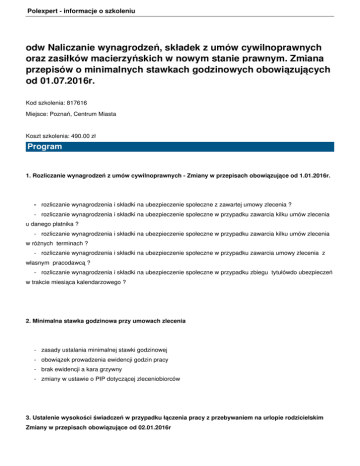 Polexpert - informacje o szkoleniu odw Naliczanie wynagrodzeń, składek z umów cywilnoprawnych oraz zasiłków macierzyńskich w nowym stanie prawnym. Zmiana przepisów o minimalnych stawkach godzinowych obowiązujących od 01.07.2016r. Kod szkolenia: 817616 Miejsce: Poznań, Centrum Miasta Koszt szkolenia: 490.00 zł Program 1. Rozliczanie wynagrodzeń z umów cywilnoprawnych - Zmiany w przepisach obowiązujące od 1.01.2016r. - rozliczanie wynagrodzenia i składki na ubezpieczenie społeczne z zawartej umowy zlecenia ? - rozliczanie wynagrodzenia i składki na ubezpieczenie społeczne w przypadku zawarcia kilku umów zlecenia u danego płatnika ? - rozliczanie wynagrodzenia i składki na ubezpieczenie społeczne w przypadku zawarcia kilku umów zlecenia w różnych terminach ? - rozliczanie wynagrodzenia i składki na ubezpieczenie społeczne w przypadku zawarcia umowy zlecenia z własnym pracodawcą ? - rozliczanie wynagrodzenia i składki na ubezpieczenie społeczne w przypadku zbiegu tytułówdo ubezpieczeń w trakcie miesiąca kalendarzowego ? 2. Minimalna stawka godzinowa przy umowach zlecenia - zasady ustalania minimalnej stawki godzinowej - obowiązek prowadzenia ewidencji godzin pracy - brak ewidencji a kara grzywny - zmiany w ustawie o PIP dotyczącej zleceniobiorców 3. Ustalenie wysokości świadczeń w przypadku łączenia pracy z przebywaniem na urlopie rodzicielskim Zmiany w przepisach obowiązujące od 02.01.2016r Polexpert - informacje o szkoleniu - ustalanie wysokości wynagrodzenia za pracę w przypadku łączenia wykonywania pracy z przebywaniem na urlopie rodzicielskim - ustalanie dziennej stawki zasiłku macierzyńskiego w przypadku łączenia wykonywania pracy z przebywaniem na urlopie rodzicielskim - ustalanie wynagrodzenia w przypadku, kiedy w okresie świadczonej pracy łączonej z przebywaniem na urlopie rodzicielskim pracownik choruje lub przebywa na urlopie wypoczynkowym 4. Procentowy podział zasiłku macierzyńskiego w przypadku podziału urlopu rodzicielskiego na części Zmiany w przepisach obowiązujące od 02.01.2016r - ustalanie wysokości procentowej zasiłku macierzyńskiego w przypadku, kiedy rodzicie rozpoczynają urlop rodzicielski w tym samym terminie - ustalanie wysokości procentowej zasiłku macierzyńskiego w przypadku, kiedy rodzice rozpoczynają urlop rodzicielski w innych terminach 5. Wyrównanie zasiłku macierzyńskiego do wysokości świadczenia rodzicielskiego Zmiany w przepisach obowiązujące od 02.01.2016r. - ustalanie wysokości wyrównania zasiłku macierzyńskiego do wysokości świadczenia rodzicielskiego dla pracownika zatrudnionego na część etatu - ustalanie wysokości wyrównania zasiłku macierzyńskiego do wysokości świadczenia rodzicielskiego dla pracownika przez część miesiąca 6. Rozliczanie wynagrodzeń ze stosunku pracy - Zmiany w przepisach obowiązujące od 22.02.2016r. a) Rozliczanie wynagrodzenia w przypadku: - zwolnienia pracownika z obowiązku świadczenia pracy w okresie wypowiedzenia - wykorzystania opieki nad dzieckiem w wymiarze godzinowym - wykorzystania przez pracownicę przerwy na karmienie dziecka piersią - zwolnienia pracownicy w ciąży z obowiązku świadczenia pracy Polexpert - informacje o szkoleniu b) Rozliczanie wynagrodzenia w przypadku: - zwolnienia pracownika na czas przeprowadzania badań lekarskich - zwolnienia pracownika tytułem urlopu okolicznościowego - zwolnienia pracownika na czas poszukiwania pracy w okresie wypowiedzenia c) Rozliczanie wynagrodzenia w przypadku udziału pracownika w szkoleniu BHP d) Rozliczanie wynagrodzenia pracownika w przypadku przestoju 7. Rozliczenie wynagrodzenia za część miesiąca - Najnowsze interpretacje MPiPS i PIP z 2015r. - wysokość wynagrodzenia należna pracownikowi zatrudnionemu, zwolnionemu w trakcie miesiąca kalendarzowego - rozliczenie wynagrodzenia pracownika, który w trakcie miesiąca został zatrudniony, złożył ZUS ZLA i przez kilka dni przebywał na urlopie wypoczynkowym - rozliczenie wynagrodzenia pracownika w sytuacji, gdy zwolnienie lekarskie obejmuje tylko dni wolne od pracy - rozliczenie wynagrodzenia pracownika w sytuacji, gdy zwolnienie lekarskie obejmuje tylko dni robocze - rozliczenie wynagrodzenia pracownika w sytuacji, gdy przepracował on 1 dzień w przypadku choroby trwającej 30 dni - czy pracownikowi, który przebywał na zwolnieniu lekarskim przez wszystkie 28 dni lutego należy się wynagrodzenie? - sposoby ustalenia wysokości wynagrodzenia w przypadku łączenia pracy z przebywaniem na dodatkowym urlopie macierzyńskim i urlopie rodzicielskim Prowadzący