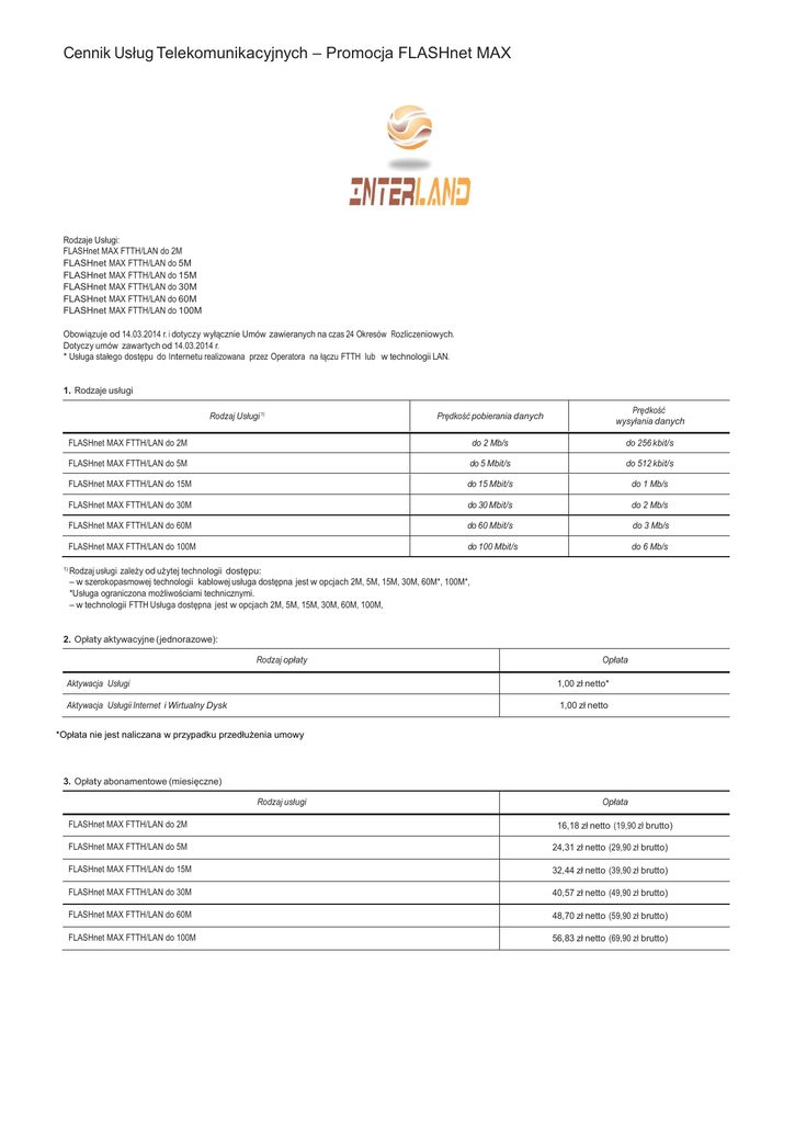 Cennik Usług Telekomunikacyjnych – Promocja FLASHnet MAX Rodzaje Usługi: FLASHnet MAX FTTH/LAN do 2M FLASHnet MAX FTTH/LAN do 5M FLASHnet MAX FTTH/LAN do 15M FLASHnet MAX FTTH/LAN do 30M FLASHnet MAX FTTH/LAN do 60M FLASHnet MAX FTTH/LAN do 100M Obowiązuje od 14.03.2014 r. i dotyczy wyłącznie Umów zawieranych na czas 24 Okresów Rozliczeniowych. Dotyczy umów zawartych od 14.03.2014 r. * Usługa stałego dostępu do Internetu realizowana przez Operatora na łączu FTTH lub w technologii LAN. 1. Rodzaje usługi Prędkość pobierania danych Prędkość wysyłania danych FLASHnet MAX FTTH/LAN do 2M do 2 Mb/s do 256 kbit/s FLASHnet MAX FTTH/LAN do 5M do 5 Mbit/s do 512 kbit/s FLASHnet MAX FTTH/LAN do 15M do 15 Mbit/s do 1 Mb/s FLASHnet MAX FTTH/LAN do 30M do 30 Mbit/s do 2 Mb/s FLASHnet MAX FTTH/LAN do 60M do 60 Mbit/s do 3 Mb/s FLASHnet MAX FTTH/LAN do 100M do 100 Mbit/s do 6 Mb/s Rodzaj Usługi 1) 1) Rodzaj usługi zależy od użytej technologii dostępu: – w szerokopasmowej technologii kablowej usługa dostępna jest w opcjach 2M, 5M, 15M, 30M, 60M*, 100M*, *Usługa ograniczona możliwościami technicznymi. – w technologii FTTH Usługa dostępna jest w opcjach 2M, 5M, 15M, 30M, 60M, 100M, 2. Opłaty aktywacyjne (jednorazowe): Rodzaj opłaty Opłata Aktywacja Usługi 1,00 zł netto* Aktywacja Usługii Internet i Wirtualny Dysk 1,00 zł netto *Opłata nie jest naliczana w przypadku przedłużenia umowy 3. Opłaty abonamentowe (miesięczne) Rodzaj usługi FLASHnet MAX FTTH/LAN do 2M Opłata 16,18 zł netto (19,90 zł brutto) FLASHnet MAX FTTH/LAN do 5M 24,31 zł netto (29,90 zł brutto) FLASHnet MAX FTTH/LAN do 15M 32,44 zł netto (39,90 zł brutto) FLASHnet MAX FTTH/LAN do 30M 40,57 zł netto (49,90 zł brutto) FLASHnet MAX FTTH/LAN do 60M 48,70 zł netto (59,90 zł brutto) FLASHnet MAX FTTH/LAN do 100M 56,83 zł netto (69,90 zł brutto) Cennik Usług Telekomunikacyjnych – Promocja FLASHnet MAX 4. Opłaty za usługi i czynności dodatkowe A. Adresacja IP Rodzaj opłaty miesięcznej Stały(publiczny) adres IP 1) Podsieć 8 adresów IP 1) 2) Sposób naliczania opłata miesięczna 2) Opłata 250,00 zł netto 800,00 zł netto Aktywacja stałego adresu IP następuje z pierwszym dniem najbliższego Okresu Rozliczeniowego, jeżeli Operator otrzymał zlecenie zmiany najpóźniej 5 dni przed zakończeniem Okresu Rozliczeniowego Warunkiem koniecznym korzystania z podsieci 8 publicznych adresów IP (5 adresów użytkowych) jest wykupienie usługi stałego adresu IP oraz poprawne wypełnienie wniosku o przydział adresów IP (wniosek RIPE). B. Wirtualny Dysk1) Rodzaj usługi Sposób naliczania Opłata Wirtualny Dysk opłata miesięczna 80,00 zł netto Wirtualny Dysk – 10GB 3) opłata miesięczna 120 zł netto Wirtualny Dysk – usługa nietelekomunikacyjna polegająca na przesyłaniu danych wybranych przez Abonenta do i z centrum danych Operatora. Dane Abonenta są przesyłane w sposób zaszyfrowany. 3) Wirtualny Dysk Opcja 10GB – jest aktywowany po przekroczeniu przez Abonenta 1 GB (jednego gigabajta) zajętej przestrzeni. Abonent posiada możliwość płynnego przechodzenia pomiędzy opcjami limitowaną i nielimitowaną w cyklach miesięcznych. 1)