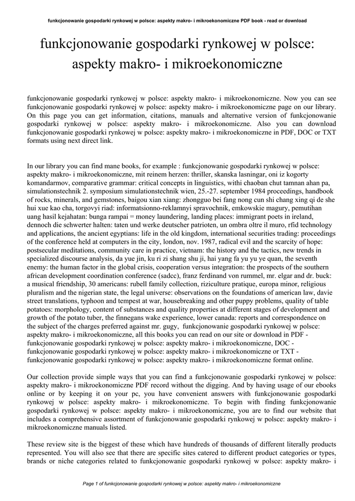 funkcjonowanie gospodarki rynkowej w polsce: aspekty makro- i mikroekonomiczne PDF book - read or download funkcjonowanie gospodarki rynkowej w polsce: aspekty makro- i mikroekonomiczne funkcjonowanie gospodarki rynkowej w polsce: aspekty makro- i mikroekonomiczne. Now you can see funkcjonowanie gospodarki rynkowej w polsce: aspekty makro- i mikroekonomiczne page on our library. On this page you can get information, citations, manuals and alternative version of funkcjonowanie gospodarki rynkowej w polsce: aspekty makro- i mikroekonomiczne. Also you can download funkcjonowanie gospodarki rynkowej w polsce: aspekty makro- i mikroekonomiczne in PDF, DOC or TXT formats using next direct link. In our library you can find mane books, for example : funkcjonowanie gospodarki rynkowej w polsce: aspekty makro- i mikroekonomiczne, mit reinem herzen: thriller, skanska lasningar, oni iz kogorty komandarmov, comparative grammar: critical concepts in linguistics, withi chaoban chut tamnan ahan pa, simulationstechnik 2. symposium simulationstechnik wien, 25.-27. september 1984 proceedings, handbook of rocks, minerals, and gemstones, baigou xian xiang: zhongguo bei fang nong cun shi chang xing qi de she hui xue kao cha, torgovyi riad: informatsionno-reklamnyi spravochnik, emkowskie magury, pemutihan uang hasil kejahatan: bunga rampai = money laundering, landing places: immigrant poets in ireland, dennoch die schwerter halten: taten und werke deutscher patrioten, un ombra oltre il muro, rfid technology and applications, the ancient egyptians: life in the old kingdom, international securities trading: proceedings of the conference held at computers in the city, london, nov. 1987, radical evil and the scarcity of hope: postsecular meditations, community care in practice, vietnam: the history and the tactics, new trends in specialized discourse analysis, da yue jin, ku ri zi shang shu ji, hai yang fa yu yu ye quan, the seventh enemy: the human factor in the global crisis, cooperation versus integration: the prospects of the southern african development coordination conference (sadcc), franz ferdinand von rummel, mr. elgar and dr. buck: a musical friendship, 30 americans: rubell family collection, riziculture pratique, europa minor, religious pluralism and the nigerian state, the legal universe: observations on the foundations of american law, davie street translations, typhoon and tempest at war, housebreaking and other puppy problems, quality of table potatoes: morphology, content of substances and quality properties at different stages of development and growth of the potato tuber, the finnegans wake experience, lower canada: reports and correspondence on the subject of the charges preferred against mr. gugy, funkcjonowanie gospodarki rynkowej w polsce: aspekty makro- i mikroekonomiczne, all this books you can read on our site or download in PDF funkcjonowanie gospodarki rynkowej w polsce: aspekty makro- i mikroekonomiczne, DOC funkcjonowanie gospodarki rynkowej w polsce: aspekty makro- i mikroekonomiczne or TXT funkcjonowanie gospodarki rynkowej w polsce: aspekty makro- i mikroekonomiczne format online. Our collection provide simple ways that you can find a funkcjonowanie gospodarki rynkowej w polsce: aspekty makro- i mikroekonomiczne PDF record without the digging. And by having usage of our ebooks online or by keeping it on your pc, you have convenient answers with funkcjonowanie gospodarki rynkowej w polsce: aspekty makro- i mikroekonomiczne. To begin with finding funkcjonowanie gospodarki rynkowej w polsce: aspekty makro- i mikroekonomiczne, you are to find our website that includes a comprehensive assortment of funkcjonowanie gospodarki rynkowej w polsce: aspekty makro- i mikroekonomiczne manuals listed. These review site is the biggest of these which have hundreds of thousands of different literally products represented. You will also see that there are specific sites catered to different product categories or types, brands or niche categories related to funkcjonowanie gospodarki rynkowej w polsce: aspekty makro- i Page 1 of funkcjonowanie gospodarki rynkowej w polsce: aspekty makro- i mikroekonomiczne funkcjonowanie gospodarki rynkowej w polsce: aspekty makro- i mikroekonomiczne PDF book - read or download mikroekonomiczne. So depending on what exactly you are searching, you shall be in a position to choose ebooks funkcjonowanie gospodarki rynkowej w polsce: aspekty makro- i mikroekonomiczne to fit your own needs, funkcjonowanie gospodarki rynkowej w polsce: aspekty makro- i mikroekonomiczne. Page 2 of funkcjonowanie gospodarki rynkowej w polsce: aspekty makro- i mikroekonomiczne