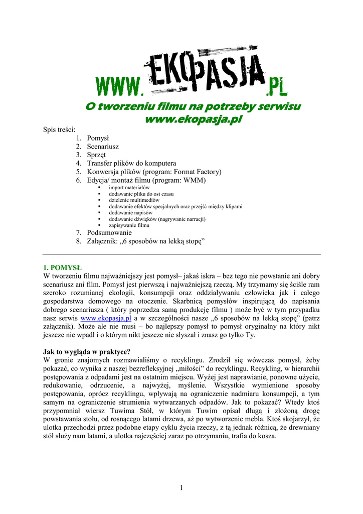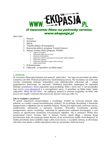WWW. .PL O tworzeniu filmu na potrzeby serwisu www.ekopasja.pl Spis treści: 1. 2. 3. 4. 5. 6. Pomysł Scenariusz Sprzęt Transfer plików do komputera Konwersja plików (program: Format Factory) Edycja/ montaŜ filmu (program: WMM) import materiałów dodawanie pliku do osi czasu dzielenie multimediów dodawanie efektów specjalnych oraz przejść między klipami dodawanie napisów dodawanie dźwięków (nagrywanie narracji) zapisywanie filmu 7. Podsumowanie 8. Załącznik: „6 sposobów na lekką stopę” 1. POMYSŁ W tworzeniu filmu najwaŜniejszy jest pomysł– jakaś iskra – bez tego nie powstanie ani dobry scenariusz ani film. Pomysł jest pierwszą i najwaŜniejszą rzeczą. My trzymamy się ściśle ram szeroko rozumianej ekologii, konsumpcji oraz oddziaływaniu człowieka jak i całego gospodarstwa domowego na otoczenie. Skarbnicą pomysłów inspirującą do napisania dobrego scenariusza ( który poprzedza samą produkcję filmu ) moŜe być w tym przypadku nasz serwis www.ekopasja.pl a w szczególności nasze „6 sposobów na lekką stopę” (patrz załącznik). MoŜe ale nie musi – bo najlepszy pomysł to pomysł oryginalny na który nikt jeszcze nie wpadł i o którym nikt jeszcze nie słyszał i znasz go tylko Ty. Jak to wygląda w praktyce? W gronie znajomych rozmawialiśmy o recyklingu. Zrodził się wówczas pomysł, Ŝeby pokazać, co wynika z naszej bezrefleksyjnej „miłości” do recyklingu. Recykling, w hierarchii postępowania z odpadami jest na ostatnim miejscu. WyŜej jest naprawianie, ponowne uŜycie, redukowanie, odrzucenie, a najwyŜej, myślenie. Wszystkie wymienione sposoby postępowania, oprócz recyklingu, wpływają na ograniczenie nadmiaru konsumpcji, a tym samym na ograniczenie strumienia wytwarzanych odpadów. Jak to pokazać? Wtedy ktoś przypomniał wiersz Tuwima Stół, w którym Tuwim opisał długą i złoŜoną drogę powstawania stołu, od rosnącego latami drzewa, aŜ po wytworzenie mebla. Ktoś skojarzył, Ŝe ulotka przechodzi przez podobne etapy cyklu Ŝycia rzeczy, z tą jednak róŜnicą, Ŝe drewniany stół słuŜy nam latami, a ulotka najczęściej zaraz po otrzymaniu, trafia do kosza. 1 2. SCENARIUSZ Gdy mamy juŜ pomysł i wiemy Ŝe jest to dobry materiał na film moŜemy przystąpić do pisania scenariusza. Scenariusz w duŜym skrócie to „film na papierze”, scena po scenie, dialog po dialogu – opisane w nim jest wszystko to co najwaŜniejsze w filmie. Jest to zapis tego co słychać i widać w filmie. Gdy spróbujesz sobie przypomnieć swój ulubiony film to najprawdopodobniej pierwsze co przyjdzie Ci na myśl to jakaś konkretna scena, obraz a nie sam dialog (ewentualnie dialog połączony z obrazem ) dlatego najwaŜniejsze by to co zostanie napisane stanowiło w wyobraźni czytelnika obrazy, obrazy które łącząc się stworzą film. Na podstawie scenariusza, moŜna całość ogarnąć, poznać, a przede wszystkim moŜna zdecydować, czy się nam podoba, czy nie. MoŜna zdecydować, czy warto inwestować czas. Sam zapis czy tez układ graficzny scenariusza bywa róŜny i w duŜej mierze zaleŜy od samego twórcy. Najstarszy aczkolwiek do dzisiaj śmiało stosowany sposób na zapis scenariusza wygląda jak dwukolumnowa tabelka, w której w jednej kolumnie zapisywane są dialogi zaś w drugiej wygląd sceny. Ciekawostką jest fakt Ŝe zapis taki jest wzorowany bezpośrednio na taśmie filmowej, w której obok klatek z obrazem biegnie ścieŜka dźwiękowa (pomijając filmy nieme) . Przykładowy scenariusz do naszego filmu „Ulotka” znajdującego się na naszym portalu, filmu który jest pastiszem, wspomnianego juŜ wiersza J. Tuwima, „Stół” wyglądał tak: scena 1 narracja Wyrosły w lesie drzewa potęŜne, twarde, wysmukłe i niebosięŜne. Rysunki pomocnicze 2 I przyszli drwale piły warczały, wnet legł pokotem drzew zagon cały. 3 JuŜ cięŜarówek dymiące stadko las do papierni zawozi gładko 4 A tam juŜ sprawnie się nim zajęli, rozładowali, pięknie pocięli. I zaraz młyny najmniejszą drzazgę pilnie, dokładnie mielą na miazgę. 2 Trafi ta miazga do kotłów wielkich a majster doda składników wszelkich: Najpierw wiec chloru pojemnik cały doda, by papier był lśniący i biały; Aby był gładki da kaolinu i na dodatek siarczanu gliny. Trzeba tę papkę długo gotować, a potem wodę z niej odparować, Wpuścić w cylindrów ciąg obrotowych aŜ wyjdzie z niego papier gotowy. 5 Tymczasem plastyk cięŜko pracował, projekt ulotki barwnej rysował. 6 Barwił, skanował, długo się męczył, aŜ drukarzowi swe dzieło wręczył. A ten w ruch puścił maszyny swoje, w mig zadrukował papieru zwoje. 7 I juŜ ulotki na ulicy rozdają a potem wartko do kosza trafiają Tyle mozołu popatrzcie dzieci, trzeba, by papier trafił do śmieci. 3 Oczywiście w trakcie realizacji samego filmu pewne sekwencje zostały wycięte inne zmienione przez samego twórcę, reŜysera a efekt końcowy jest dostępny na stronie www.ekopasja.pl . 3. SPRZĘT Film na potrzeby serwisu internetowego moŜemy zmontować z materiału nagranego kamerą, aparatem fotograficznym czy nawet lepszym telefonem komórkowym (Do zrobienia filmu na potrzeby strony WWW nie potrzebujemy super profesjonalnego sprzętu, poniewaŜ filmy dostępne do oglądania w Internecie i tak podlegają często przed publikacją bardzo silnej kompresji (a co za tym idzie spadkowi jakości) z uwagi na ograniczone moŜliwości łączy internetowych). Oprócz materiału filmowego moŜemy uŜyć do naszego filmu takŜe muzyki oraz zdjęć/ ilustracji, które odpowiednio wmontujemy w nasz film. Przy wykorzystaniu materiałów z Internetu lub innych źródeł (np. płyty z muzyką) pamiętać jednak musimy o zachowaniu praw autorskich dotyczących danych materiałów. 4. TRANSFER PLIKÓW Z TELEFONU Do kaŜdego z urządzeń posiadających moŜliwość nagrywania filmów, robienia zdjęć dołączone są odpowiednie kable do komunikacji z komputerem. W przypa