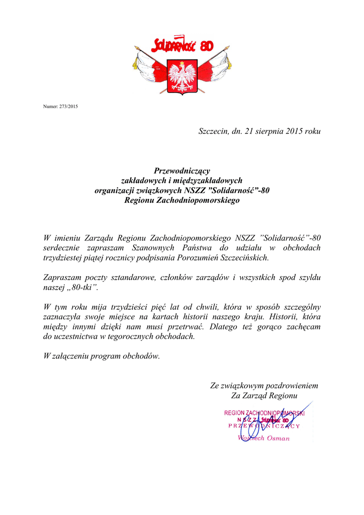 Numer: 273/2015 Szczecin, dn. 21 sierpnia 2015 roku Przewodniczący zakładowych i międzyzakładowych organizacji związkowych NSZZ ”Solidarność”-80 Regionu Zachodniopomorskiego W imieniu Zarządu Regionu Zachodniopomorskiego NSZZ ”Solidarność”-80 serdecznie zapraszam Szanownych Państwa do udziału w obchodach trzydziestej piątej rocznicy podpisania Porozumień Szczecińskich. Zapraszam poczty sztandarowe, członków zarządów i wszystkich spod szyldu naszej „80-tki”. W tym roku mija trzydzieści pięć lat od chwili, która w sposób szczególny zaznaczyła swoje miejsce na kartach historii naszego kraju. Historii, która między innymi dzięki nam musi przetrwać. Dlatego też gorąco zachęcam do uczestnictwa w tegorocznych obchodach. W załączeniu program obchodów. Ze związkowym pozdrowieniem Za Zarząd Regionu Program obchodów trzydziestej piątej rocznicy podpisania Porozumień Szczecińskich 28 sierpnia 2015 roku (piątek) Godz. 11.00 uroczystości przy pomniku „O godność człowieka” na terenie Morskiej Stoczni Remontowej „Gryfia” S.A. w Szczecinie: • hymn narodowy, otwarcie uroczystości; • przemówienia zaproszonych gości; • składanie kwiatów. Godz. 13.00 panel dyskusyjny „Minęło 35 lat – czy warto było?” (sala bankietowa w „Jachtowej” w Szczecinie): • zaproszeni goście i pozostali (uwaga: dotyczy członków Komisji Krajowej i Krajowej Komisji Rewizyjnej); • wręczenie złotych i srebrnych odznak honorowych NSZZ ”Solidarność”-80. 29 sierpnia 2015 roku (sobota) Godz. 12.30 uroczystości przy pomniku „W XX rocznicę strajków sierpniowych” w Świnoujściu (ul. Wybrzeże Władysława IV) • otwarcie uroczystości; • okolicznościowe przemówienia; • składanie wiązanek. 30 sierpnia 2015 roku (niedziela) Godz. 10.00 Msza polowa przed bramą główną Stoczni Szczecińskiej z udziałem prezydenta RP Godz. 12.00 Anioł Pański (biskup diecezji) Godz. 12.30 składanie wiązanek pod tablicą „Ofiar Grudnia”