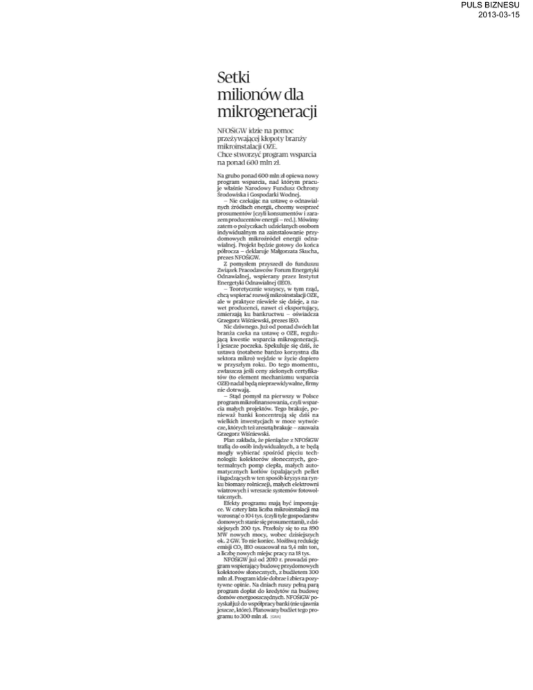 PULS BIZNESU 2013-03-15 Setki milionów dla mikrogeneracji NFOŚiGW idzie na pomoc przeżywającej kłopoty branży mikroinstalacji OZE. Chce stworzyć program wsparcia na ponad 600 mln zł. Na grubo ponad 600 mln zł opiewa nowy program wsparcia, nad którym pracu je właśnie Narodowy Fundusz Ochrony Środowiska i Gospodarki Wodnej. - Nie czekając na ustawę o odnawial nych źródłach energii, chcemy wesprzeć prosumentów [czyli konsumentów i zara zem producentów energii - red.]. Mówimy zatem o pożyczkach udzielanych osobom indywidualnym na zainstalowanie przy domowych mikroźródeł energii odna wialnej. Projekt będzie gotowy do końca półrocza - deklaruje Małgorzata Skucha, prezes NFOŚiGW. Z pomysłem przyszedł do funduszu Związek Pracodawców Forum Energetyki Odnawialnej, wspierany przez Instytut Energetyki Odnawialnej (IEO). - Teoretycznie wszyscy, w tym rząd, chcą wspierać rozwój mikroinstalacji OZE, ale w praktyce niewiele się dzieje, a na wet producenci, nawet ci eksportujący, zmierzają ku bankructwu - oświadcza Grzegorz Wiśniewski, prezes IEO. Nic dziwnego. Już od ponad dwóch lat branża czeka na ustawę o OZE, regulu jącą kwestie wsparcia mikrogeneracji. I jeszcze poczeka. Spekuluje się dziś, że ustawa (notabene bardzo korzystna dla sektora mikro) wejdzie w życie dopiero w przyszłym roku. Do tego momentu, zwłaszcza jeśli ceny zielonych certyfika tów (to element mechanizmu wsparcia OZE) nadal będą nieprzewidywalne, firmy nie dotrwają. - Stąd pomysł na pierwszy w Polsce program mikrofinansowania, czyli wspar cia małych projektów. Tego brakuje, po nieważ banki koncentrują się dziś na wielkich inwestycjach w moce wytwór cze, których też zresztą brakuje - zauważa Grzegorz Wiśniewski. Plan zakłada, że pieniądze z NFOŚiGW trafią do osób indywidualnych, a te będą mogły wybierać spośród pięciu tech nologii: kolektorów słonecznych, geo termalnych pomp ciepła, małych auto matycznych kotłów (spalających pellet i łagodzących w ten sposób kryzys na ryn ku biomasy rolniczej), małych elektrowni wiatrowych i wreszcie systemów fotowoltaicznych. Efekty programu mają być imponują ce. W cztery lata liczba mikroinstalacji ma wzrosnąć o 104 tys. (czyli tyle gospodarstw domowych stanie się prosumentami), z dzi siejszych 200 tys. Przełoży się to na 890 MW nowych mocy, wobec dzisiejszych ok. 2 GW To nie koniec. Możliwą redukcję emisji C0 2 IEO oszacował na 9,4 mln ton, a liczbę nowych miejsc pracy na 18 tys. NFOŚiGW już od 2010 r. prowadzi pro gram wspierający budowę przydomowych kolektorów słonecznych, z budżetem 300 mln zł. Program idzie dobrze i zbiera pozy tywne opinie. Na dniach ruszy pełną parą program dopłat do kredytów na budowę domów energooszczędnych. NFOŚiGW po zyskał już do współpracy banki (nie ujawnia jeszcze, które). Planowany budżet tego pro gramu to 300 mln zł. [GRA]