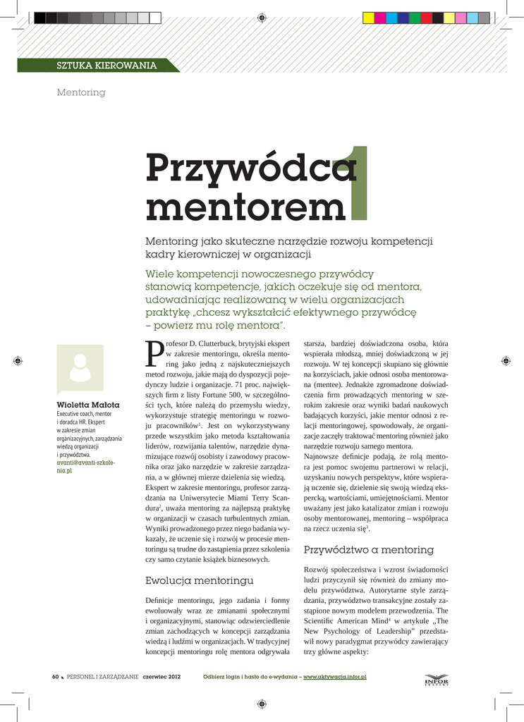 Sztuka Kierowania Mentoring 1 Przywódca mentorem Mentoring jako skuteczne narzędzie rozwoju kompetencji kadry kierowniczej w organizacji Wiele kompetencji nowoczesnego przywódcy stanowią kompetencje, jakich oczekuje się od mentora, udowadniając realizowaną w wielu organizacjach praktykę „chcesz wykształcić efektywnego przywódcę – powierz mu rolę mentora”. P Wioletta Małota Executive coach, mentor i doradca HR. Ekspert w zakresie zmian organizacyjnych, zarządzania wiedzą organizacji i przywództwa. [email protected] rofesor D. Clutterbuck, brytyjski ekspert w zakresie mentoringu, określa mentoring jako jedną z najskuteczniejszych metod rozwoju, jakie mają do dyspozycji pojedynczy ludzie i organizacje. 71 proc. największych firm z listy Fortune 500, w szczególności tych, które należą do przemysłu wiedzy, wykorzystuje strategię mentoringu w rozwoju pracowników1. Jest on wykorzystywany przede wszystkim jako metoda kształtowania liderów, rozwijania talentów, narzędzie dynamizujące rozwój osobisty i zawodowy pracownika oraz jako narzędzie w zakresie zarządzania, a w głównej mierze dzielenia się wiedzą. Ekspert w zakresie mentoringu, profesor zarządzania na Uniwersytecie Miami Terry Scandura2, uważa mentoring za najlepszą praktykę w organizacji w czasach turbulentnych zmian. Wyniki prowadzonego przez niego badania wykazały, że uczenie się i rozwój w procesie mentoringu są trudne do zastąpienia przez szkolenia czy samo czytanie książek biznesowych. Ewolucja mentoringu Definicje mentoringu, jego zadania i formy ewoluowały wraz ze zmianami społecznymi i organizacyjnymi, stanowiąc odzwierciedlenie zmian zachodzących w koncepcji zarządzania wiedzą i ludźmi w organizacjach. W tradycyjnej koncepcji mentoringu rolę mentora odgrywała 60 PERSONEL I ZARZĄDZANIE czerwiec 2012 starsza, bardziej doświadczona osoba, która wspierała młodszą, mniej doświadczoną w jej rozwoju. W tej koncepcji skupiano się głównie na korzyściach, jakie odnosi osoba mentorowana (mentee). Jednakże zgromadzone doświadczenia firm prowadzących mentoring w szerokim zakresie oraz wyniki badań naukowych badających korzyści, jakie mentor odnosi z relacji mentoringowej, spowodowały, że organizacje zaczęły traktować mentoring również jako narzędzie rozwoju samego mentora. Najnowsze definicje podają, że rolą mentora jest pomoc swojemu partnerowi w relacji, uzyskaniu nowych perspektyw, które wspierają uczenie się, dzielenie się swoją wiedzą ekspercką, wartościami, umiejętnościami. Mentor uważany jest jako katalizator zmian i rozwoju osoby mentorowanej, mentoring – współpraca na rzecz uczenia się3. Przywództwo a mentoring Rozwój społeczeństwa i wzrost świadomości ludzi przyczynił się również do zmiany modelu przywództwa. Autorytarne style zarządzania, przywództwo transakcyjne zostały zastąpione nowym modelem przewodzenia. The Scientific American Mind4 w artykule „The New Psychology of Leadership” przedstawił nowy paradygmat przywódcy zawierający trzy główne aspekty: Odbierz login i hasło do e-wydania – www.aktywacja.infor.pl sztuka kierowania Mentoring przywódca jest najbardziej skuteczny, gdy rozpozna aspiracje, jakie ludzie noszą w sercach, i pomoże im zaspokoić te aspiracje jednocześnie realizując cele firmy, tworząc tzw. wspólne cele, przywódca rozumie podstawową potrzebę pracowników przynależności do grupy i potrafi zbudować wspólną tożsamość jednostki i zespołu, przywódca ma umiejętność angażowania ludzi poprzez wyzwalanie ich pozytywnych emocji. W badaniu „What next?”, przeprowadzonym w 2007 r. przez Center for Creative Leadership5 na grupie 1331 menedżerów, zapytano o najważniejsze wyzwania dla kadry menedżerskiej i organizacji w zakresie umiejętności przywódczych. Jako najważniejsze wyzwanie wskazano umiejętność efektywnej współpracy (49 proc.), na drugim miejscu – zmianę modelu przywództwa (38 proc.), kolejno wskazano budowanie efektywnych zespołów (33 proc.) oraz wywieranie wpływu na osoby, które nie podlegają hierarchicznej zależności (33 proc.). Jako ważne kompetencje uznano również rozwój innowacyjności (29 proc.), coaching (26 proc.) oraz budowanie i pielęgnowanie relacji (25 proc.). Zarówno zdefiniowany przez naukowców na podstawie badań model przywództwa, jak i praktyczne badanie opinii samych przywódców wskazały na konieczność posiadania nowych kompetencji przywódcy. Nowe, oczekiwane od przywódców kompetencje, pokrywają się w dużej mierze z kompetencjami mentora (zobacz tabelę obok). Działy HR dostrzegły, że kompetencje, jakie powinien posiadać mentor, są tożsame z kompetencjami, jakich oczekuje się od przywódców, dlatego uznały odgrywanie roli mentora przez menedżera za jedno z najlepszych sposobów rozwoju jego kompetencji przywódcy. Spowodowało to kolejną fazę rozwoju mentoringu formalnego w organizacjach. Korzyści z mentoringu Korzyści z prowadzenia mentoringu w organizacji są wymierne, zarówno krótko-, jak i długoterminowe. Można je rozpatrywać z punktu wiedzenia osoby mentorowanej (do niedawna stanowiącej główny powód wdrażania mentoringu), mentora oraz organizacji. Oczywiście każda korzyść mentee czy mentora stanowi korzyść organizacji. Badanie prowadzone przez pięć lat przez Wharton School na Uniwersytecie Pennsylwania6 na 1000 osób uczestniczących w programie mentoringu prowadzonego w firmach o zaawansowanych technologiach pokazało, że osoby mentorowane były pięciokrotnie częściej promowane niż osoby nieuczestniczące w programie. Podobne korzyści odnieśli mentorzy, którzy byli promowani sześć razy częściej niż osoby na podobnych stanowiskach nieuczestniczące w programie. Dla mentee Do korzyści obiektywnych, jakich doświadcza osoba mentorowana, zalicza się awans na wyższe stanowisko i wzrost wynagrodzenia, natomiast do korzyści subiektywnych należ