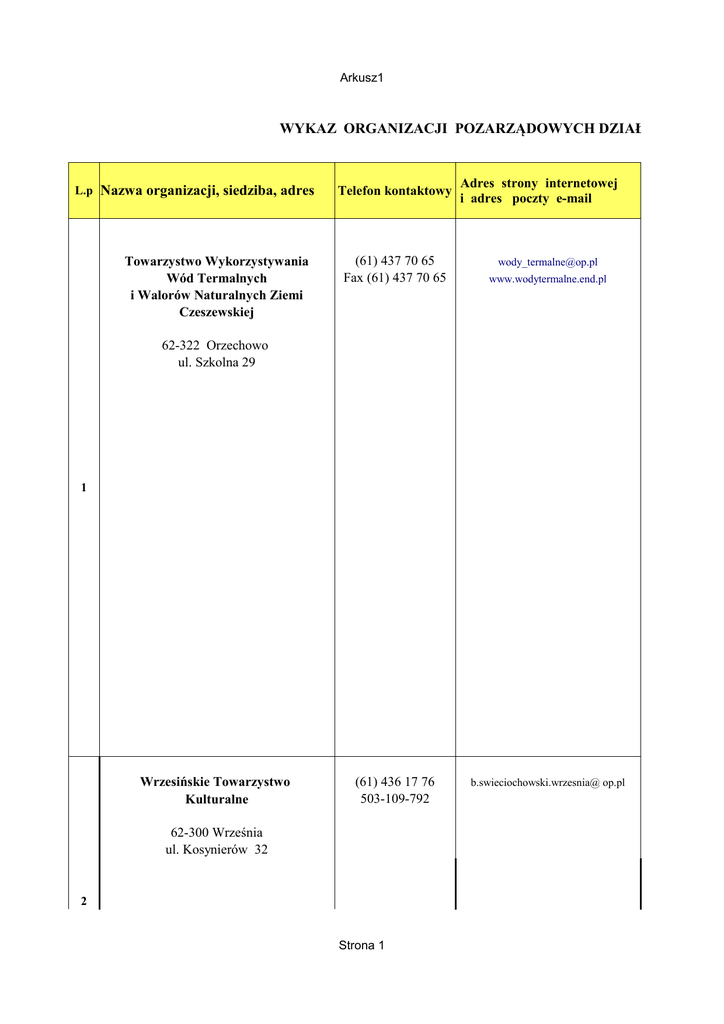 WYKAZ ORGANIZACJI POZARZĄDOWYCH