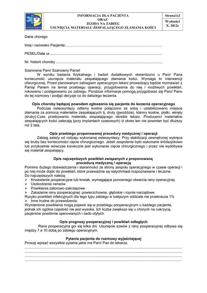 INFORMACJA DLA PACJENTA ORAZ ZGODA NA ZABIEG USUNIĘCIA MATERIAŁU ZESPALAJĄCEGO ZŁAMANIA KOŚCI Strona1z2 Wydanie1 X. 2012r Dane chorego Imię i nazwisko Pacjenta:……………………………………………………………………. PESEL/Data ur............................................................................................................... Nr. historii choroby ......................................................................................................... Szanowna Pani/ Szanowny Panie! W wyniku badania fizykalnego i badań dodatkowych stwierdzono u Pani/ Pana konieczność usunięcia materiału zespalającego złamania kości. Wymaga to interwencji chirurgicznej. Przed planowanym zabiegiem operacyjnym lekarz prowadzący będzie rozmawiać z Panią/ Panem na temat przebiegu operacji, przygotowania do niej i możliwych powikłań, rokowaniu i postępowaniu po zabiegu. Poniższe informacje pomogą przygotować się Pani/ Panu do tej rozmowy i podjąć decyzje co do dalszego leczenia. Opis choroby będącej powodem zgłoszenia się pacjenta do leczenia operacyjnego Podczas osteosyntezy odłamy kostne połączono ze sobą i ustabilizowano miejsce złamania za pomocą materiałów zespalających tj. druty (gwoździe), klamry kostne, płytki, wkręty (śruby).Czas przebywania materiału zespalającego określa lekarz. Producenci materiałów zespalających kości zalecają (przy implantach czasowych) iż okres ten nie powinien być dłuższy niż 2 lata. Opis przebiegu proponowanej procedury medycznej / operacji Zabieg zależy od rodzaju wykonanej osteosyntezy. Przy stabilizacji zewnętrznej wykręca się śruby bez konieczności cięcia chirurgicznego. Jeżeli zespolenie było wykonane śródszpikowo lub przykostnie wówczas konieczne jest wykonanie cięcia chirurgicznego i przez nie wydobywa się materiał zespalający. Opis najczęstszych powikłań związanych z proponowaną procedurą medyczną / operacją Pomimo dużego doświadczenia i staranności ze strony zespołu operacyjnego w czasie operacji i po niej może dojść do powikłań, które przeważnie są natychmiast rozpoznawane i leczone. Do najczęstszych należą: Krwawienie pooperacyjne lub krwiak, wymagające ponownego otwarcia rany operacyjnej. Uszkodzenie nerwów. Powikłania zatorowo-zakrzepowe Zakażenie rany pooperacyjnej: powierzchowne, głębokie i ropnie narządowe. Ryzyko powikłań infekcyjnych dla tego typu zabiegu w tutejszym oddziale nie przekracza 1% Inne trudne do przewidzenia. Wymienione powikłania mogą pojawić się w przebiegu pooperacyjnym u każdego pacjenta, jednak ich ogólna częstość nie jest wysoka. Ich liczba zwiększa się u chorych na cukrzycę, pacjentów powtórnie operowanych i osób otyłych. Opis prognozy pooperacyjnej i powikłań odległych Rana pooperacyjna goi się kilka dni. Usunięcie szwów z rany pooperacyjnej odbywa się między 7 a 10 dobą po zabiegu operacyjnym. Pytania pacjenta do rozmowy wyjaśniającej Proszę wpisać wszystkie pytania jakie ma Pani/ Pan do lekarza. ........................................................................................................................................................... ........................................................................................................................................................... ........................................................................................................................................................... ........................................................................................................................................................... INFORMACJA DLA PACJENTA ORAZ ZGODA NA ZABIEG USUNIĘCIA MATERIAŁU ZESPALAJĄCEGO ZŁAMANIA KOŚCI Strona2z2 Wydanie1 X. 2012r O czym powinien wiedzieć lekarz Na ryzyko operacji mają wpływ stan ogólny chorego oraz choroby współistniejące oraz choroby przebyte. Aby w porę można było rozpoznać zagrożenia prosimy odpowiedzieć na następujące pytania: ♦ Czy wiadomo, że istnieją u Pani/ Pana zaburzenia przemiany materii (np. cukrzyca) lub inne choroby tj. Choroby serca, naczyń, wątroby, tarczycy, układu nerwowego? ♦ Czy są u pacjenta współistniejące choroby zakaźne np. zapalenie wątroby, AIDS, nosicielstwo bakteryjne (gardło, nos, przewód pokarmowy)? Czy stwierdzone zostały u pacjenta uczulenia lub nadwrażliwość na leki, plastry, lateks, rośliny, środki spożywcze, zwierzęta? Czy występowały kiedykolwiek napady drgawek? Czy przy u Pani/ Pana wcześniejszych operacjach lub skaleczeniach (np. leczenie zęba) doszło do wzmożonego krwawienia? Czy wcześniej, w przypadku powstania ran, dochodziło do ropienia, opóźnionego gojenia, ropni, przetok, zgrubienia blizny po zagojeniu? Czy przyjmowane są leki tj. nasercowe, przeciwbólowe, hormony, hamujące krzepliwość krwi (np. Sintrom, Synkumar, Aspiryna, Acard)? Czy obserwowano u Pani/ Pana zakrzepy żylne lub zatorowość płucną? Kobiety w wieku rozrodczym : Czy istnieje możliwość, że jest Pani w ciąży? Tak/ nie ♦ ♦ ♦ ♦ ♦ ♦ ♦ Tak/ nie Tak/ nie Tak/ nie Tak/ nie Tak/ nie Tak/ nie Tak/ nie Tak/ nie Uwagi lekarskie do rozmowy wyjaśniającej (Np. ryzyko indywidualne i możliwe komplikacje, postępowanie wtórne, specjalne pytania pacjenta, ograniczenie zgody co do transfuzji, możliwe skutki ujemne w przypadku odmowy lub przesunięcia terminu zabiegu, podstawy pacjenta do odmowy sposób dalszej opieki) ........................................................................................................................................................... ........................................................................................................................................................... ........................................................................................................................................................... ...