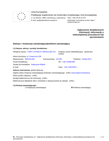 Unia Europejska Publikacja Suplementu do Dziennika Urzędowego Unii Europejskiej 2, rue Mercier, 2985 Luxembourg, Luksemburg Faks: +352 29 29 42 670 E-mail: [email protected] Informacje i formularze on-line: http:// simap.europa.eu Ogłoszenie dodatkowych informacji, informacje o niekompletnej procedurze lub sprostowanie Sekcja I: Instytucja zamawiająca/podmiot zamawiający I.1) Nazwa, adresy i punkty kontaktowe: Oficjalna nazwa: PORT LOTNICZY WROCŁAW S.A. Krajowy numer identyfikacyjny: (jeżeli jest znany) _____ Adres pocztowy: ul. Graniczna 190 Miejscowość: WROCŁAW Kod pocztowy: 54-530 Punkt kontaktowy: _____ Państwo: Polska (PL) Tel.: +48 713581300 Osoba do kontaktów: Katarzyna Wójcik E-mail: Faks: +48 713573973 Adresy internetowe: (jeżeli dotyczy) Ogólny adres instytucji zamawiającej/ podmiotu zamawiającego: (URL) www.airport.wroclaw.pl Adres profilu nabywcy: (URL) _____ Dostęp elektroniczny do informacji: (URL) _____ Elektroniczne składanie ofert i wniosków o dopuszczenie do udziału: (URL) _____ I.2) Rodzaj zamawiającego: Instytucja zamawiająca Podmiot zamawiający PL Formularz standardowy 14 - Ogłoszenie dodatkowych informacji, informacje o niekompletnej procedurze lub sprostowanie 1/5 Sekcja II: Przedmiot zamówienia II.1.1) Nazwa nadana zamówieniu: Dostawa energii elektrycznej dla Portu Lotniczego Wrocław S.A. na lata 2016-1017 II.1.2) Krótki opis zamówienia lub zakupu: (podano w pierwotnym ogłoszeniu) 1. Informacje wstępne: zadanie realizowane będzie na warunkach określonych w Ustawie Prawo zamówień publicznych, Ustawie z dnia 10 kwietnia 1997 r. Prawo energetyczne (Dz.U. z 2006 r. nr 89, poz. 625 ze zm.) oraz w oparciu o przepisy wykonawcze do tej ustawy, w szczególności Rozporządzenie Ministra Gospodarki z dnia 4 maja 2007 r. w sprawie szczegółowych warunków funkcjonowania systemu elektroenergetycznego (Dz.U. z 2007 r. nr 93, poz. 623 ze zm.), Taryfie dla energii elektrycznej sprzedawcy, Taryfie dla usług dystrybucji energii elektrycznej właściwego Operatora Systemu Dystrybucyjnego (Taryfie OSD), instrukcji Ruchu i Eksploatacji Sieci Dystrybucyjnej (IRiESD) – jeśli dotyczy. 2. Zadanie obejmuje dostawę energii elektrycznej do obiektów Zamawiającego w latach 2016 i 2017. Zamawiający zawrze z Wykonawcą umowę sprzedaży energii elektrycznej. Przewidywany termin realizacji dostawy: od 01.01.2016 do 31.12.2017. W celu realizacji zamówienia powierzonego nn. przetargiem Wykonawca musi mieć zawartą stosowną umowę z OSD obsługującym Zamawiającego, gwarantującą wykonanie zadania. Sprzedaż energii elektrycznej dla PLW S.A. odbywa się za pośrednictwem sieci dystrybucyjnej należącej do Operatora Systemu Dystrybucyjnego: TAURON Dystrybucja S.A Zamawiający udzieli Wykonawcy pełnomocnictw/a niezbędnego do przeprowadzenia procedury zmiany sprzedawcy energii elektrycznej. 3. Ogólna charakterystyka techniczna: Obiekty Portu Lotniczego we Wrocławiu zasilane są z 16 przyłączy energetycznych podstawowych i rezerwowych: 1) Terminal pasażerski – zasilanie podstawowe 2) Terminal pasażerski – zasilanie rezerwowe 3) Terminal GA – zasilanie podstawowe 4) Terminal GA – zasilanie rezerwowe 5) Terminal CARGO – zasilanie podstawowe 6) Terminal CARGO – zasilanie rezerwowe 7) Budynek techniczny R8 – zasilanie podstawowe 8) Budynek techniczny R8 – zasilanie rezerwowe 9) Domek pilota – zasilanie podstawowe 10) Domek pilota – zasilanie rezerwowe 11) Płyta postojowa PPS4 – zasilanie podstawowe 12) Płyta postojowa PPS4 – zasilanie rezerwowe 13) Urządzenia nawigacji lotniczej – zasilanie podstawowe 14) Urządzenia nawigacji lotniczej – zasilanie rezerwowe 15) Obiekt gospodarczy AVIA 16) Obiekt gospodarczy MPS II, Sumaryczna moc przyłączeniowa: 11 914 kW Sumaryczna moc umowna: 3784 kW Przewidywane zapotrzebowanie na energię elektryczną w terminie realizacji zamówienia szacowane jest na 29 GWh. w okresie 2ch lat tj.. na około 14,5 GWh rocznie Obowiązujące grupy taryfowe dla przyłączy: B23, B21, C22b i C11. Miejsce dostawy: Budynki/obiekty Portu Lotniczego Wrocław S.A. PL Formularz standardowy 14 - Ogłoszenie dodatkowych informacji, informacje o niekompletnej procedurze lub sprostowanie 2/5 Tytuł prawny do korzystania z obiektu: Własność/Dzierżawa/Użytkowanie Portu Lotniczego Wrocław S.A. Urządzenia pomiarowe: Przekładniki prądowe dostosowane do układów pomiarowych Liczniki energii zabudowane w stacjach transformatorowych. 4. Integralną część nn. opisu stanowi „Specyfikacja energetyczna Zamawiającego” dołączona jako Załącznik nr 6 do SIWZ. II.1.3) Wspólny Słownik Zamówień (CPV) Główny przedmiot Słownik główny 09310000 Słownik uzupełniający (jeżeli dotyczy) PL Formularz standardowy 14 - Ogłoszenie dodatkowych informacji, informacje o niekompletnej procedurze lub sprostowanie 3/5 Sekcja IV: Procedura IV.1)Rodzaj procedury (podano w pierwotnym ogłoszeniu) Otwarta Ograniczona Ograniczona przyspieszona Negocjacyjna Negocjacyjna przyspieszona Dialog konkurencyjny Negocjacyjna z uprzednim ogłoszeniem Negocjacyjna bez uprzedniego ogłoszenia Negocjacyjna z publikacją ogłoszenia o zamówieniu Negocjacyjna bez publikacji ogłoszenia o zamówieniu Udzielenie zamówienia bez uprzedniej publikacji ogłoszenia o zamówieniu w Dzienniku Urzędowym Unii Europejskiej IV.2)Informacje administracyjne IV.2.1)Numer referencyjny: (podano w pierwotnym ogłoszeniu) 5/2015/SPZ IV.2.2)Dane referencyjne ogłoszenia w przypadku ogłoszeń przesłanych drogą elektroniczną: Pierwotne ogłoszenie przesłane przez eNotices TED eSender Login: ENOTICES_PLWSA Dane referencyjne ogłoszenia: 2015-121227 rok i numer dokumentu IV.2.3)Ogłoszenie, którego dotyczy niniejsza publikacja: Numer ogłoszenia w Dz.U.: _____ z dnia: ______ (dd/mm/rrrr) IV.2.4)Data wysłania pierwotnego ogłoszenia: 10/09/2015 (dd/mm/rrrr) PL Formularz standardowy 14 - Ogłoszenie dodatkowych informacji, informacje o niekomple