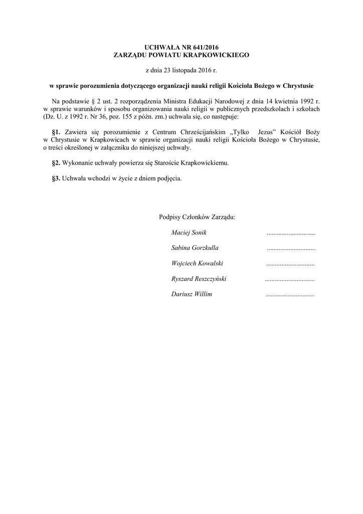 UCHWAŁA NR 641/2016 ZARZĄDU POWIATU KRAPKOWICKIEGO z dnia 23 listopada 2016 r. w sprawie porozumienia dotyczącego organizacji nauki religii Kościoła Bożego w Chrystusie Na podstawie § 2 ust. 2 rozporządzenia Ministra Edukacji Narodowej z dnia 14 kwietnia 1992 r. w sprawie warunków i sposobu organizowania nauki religii w publicznych przedszkolach i szkołach (Dz. U. z 1992 r. Nr 36, poz. 155 z późn. zm.) uchwala się, co następuje: §1. Zawiera się porozumienie z Centrum Chrześcijańskim „Tylko Jezus” Kościół Boży w Chrystusie w Krapkowicach w sprawie organizacji nauki religii Kościoła Bożego w Chrystusie, o treści określonej w załączniku do niniejszej uchwały. §2. Wykonanie uchwały powierza się Staroście Krapkowickiemu. §3. Uchwała wchodzi w życie z dniem podjęcia. Podpisy Członków Zarządu: Maciej Sonik ............................. Sabina Gorzkulla ............................. Wojciech Kowalski ............................. Ryszard Reszczyński .............................. Dariusz Willim ............................. Załącznik do Uchwały Nr 641/2016 Zarządu Powiatu Krapkowickiego z dnia 23 listopada 2016 r. Porozumienie Nr w sprawie organizacji nauki religii Kościoła Bożego w Chrystusie zawarte w dniu pomiędzy: Powiatem Krapkowickim, reprezentowanym przez Zarząd Powiatu Krapkowickiego, w imieniu którego działają: Maciej Sonik – Starosta Krapkowicki Sabina Gorzkulla – Wicestarosta przy kontrasygnacie Ilony Adamkiewicz – Skarbnika Powiatu Krapkowickiego a Centrum Chrześcijańskim „Tylko Jezus” Kościół Boży w Chrystusie w Krapkowicach, reprezentowanym przez Pastora Andrzeja Krajkę Na podstawie § 2 ust. 2 rozporządzenia Ministra Edukacji Narodowej z dnia 14 kwietnia 1992 r. w sprawie warunków i sposobu organizowania nauki religii w publicznych przedszkolach i szkołach (Dz. U. z 1992 r. Nr 36, poz. 155 z późn. zm.) strony porozumienia ustalają, co następuje: §1. Nauka religii Kościoła Bożego w Chrystusie dla uczniów szkół ponadgimnazjalnych prowadzonych przez Powiat Krapkowicki odbywa się w pozaszkolnym punkcie katechetycznym przy Centrum Chrześcijańskim „Tylko Jezus” Kościół Boży w Chrystusie w Krapkowicach i jest realizowana w wymiarze dwóch godzin lekcyjnych tygodniowo. §2. Nauczyciel religii realizujący zajęcia w pozaszkolnym punkcie katechetycznym jest zatrudniony w Zespole Szkół im. J. Kilińskiego w Krapkowicach, w wymiarze 2/18 etatu, na podstawie imiennego pisemnego skierowania wydanego przez władze zwierzchnie Kościoła Bożego w Chrystusie. §3. Wynagrodzenie nauczyciela religii jest pokrywane ze środków finansowych ujętych w planie finansowym szkoły, o której mowa w § 2. §4. 1. Porozumienie zostaje zawarte na czas nieokreślony. 2. Każda ze stron może wypowiedzieć porozumienie z zachowaniem trzymiesięcznego okresu wypowiedzenia, ze skutkiem na koniec roku szkolnego. §5. Wszelkie zmiany porozumienia wymagają formy pisemnej. §6. Porozumienie sporządza się w czterech jednobrzmiących egzemplarzach, po dwa dla każdej ze stron. §7. Porozumienie wchodzi w życie z dniem podpisania. Powiat Krapkowicki Centrum Chrześcijańskie „Tylko Jezus” Kościół Boży w Chrystusie w Krapkowicach