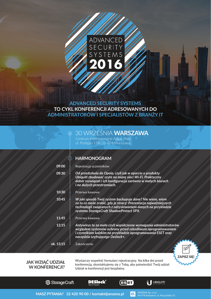 ADVANCED SECURITY SYSTEMS TO CYKL KONFERENCJI ADRESOWANYCH DO ADMINISTRATORÓW I SPECJALISTÓW Z BRANŻY IT 30 WRZEŚNIA WARSZAWA Centrum Konferencyjne Adgar Plaza ul. Postępu 17A, 02-676 Warszawa HARMONOGRAM 09:00 Rejestracja uczestników 09:30 Od przedszkola do Opola, czyli jak w oparciu o produkty Ubiquiti zbudować szyte na miarę sieci Wi-Fi. Praktyczny dobór rozwiązań i ich konfiguracja zarówno w małych biurach i na dużych przestrzeniach. 10:30 Przerwa kawowa 10:45 W jaki sposób Twój system backupuje dane? Nie wiem, wiem za to co może zrobić, gdy je stracę! Prezentacja najważniejszych technologii związanych z odzyskiwaniem danych na przykładzie systemu StorageCraft ShadowProtect SPX. 11:45 Przerwa kawowa 12:15 Antywirus to za mało czyli współczesne wymagania administratorów względem systemów ochrony przed szkodliwym oprogramowaniem i czynnikiem ludzkim na przykładzie oprogramowania ESET oraz narzędzia szyfrującego Deslock+. ok. 13:15 JAK WZIĄĆ UDZIAŁ W KONFERENCJI? Zakończenie Wystarczy wypełnić formularz rejestracyjny. Na kilka dni przed konferencją, skontaktujemy się z Tobą, aby potwierdzić Twój udział. Udział w konferencji jest bezpłatny. MASZ PYTANIA? 32 420 90 00 / [email protected] ANZENA Sp. z o.o. 40-478 Katowice, ul. Pszczyńska 15 ZAPISZ SIĘ!