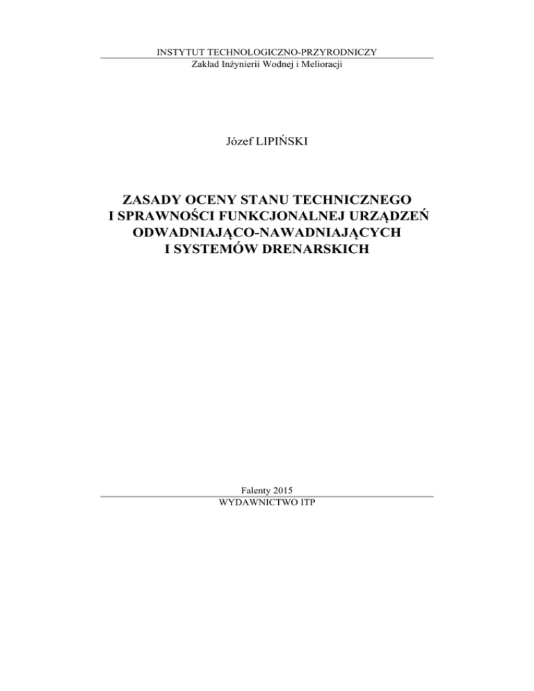 INSTYTUT TECHNOLOGICZNO-PRZYRODNICZY Zakład Inżynierii Wodnej i Melioracji Józef LIPIŃSKI ZASADY OCENY STANU TECHNICZNEGO I SPRAWNOŚCI FUNKCJONALNEJ URZĄDZEŃ ODWADNIAJĄCO-NAWADNIAJĄCYCH I SYSTEMÓW DRENARSKICH Falenty 2015 WYDAWNICTWO ITP 3 SPIS TREŚCI 1. Przedmiot i zakres opracowania .......................................................................... 5 2. Funkcje urządzeń odwadniająco-nawadniających i systemów drenarskich ........ 5 3. Podstawy prawne utrzymywania urządzeń melioracyjnych w stanie sprawności technicznej ....................................................................................... 6 4. Kryteria oceny stanu technicznego i sprawności funkcjonalnej urządzeń ........... 7 4.1. Kryteria przyrodnicze oraz rolnicze oceny sprawności systemów melioracyjnych ................................................................................................. 7 4.2. Kryteria techniczne oceny sprawności urządzeń melioracyjnych ............... 9 5. Działania związane z oceną stanu technicznego oraz sprawności funkcjonalnej urządzeń i systemów melioracyjnych .................................................... 10 5.1. Informacje wprowadzające ........................................................................ 10 5.2. Przeglądy urządzeń .................................................................................... 11 5.3. Opis stanu technicznego ............................................................................ 11 5.4. Ocena uwilgotnienia gleby i poziomu wód gruntowych ........................... 13 5.5. Ocena hydraulicznej sprawności drenu wraz z obsypką ............................ 14 5.6. Ocena hydraulicznej sprawności sieci drenarskiej na postawie pomiaru odpływu wody z drenów ....................................................................... 15 6. Wnioski i zalecenia wynikające z oceny stanu technicznego i sprawności funkcjonalnej urządzeń odwadniająco-nawadniających i systemów drenarskich ............................................................................................................. 16 7. Bibliografia ........................................................................................................ 19 Załącznik 1 ............................................................................................................. 21 Załącznik 2 ............................................................................................................. 22 Załącznik 3 ............................................................................................................. 22 Załącznik 4 ............................................................................................................. 22 Załącznik 5 ............................................................................................................. 22 Załącznik 6 ............................................................................................................. 23