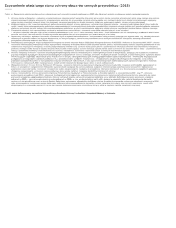 Zapewnienie właściwego stanu ochrony obszarów cennych przyrodniczo (2015) 2016-09-19 Projekt pn. Zapewnienie właściwego stanu ochrony obszarów cennych przyrodniczo został zrealizowany w 2015 roku. W ramach projektu zrealizowane zostały następujące zadania: 1. Ochrona płazów w Małopolsce – zakupiono urządzenia służące zabezpieczeniu fragmentów dróg przed wkraczaniem płazów na jezdnie w lokalizacjach gdzie płazy masowo giną podczas migracji sezonowych (głównie wiosennych); przeprowadzono warsztaty dla pracowników na temat ochrony płazów oraz możliwych skutecznych działań minimalizujących negatywny wpływ na płazy inwestycji liniowych (drogi, linie kolejowe); zakupiono specjalistyczny środek transportu służący do wykonywania zadań z zakresu ochrony gatunkowej; 2. Działania mające na celu ratowanie zagrożonych gatunków zwierząt objętych ochroną gatunkową – ochrona miejsc lęgowych ptaków – zakupiono budki lęgowe dla jerzyków, budki dla wróbli i kawek, które zostaną przekazane podmiotom przeprowadzającym termomodernizację budynków, podczas której zniszczeniu ulegają siedliska tych gatunków ptaków; zakupiono platformy pod gniazda bociana białego, które zostały przekazane podmiotom w celu ich zamontowania; wykonano zabiegi ochronne na gniazdach bociana białego i bociana czarnego; 3. Zarządzenie populacją bobra europejskiego na obszarze województwa małopolskiego – stosowanie materiałów zabezpieczających przed szkodami – zakupiono materiały zabezpieczające przed szkodami powodowanymi przez bobry: siatkę metalową, siatkę leśną i słupki metalowe w celu ich nieodpłatnego przekazania właścicielom gruntów, na których zaistniały szkody i istnieje zagrożenie wystąpienia dalszych strat gospodarczych powodowanych przez bobry; 4. Wypas owcy olkuskiej na wybranych murawach kserotermicznych w województwie małopolskim – kontynuowano zabieg ochronny polegający na wypasie owiec rasy olkuskiej obszarach chronionych w gminie Racławice na Wyżynie Miechowskiej, na których występują cenne murawy kserotermiczne z istotnymi stanowiskami storczyków, stanowiącymi siedliska priorytetowe chronione w ramach sieci Natura 2000; 5. Inwentaryzacja potencjalnych miejsc występowania nietoperzy na terenie obszarów Natura 2000 Ostoje Nietoperzy Bukowca PLH120020 i Podkowce w Szczawnicy PLH120037 – zlecono wykonanie inwentaryzacji potencjalnych miejsc występowania nietoperzy w obszarach Natura 2000 (strychów domów, piwnic); wykonane zostały nasłuchy za pomocą detektorów w celu ustalenia tras migracyjnych nietoperzy; w wyniku przeprowadzonej inwentaryzacji uzyskano wykaz potencjalnych i potwierdzonych lokalizacji schronień oraz kolonii letnich nietoperzy: podkowca małego i nocka dużego w obydwu obszarach Natura 2000; inwentaryzacja stanowi realizację zapisów planów zadań ochronnych dla obszarów Natura 2000 – uzupełnienie stanu wiedzy o przedmiotach ochrony i uwarunkowaniach ich ochrony, niezbędne do planowania i wykonania działań ochronnych oraz likwidacji zagrożeń; 6. Ochrona nietoperzy w mieście – wykonano ekspertyzę chiropterologiczną w blokach mieszkalnych na terenie głównych osiedli w Nowym Sączu, polegającą na oszacowaniu liczebności populacji nietoperzy bytujących w budynkach (ze szczególnym uwzględnieniem borowca wielkiego), określeniu niezbędnych działań ochronnych, a także możliwych do wykonania działań minimalizujących uciążliwości odczuwanych przez mieszkańców w związku z bliską obecnością tych zwierząt; przeprowadzono spotkania szkoleniowo - informacyjne dotyczące zasad postępowania z nietoperzami w szkołach podstawowych, z przedstawicielami spółdzielni mieszkaniowej i z mieszkańcami; zakupiono budki lęgowe dla nietoperzy, które zostaną przekazane zarządcom budynków w razie podejmowania prac remontowych na budynkach, w celu zapewnienia nietoperzom siedlisk zastępczych; opracowano i powielono materiały informacyjne o nietoperzach, które rozdysponowane zostały wśród mieszkańców Nowego Sącza i dzieci ze szkół podstawowych; 7. Małopolskie Centrum Czynnej Ochrony Reliktowych Chrząszczy – utworzono elektroniczną bazę danych dotyczącą chronionych gatunków chrząszczy próchnojadów występujących w Polsce, ze szczególnym uwzględnieniem Małopolski; wykonano budki zastępcze dla pachnicy dębowej, służące do interwencyjnego przechowywania larw pachnicy dębowej oraz przeniesiono czynne żerowiska chronionych chrząszczy do budek; zakupiono sprzęt niezbędny do prowadzenia interwencji terenowych oraz do oznaczania poszczególnych gatunków chrząszczy; zorganizowano seminarium naukowe dotyczące stanu wiedzy na temat chrząszczy dendrofilnych i metod ich ochrony; 8. Czynna i konserwatorska ochrona pierwiosnki omączonej Primula farinosa na jedynym w Polsce stanowisku w Beskidzie Sądeckim w obszarze Natura 2000 - etap IV – dokonano podsumowania prowadzonych od 2011 r. obserwacji fenologicznych zmierzających do wyznaczenia terminu rozpoczęcia i zakończenia kwitnienia oraz terminu pojawienia się nasion pierwiosnki omączonej; przeprowadzono trzykrotne liczenie kwitnących okazów pierwiosnki omączonej i dokonano oceny zdolności do kiełkowania nasion pierwiosnki omączonej zebranych w 2015 r.; rozmnożono pierwiosnkę z nasion zebranych w 2014 r. w celu uzyskania kolejnej partii roślin, służącej w przyszłości jako materiał do założenia stanowisk zastępczych pierwiosnki omączonej na terenie Beskidu Sądeckiego; wytypowano odpowiednie siedliskowo miejsce do założenia stanowiska zastępczego pierwiosnki omączonej w 2016 roku; przeprowadzono kontrolowany wypas stada owiec, dokonano jednorazowego koszenia stanowiska metoda tradycyjną (przy użyciu kosy ręcznej); ograniczono rozwój roślin ekspansywnych na stanowisku poprzez ich ręczne karczowanie; dokonano rozpoznania entomofauny biorącej udział w zapylani