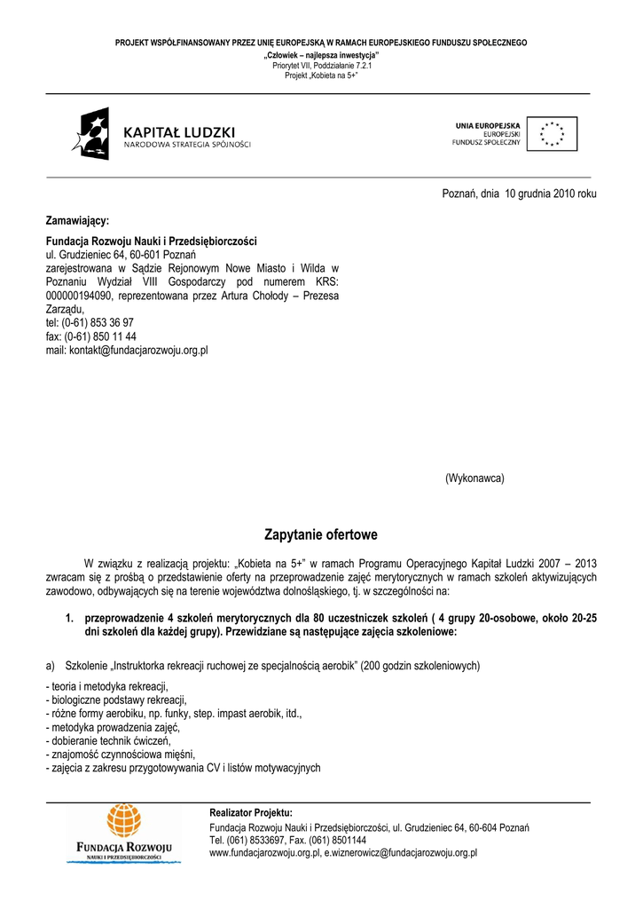 PROJEKT WSPÓŁFINANSOWANY PRZEZ UNIĘ EUROPEJSKĄ W RAMACH EUROPEJSKIEGO FUNDUSZU SPOŁECZNEGO „Człowiek – najlepsza inwestycja” Priorytet VII, Poddziałanie 7.2.1 Projekt „Kobieta na 5+” Poznań, dnia 10 grudnia 2010 roku Zamawiający: Fundacja Rozwoju Nauki i Przedsiębiorczości ul. Grudzieniec 64, 60-601 Poznań zarejestrowana w Sądzie Rejonowym Nowe Miasto i Wilda w Poznaniu Wydział VIII Gospodarczy pod numerem KRS: 000000194090, reprezentowana przez Artura Chołody – Prezesa Zarządu, tel: (0-61) 853 36 97 fax: (0-61) 850 11 44 mail: [email protected] (Wykonawca) Zapytanie ofertowe W związku z realizacją projektu: „Kobieta na 5+” w ramach Programu Operacyjnego Kapitał Ludzki 2007 – 2013 zwracam się z prośbą o przedstawienie oferty na przeprowadzenie zajęć merytorycznych w ramach szkoleń aktywizujących zawodowo, odbywających się na terenie województwa dolnośląskiego, tj. w szczególności na: 1. przeprowadzenie 4 szkoleń merytorycznych dla 80 uczestniczek szkoleń ( 4 grupy 20-osobowe, około 20-25 dni szkoleń dla każdej grupy). Przewidziane są następujące zajęcia szkoleniowe: a) Szkolenie „Instruktorka rekreacji ruchowej ze specjalnością aerobik” (200 godzin szkoleniowych) - teoria i metodyka rekreacji, - biologiczne podstawy rekreacji, - różne formy aerobiku, np. funky, step. impast aerobik, itd., - metodyka prowadzenia zajęć, - dobieranie technik ćwiczeń, - znajomość czynnościowa mięśni, - zajęcia z zakresu przygotowywania CV i listów motywacyjnych Realizator Projektu: Fundacja Rozwoju Nauki i Przedsiębiorczości, ul. Grudzieniec 64, 60-604 Poznań Tel. (061) 8533697, Fax. (061) 8501144 www.fundacjarozwoju.org.pl, [email protected] PROJEKT WSPÓŁFINANSOWANY PRZEZ UNIĘ EUROPEJSKĄ W RAMACH EUROPEJSKIEGO FUNDUSZU SPOŁECZNEGO „Człowiek – najlepsza inwestycja” Priorytet VII, Poddziałanie 7.2.1 Projekt „Kobieta na 5+” b) Szkolenie „Asystentka księgowej” (248 godzin szkoleniowych) - podstawy rachunkowości, - podstawy prawne, - formy i techniki księgowania, - komputerowa technika ewidencji księgowej, - wybrane zagadnienia rachunkowości finansowej, - księgowość komputerowa, - zajęcia z zakresu przygotowywania CV i listów motywacyjnych. c) Szkolenie „ Telemarketerka” (72 godzin szkoleniowych) - narzędzia komunikacji telefonicznej, - specyfika rozmów telefonicznych, - marketing aktywny, - obsługa klientów przez telefon, - budowanie relacji z klientem, - zajęcia z zakresu przygotowywania CV i listów motywacyjnych. d) Szkolenie „Specjalistka ds. promocji projektów EFS” (120 godzin szkoleniowych) - podstawowe dokumenty programowe dot. PO KL, - promocja, sprawozdawczość, - monitoring i ewaluacja, - zabezpieczenie projektu, - rozliczenie projektu, - archiwizacja dokumentacji, - zarządzanie projektem, - zarządzanie zespołem, - zasada równości szans w projektach EFS, - postrzeganie zasad i polityk wspólnotowych, - przygotowanie wniosku do PO KL, - zajęcia z zakresu przygotowywania CV i listów motywacyjnych. e) Warsztaty z zakresu umiejętności i kompetencji społecznych ( 128 godzin szkoleniowych) - test autodiagnozy - asertywność - komunikacja werbalna i niewerbalna - sposoby rozwiązywania konfliktów - radzenie sobie ze stresem i krytyką Realizator Projektu: Fundacja Rozwoju Nauki i Przedsiębiorczości, ul. Grudzieniec 64, 60-604 Poznań Tel. (061) 8533697, Fax. (061) 8501144 www.fundacjarozwoju.org.pl, [email protected] PROJEKT WSPÓŁFINANSOWANY PRZEZ UNIĘ EUROPEJSKĄ W RAMACH EUROPEJSKIEGO FUNDUSZU SPOŁECZNEGO „Człowiek – najlepsza inwestycja” Priorytet VII, Poddziałanie 7.2.1 Projekt „Kobieta na 5+” Zamówienie będzie wykonywane w terminie: od dnia 1 stycznia 2011 do 29 lutego 2012. 2. Przeprowadzenie spotkań indywidualnych z uczestniczkami projektu. Punkt ten obejmuje: a) Indywidualny Plan Działania ( 80 sztuk) - Dla każdej uczestniczki przygotowany zostanie IPD w oparciu o wywiad z doradcą zawodowym, który oceni predyspozycje zawodowe, trudności zawodowe oraz wypracuje wspólnie z każdą uczestniczką dalszą ścieżkę kształcenia i rozwoju zawodowego. b) Indywidualne doradztwo psychologiczne (400 godzin) - wywiad behawioralny mający na celu określenie poziomu motywacji i samooceny - analiza cech osobowych - zbudowanie u Beneficjentek wysokiego poziomu motywacji, samooceny, wiary we własne siły c) Coaching (400 godzin) - oszacowanie przeszkód i barier w integracji zawodowej i społecznej, - wyzwalanie potencjału - pomoc w osiąganiu nowych stopni rozwoju osobistego. $ Zamówienie będzie wykonywanie w terminie od 19 grudnia 2010 roku do 29 lutego 2012 roku. 3. Wynajem sal szkoleniowych a) Wynajem sal szkoleniowych na terenie jednego z powiatów: górowski, głogowski i wołowski – 768 godzin ( 4 szkolenia oraz warsztaty z zakresu umiejętności i kompetencji społecznych) Zamówienie będzie wykonywanie w terminie od 1 stycznia 2011 roku do 29 lutego 2012 roku. 4. Obsługa Cateringowa Obsługa Cateringowa którą zapewnia wykonawca dotyczy Cateringu dla każdej uczestniczki biorącej udział w szkoleniu. Każdego dnia w zajęciach będzie uczestniczyło 20 osób. Zajęcia będą odbywały się dwa lub trzy razy w tygodniu. Projekt zakłada 4 szkolenia, dla 80 uczestniczek ( 4 grupy 20 osobowe) oraz warsztaty z zakresu umiejętności i kompetencji, w której będzie uczestniczyć 80 osób. Projekt zakłada usługę cateringową w następujących ilościach: - Szkolenie „Instruktorka rekreacji ruchowej ze specjalnością aerobik” – 25 dni szkoleniowych - Szkolenie „Asystentka księgowej” – 31 dni szkoleniowych - Szkolenie „ Telemarketerka” – 9 dni szkoleniowych - Szkolenie „Specjalistka ds. promocji projektów EFS – 15 dni szkoleniowych - Warsztaty z zakresu umiejętności i kompetencji społecznych – 16 dni szkoleniowych Zamówienie będzie wykonywanie w terminie od 1 stycznia 2011 roku do 29 lutego 2012 roku. Re