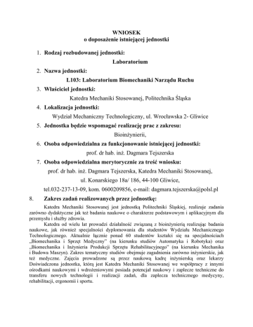 WNIOSEK o doposażenie istniejącej jednostki 1. Rodzaj rozbudowanej jednostki: Laboratorium 2. Nazwa jednostki: L103: Laboratorium Biomechaniki Narządu Ruchu 3. Właściciel jednostki: Katedra Mechaniki Stosowanej, Politechnika Śląska 4. Lokalizacja jednostki: Wydział Mechaniczny Technologiczny, ul. Wrocławska 2- Gliwice 5. Jednostka będzie wspomagać realizację prac z zakresu: Bioinżynierii, 6. Osoba odpowiedzialna za funkcjonowanie istniejącej jednostki: prof. dr hab. inż. Dagmara Tejszerska 7. Osoba odpowiedzialna merytorycznie za treść wniosku: prof. dr hab. inż. Dagmara Tejszerska, Katedra Mechaniki Stosowanej, ul. Konarskiego 18a/ 186, 44-100 Gliwice, tel.032-237-13-09, kom. 0600209856, e-mail: [email protected] 8. Zakres zadań realizowanych przez jednostkę: Katedra Mechaniki Stosowanej jest jednostką Politechniki Śląskiej, realizuje zadania zarówno dydaktyczne jak też badania naukowe o charakterze podstawowym i aplikacyjnym dla przemysłu i służby zdrowia. Katedra od wielu lat prowadzi działalność związaną z bioinżynierią realizując badania naukowe, jak również specjalności dyplomowania dla studentów Wydziału Mechanicznego Technologicznego. Aktualnie łącznie ponad 60 studentów kształci się na specjalnościach „Biomechanika i Sprzęt Medyczny” (na kierunku studiów Automatyka i Robotyka) oraz „Biomechanika i Inżynieria Produkcji Sprzętu Rehabilitacyjnego” (na kierunku Mechanika i Budowa Maszyn). Zakres tematyczny studiów obejmuje zagadnienia zarówno inżynierskie, jak też medyczne. Zajęcia prowadzone są przez naukową kadrę inżynierską oraz lekarzy Doświadczona jednostka, którą jest Katedra Mechaniki Stosowanej we współpracy z innymi ośrodkami naukowymi i wdrożeniowymi posiada potencjał naukowy i zaplecze techniczne do transferu nowych technologii i realizacji zadań, dla zaplecza technicznego medycyny, rehabilitacji, ergonomii i sportu. 9. Aktualny stan posiadania jednostki: Aktualnie jednostka posiada następujący sprzęt wykorzystywany do badań związanych z bioinżynierią: • Maszyna wytrzymałościowa MTS do badań statycznych • Maszyna wytrzymałościowa MTS do badań dynamicznych • Fotel do ćwiczeń oporowych • System APAS do wideo rejestracji 10. Dotychczasowe osiągnięcia uzyskane w wyniku badań prowadzonych w istniejącej jednostce: Katedra Mechaniki Stosowanej od ponad dziesięciu lat zajmuje się zagadnieniami biomechaniki w obszarach inżynierii biomedycznej, rehabilitacji i sportu. Do najważniejszych wyróżnionych osiągnięć należą: • D.Tejszerska, M. Gzik, III Nagroda w konkursie „Mój pomysł na biznes” za projekt pt.: „Wielozadaniowy system do operacji mikrochirurgicznych – HEDMED”, Gliwice 2004 • D. Tejszerska, A Sobaś, Laureat nagrody w konkursie Prezydenta RP na „Superpracownię 2004”, Warszawa 2004 • D. Tejszerska, M. Gzik, D. Gąsiorek, W. Wolański, I Nagroda w konkursie „Mój pomysł na biznes” za projekt pt. „Interaktywne systemy do rehabilitacji wad postawy u dzieci i młodzieży - REHATOYS”, Gliwice 2005 • Nagroda Rektorska I stopnia zespołowa za pracę zbiorowa pod redakcją Dagmary Tejszerskiej, Eugeniusza Świtońskiego : “Biomechanika inżynierska. Zagadnienia wybrane – laboratorium”, Wydawnictwo Politechniki Śląskiej, Gliwice 2005 • Nagroda Ministra Edukacji Narodowej i Sportu za pracę zbiorowa pod redakcją Eugeniusza Świtońskiego : “Modelowanie mechanicznych układów napędowych”, Wydawnictwo Politechniki Śląskiej, Gliwice 2005 Osiągnięcia i rezultaty badań prezentowane były na licznych konferencjach krajowych i zagranicznych, były one podstawą wielu publikacji naukowych. Publikacje liczbowo: Rok: Krajowe Zagraniczne Zwarte 2002 31 9 6 2003 48 13 5 2004 52 11 7 2005 51 12 2 2006 66 13 6 2007 33 7 3 Publikacje wybrane: • krajowe: • Gzik M., Tejszerska D..: Badania modelowe fleksyjnego oraz kompresyjnego mechanizmu urazu odcinka szyjnego kręgosłupa człowieka, Proceedings of 3rd Scientific Conference on Materials, Mechanical and Manufacturing Engineering, pp. 799-808, Gliwice 2005. • Tejszerska D. Wolański W.: Badania modelowe zespolenia kręgosłupa szyjnego, Proceedings of 3rd Scientific Conference on Materials, Mechanical and Manufacturing Engineering, pp. 793 -798, Gliwice 2005. • Michnik R., Jurkojć J., Jureczko P.: Badania modelowe fleksyjnego oraz kompresyjnego mechanizmu urazu odcinka szyjnego kręgosłupa człowieka, Proceedings of 3rd Scientific Conference on Materials, Mechanical and Manufacturing Engineering, pp. 809-818, Gliwice 2005. • Guzik A., Michnik R., Jurkojć J., Jureczko P., Zastosowanie modelowania matematycznego do wspomagania procesu rehabilitacji, Sympozjum "Analiza ruchu teoria i praktyka w zastosowaniach klinicznych", s. 24, Warszawa 2006. • Guzik A., Michnik R., Rycerski W., The estimation of rehabilitaion progres in patients with psychomotor diseases of upper limb based on modelling and experimetal reseaech, Acta of Bioengineering and Biomechanics, Vol. 8, No. 2, p. 79-87, Wrocław 2006. • Gzik M., Tejszerska D., Bobrowski M., Marcol W., Ślusarczyk W., Malinowska – Kołodziej I., Właszczuk A., Lewin-Kowalik J.: „A new non-laminectomy model of the spinal cord injury: pressure impactor”, Acta of Bioengineering and Biomechanics, vol.8, no.2, str.89-95, 2006. • Gzik M., Świtoński E, Tejszerska D., Wolański W., Potkowa P., Alshammari N.K.: „Analiza ruchu kierowcy w płaszczyźnie czołowej oraz oddziaływań wewnętrznych w kręgosłupie szyjnym podczas wypadków samochodowych”, Modelowanie Inżynierskie, nr.32, str. 179-186, Gliwice 2006. • zagraniczne: • Gzik M., “Dynamic interactions in human cervical spine during car accidents”, Advances in Transportation Studies an International Journal, vol.3, July, Roma 2004. • Tejszerska D., Gzik M.: “Upper human body parts response during head-on and rear car collision”, Journal Engineering Mec