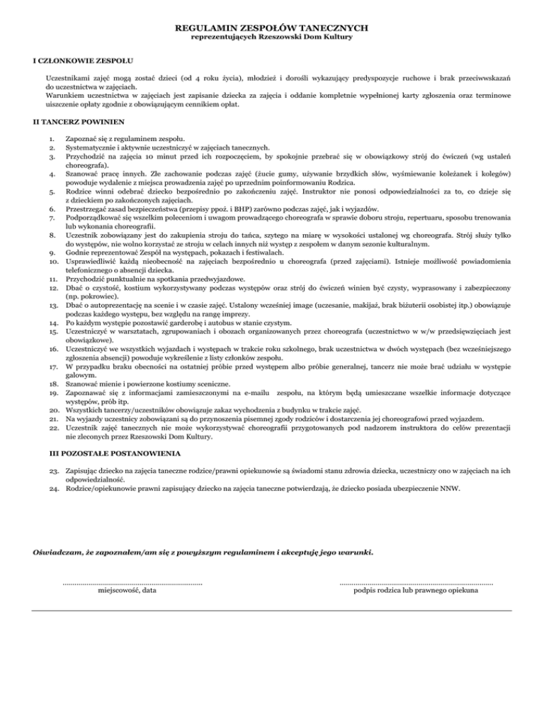 REGULAMIN ZESPOŁÓW TANECZNYCH reprezentujących Rzeszowski Dom Kultury I CZŁONKOWIE ZESPOŁU Uczestnikami zajęć mogą zostać dzieci (od 4 roku życia), młodzież i dorośli wykazujący predyspozycje ruchowe i brak przeciwwskazań do uczestnictwa w zajęciach. Warunkiem uczestnictwa w zajęciach jest zapisanie dziecka za zajęcia i oddanie kompletnie wypełnionej karty zgłoszenia oraz terminowe uiszczenie opłaty zgodnie z obowiązującym cennikiem opłat. II TANCERZ POWINIEN 1. 2. 3. 4. 5. 6. 7. 8. 9. 10. 11. 12. 13. 14. 15. 16. 17. 18. 19. 20. 21. 22. Zapoznać się z regulaminem zespołu. Systematycznie i aktywnie uczestniczyć w zajęciach tanecznych. Przychodzić na zajęcia 10 minut przed ich rozpoczęciem, by spokojnie przebrać się w obowiązkowy strój do ćwiczeń (wg ustaleń choreografa). Szanować pracę innych. Złe zachowanie podczas zajęć (żucie gumy, używanie brzydkich słów, wyśmiewanie koleżanek i kolegów) powoduje wydalenie z miejsca prowadzenia zajęć po uprzednim poinformowaniu Rodzica. Rodzice winni odebrać dziecko bezpośrednio po zakończeniu zajęć. Instruktor nie ponosi odpowiedzialności za to, co dzieje się z dzieckiem po zakończonych zajęciach. Przestrzegać zasad bezpieczeństwa (przepisy ppoż. i BHP) zarówno podczas zajęć, jak i wyjazdów. Podporządkować się wszelkim poleceniom i uwagom prowadzącego choreografa w sprawie doboru stroju, repertuaru, sposobu trenowania lub wykonania choreografii. Uczestnik zobowiązany jest do zakupienia stroju do tańca, szytego na miarę w wysokości ustalonej wg choreografa. Strój służy tylko do występów, nie wolno korzystać ze stroju w celach innych niż występ z zespołem w danym sezonie kulturalnym. Godnie reprezentować Zespół na występach, pokazach i festiwalach. Usprawiedliwić każdą nieobecność na zajęciach bezpośrednio u choreografa (przed zajęciami). Istnieje możliwość powiadomienia telefonicznego o absencji dziecka. Przychodzić punktualnie na spotkania przedwyjazdowe. Dbać o czystość, kostium wykorzystywany podczas występów oraz strój do ćwiczeń winien być czysty, wyprasowany i zabezpieczony (np. pokrowiec). Dbać o autoprezentację na scenie i w czasie zajęć. Ustalony wcześniej image (uczesanie, makijaż, brak biżuterii osobistej itp.) obowiązuje podczas każdego występu, bez względu na rangę imprezy. Po każdym występie pozostawić garderobę i autobus w stanie czystym. Uczestniczyć w warsztatach, zgrupowaniach i obozach organizowanych przez choreografa (uczestnictwo w w/w przedsięwzięciach jest obowiązkowe). Uczestniczyć we wszystkich wyjazdach i występach w trakcie roku szkolnego, brak uczestnictwa w dwóch występach (bez wcześniejszego zgłoszenia absencji) powoduje wykreślenie z listy członków zespołu. W przypadku braku obecności na ostatniej próbie przed występem albo próbie generalnej, tancerz nie może brać udziału w występie galowym. Szanować mienie i powierzone kostiumy sceniczne. Zapoznawać się z informacjami zamieszczonymi na e-mailu zespołu, na którym będą umieszczane wszelkie informacje dotyczące występów, prób itp. Wszystkich tancerzy/uczestników obowiązuje zakaz wychodzenia z budynku w trakcie zajęć. Na wyjazdy uczestnicy zobowiązani są do przynoszenia pisemnej zgody rodziców i dostarczenia jej choreografowi przed wyjazdem. Uczestnik zajęć tanecznych nie może wykorzystywać choreografii przygotowanych pod nadzorem instruktora do celów prezentacji nie zleconych przez Rzeszowski Dom Kultury. III POZOSTAŁE POSTANOWIENIA 23. Zapisując dziecko na zajęcia taneczne rodzice/prawni opiekunowie są świadomi stanu zdrowia dziecka, uczestniczy ono w zajęciach na ich odpowiedzialność. 24. Rodzice/opiekunowie prawni zapisujący dziecko na zajęcia taneczne potwierdzają, że dziecko posiada ubezpieczenie NNW. Oświadczam, że zapoznałem/am się z powyższym regulaminem i akceptuję jego warunki. …………………………………………………………….. miejscowość, data …………………………………………………………………… podpis rodzica lub prawnego opiekuna