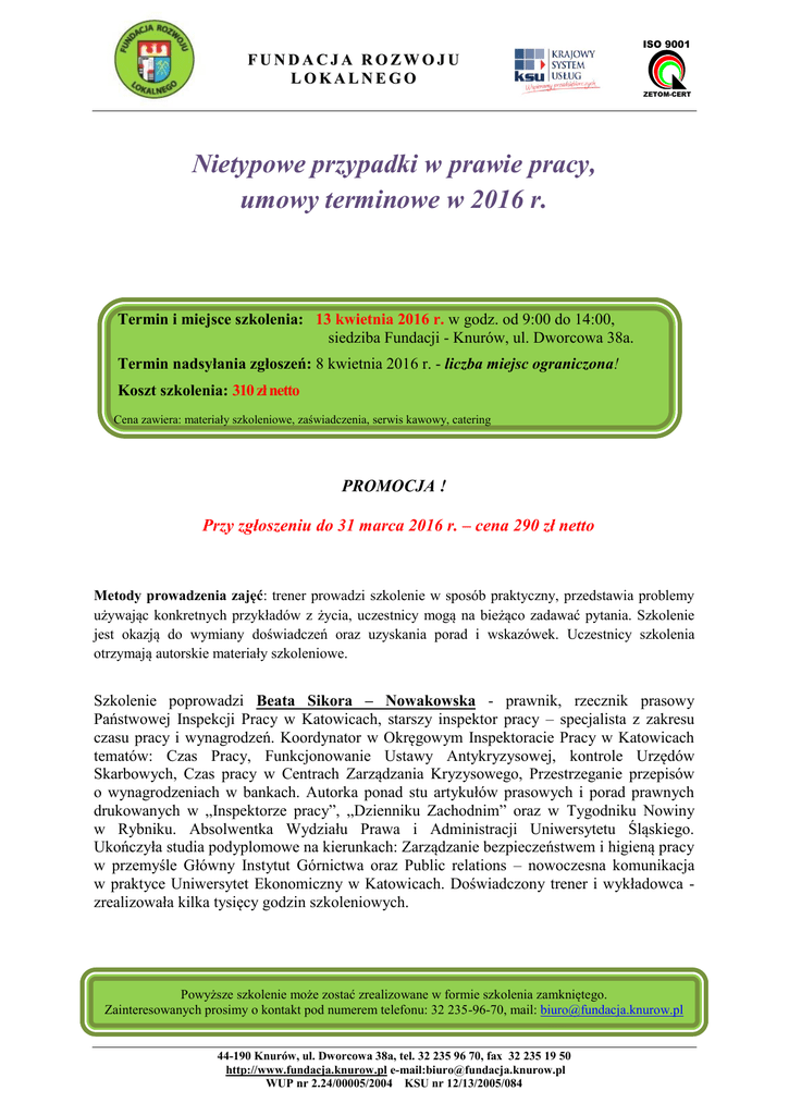 ISO 9001 FUNDACJA ROZWOJU LOKALNEGO ZETOM-CERT Nietypowe przypadki w prawie pracy, umowy terminowe w 2016 r. Termin i miejsce szkolenia: 13 kwietnia 2016 r. w godz. od 9:00 do 14:00, siedziba Fundacji - Knurów, ul. Dworcowa 38a. Termin nadsyłania zgłoszeń: 8 kwietnia 2016 r. - liczba miejsc ograniczona! Koszt szkolenia: 310 zł netto Cena zawiera: materiały szkoleniowe, zaświadczenia, serwis kawowy, catering PROMOCJA ! Przy zgłoszeniu do 31 marca 2016 r. – cena 290 zł netto Metody prowadzenia zajęć: trener prowadzi szkolenie w sposób praktyczny, przedstawia problemy używając konkretnych przykładów z życia, uczestnicy mogą na bieżąco zadawać pytania. Szkolenie jest okazją do wymiany doświadczeń oraz uzyskania porad i wskazówek. Uczestnicy szkolenia otrzymają autorskie materiały szkoleniowe. Szkolenie poprowadzi Beata Sikora – Nowakowska - prawnik, rzecznik prasowy Państwowej Inspekcji Pracy w Katowicach, starszy inspektor pracy – specjalista z zakresu czasu pracy i wynagrodzeń. Koordynator w Okręgowym Inspektoracie Pracy w Katowicach tematów: Czas Pracy, Funkcjonowanie Ustawy Antykryzysowej, kontrole Urzędów Skarbowych, Czas pracy w Centrach Zarządzania Kryzysowego, Przestrzeganie przepisów o wynagrodzeniach w bankach. Autorka ponad stu artykułów prasowych i porad prawnych drukowanych w „Inspektorze pracy”, „Dzienniku Zachodnim” oraz w Tygodniku Nowiny w Rybniku. Absolwentka Wydziału Prawa i Administracji Uniwersytetu Śląskiego. Ukończyła studia podyplomowe na kierunkach: Zarządzanie bezpieczeństwem i higieną pracy w przemyśle Główny Instytut Górnictwa oraz Public relations – nowoczesna komunikacja w praktyce Uniwersytet Ekonomiczny w Katowicach. Doświadczony trener i wykładowca zrealizowała kilka tysięcy godzin szkoleniowych. Powyższe szkolenie może zostać zrealizowane w formie szkolenia zamkniętego. Zainteresowanych prosimy o kontakt pod numerem telefonu: 32 235-96-70, mail: [email protected] 44-190 Knurów, ul. Dworcowa 38a, tel. 32 235 96 70, fax 32 235 19 50 http://www.fundacja.knurow.pl e-mail:[email protected] WUP nr 2.24/00005/2004 KSU nr 12/13/2005/084 ISO 9001 FUNDACJA ROZWOJU LOKALNEGO ZETOM-CERT Program szkolenia: 1. Badania lekarskie pracowników kierujących pojazdami w ramach obowiązków służbowych. 2. Praca i zwolnienie lekarskie w jednym dniu pracy pracownika. 3. Kontrola nieobecności w pracy z powodu choroby. 4. Postępowanie z pracownikiem – skierowanie na badania okresowe, gdy nie upłynął termin ich ważności. 5. Przeprowadzenie badania stanu trzeźwości pracownika. 6. Obniżenie wynagrodzenia za wyjścia „na papierosa”. 7. Udzielenie urlopu wypoczynkowego bezpośrednio po długotrwałej chorobie. 8. Wydanie świadectwa pracy w przypadku śmierci pracownika. 9. Zwolnienie dyscyplinarne, jeżeli pracownik nie odbiera korespondencji. 10. Odpowiedzialność pracodawcy i osób kierujących pracownikami na gruncie prawa pracy, prawa karnego i prawa cywilnego. 11. Umowy terminowe według zasad obowiązujących od 22.02.2016 r. 12. Zatrudnienie na podstawie umowy o pracę na czas określony – zasada 33 i 3. 13. Zawarcie umowy na czas określony poza kodeksowymi limitami. 14. Wypowiedzenie umowy o pracę na czas określony. 15. Nowe obowiązki informacyjne względem PIP. 16. Nowy czyn zabroniony w katalogu wykroczeń Kodeksu Pracy. 17. Zwolnienie z obowiązku świadczenia pracy. 18. Stanowisko MPIPS z 7 października 2015 r. w sprawie liczenia 33 miesięcy umów terminowych po nowelizacji Kodeksu Pracy. 19. Zwolnienie z obowiązku świadczenia pracy po zmianach przepisów. 20. Stanowisko MPIPS z 7 października 2015 r. w sprawie liczenia 33 miesięcy umów terminowych po nowelizacji kodeksu pracy. 21. Stanowisko MPIPS Biuro Promocji Mediów z 5 listopada 2015 r. w sprawie limitów umów terminowych. 22. Stanowisko MRPIPS Biuro Promocji I Mediów z 7 grudnia 2015 r. w sprawie sankcji za nieuzupełnienie treści umowy o okoliczności uzasadniające niestosowanie limitów zatrudnienia terminowego. 23. Stanowisko MPIPS z 19 sierpnia 2015 r. w sprawie liczenia terminów upływu okresów wypowiedzenia. 44-190 Knurów, ul. Dworcowa 38a, tel. 32 235 96 70, fax 32 235 19 50 http://www.fundacja.knurow.pl e-mail:[email protected] WUP nr 2.24/00005/2004 KSU nr 12/13/2005/084 ISO 9001 FUNDACJA ROZWOJU LOKALNEGO ZETOM-CERT FORMULARZ ZGŁOSZENIOWY Niniejszym zgłaszam udział w szkoleniu z zakresu: Nietypowe przypadki w prawie pracy, umowy terminowe w 2016 r. Imię i Nazwisko: Stanowisko: Nazwa instytucji: Adres Tel/fax: Adres e-mail: - 290,00 zł/os (promocja do 31 marca 2016 r.) + 23% VAT - 290,00 zł/os (promocja do 31 marca 2016 r.) zwolnienie z VAT dla opłacających szkolenie ze środków publicznych - 310,00 zł/os + 23% VAT - 310,00 zł/os zwolnienie z VAT dla opłacających szkolenie ze środków publicznych Podpis: Zgłoszenia można przesyłać faxem pod nr 32 235-19-50 lub na adres e-mail: [email protected] 44-190 Knurów, ul. Dworcowa 38a, tel. 32 235 96 70, fax 32 235 19 50 http://www.fundacja.knurow.pl e-mail:[email protected] WUP nr 2.24/00005/2004 KSU nr 12/13/2005/084 ISO 9001 FUNDACJA ROZWOJU LOKALNEGO ZETOM-CERT OŚWIADCZENIE Oświadczenie ma na celu możliwość zastosowania zwolnienia z podatku VAT zgodnie z art. 43 ust. 1 pkt 29 lit. c ustawy o podatku od towarów i usług z dnia 11 marca 2004 r. z późniejszymi zmianami. …………………………………………………………………………………………………………………………………………………….. (nazwa instytucji) Oświadczamy, że usługa szkoleniowa nabyta od Fundacji Rozwoju Lokalnego Tytuł szkolenia: Nietypowe przypadki w prawie pracy, umowy terminowe w 2016 r. Termin i miejsce realizacji: ................................................................................................................................ Imię i nazwisko uczestnika: .....................................