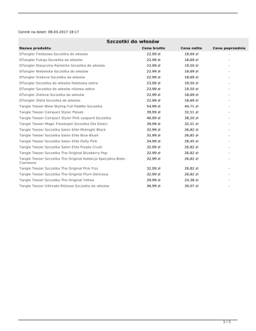 Cennik na dzień: 08-03-2017 18:17 Szczotki do włosów Nazwa produktu Cena brutto Cena netto Cena poprzednia DTangler Fioletowa Szczotka do włosów 22,99 zł 18,69 zł - DTangler Fuksja Szczotka do włosów 22,99 zł 18,69 zł - DTangler Klasyczna Panterka Szczotka do włosów 23,99 zł 19,50 zł - DTangler Niebieska Szczotka do włosów 22,99 zł 18,69 zł - DTangler Srebrna Szczotka do włosów 22,99 zł 18,69 zł - DTangler Szczotka do włosów fioletowa zebra 23,99 zł 19,50 zł - DTangler Szczotka do włosów różowa zebra 23,99 zł 19,50 zł - DTangler Zielona Szczotka do włosów 22,99 zł 18,69 zł - DTangler Złota Szczotka do włosów 22,99 zł 18,69 zł - Tangle Teezer Blow Styling Full Paddle Szczotka 54,99 zł 44,71 zł - Tangle Teezer Compact Styler Piesek 39,99 zł 32,51 zł - Tangle Teezer Compact Styler Pink Leopard Szczotka 46,99 zł 38,20 zł - Tangle Teezer Magic Flowerpot Szczotka Dla Dzieci 39,99 zł 32,51 zł - Tangle Teezer Szczotka Salon Elite Midnight Black 32,99 zł 26,82 zł - Tangle Teezer Szczotka Salon Elite Blue Blush 32,99 zł 26,82 zł - Tangle Teezer Szczotka Salon Elite Dolly Pink 34,99 zł 28,45 zł - Tangle Teezer Szczotka Salon Elite Purple Crush 32,99 zł 26,82 zł - Tangle Teezer Szczotka The Original Blueberry Pop 32,99 zł 26,82 zł - Tangle Teezer Szczotka The Original Kolekcja Specjalna Biało Czerwona 32,99 zł 26,82 zł - Tangle Teezer Szczotka The Original Pink Fizz 32,99 zł 26,82 zł - Tangle Teezer Szczotka The Original Plum Delicious 32,99 zł 26,82 zł - Tangle Teezer Szczotka The Original Yellow 29,99 zł 24,38 zł - Tangle Teezer Ultimate Różowa Szczotka do włosów 36,99 zł 30,07 zł - 1/1 Powered by TCPDF (www.tcpdf.org)