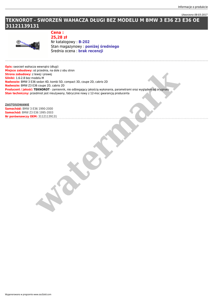 Informacje o produkcie Utworzono 08-03-2017 TEKNOROT - SWORZEŃ WAHACZA DŁUGI BEZ MODELU M BMW 3 E36 Z3 E36 OE 31121139131 Cena : 25,28 zł Nr katalogowy : B-202 Stan magazynowy : poniżej średniego Średnia ocena : brak recenzji w at ZASTOSOWANIE Samochód: BMW 3 E36 1990-2000 Samochód: BMW Z3 E36 1995-2003 Nr porównawczy OEM: 31121139131 er m ar k Opis: sworzeń wahacza wewnątrz (długi) Miejsce zabudowy: oś przednia, na dole z obu stron Strona zabudowy: z lewej i prawej Silniki: 1.6-2.8 bez modelu M Nadwozie: BMW 3 E36 sedan 4D, kombi 5D, compact 3D, coupe 2D, cabrio 2D Nadwozie: BMW Z3 E36 coupe 2D, cabrio 2D Producent / jakość: TEKNOROT - zamiennik, nie odbiegający jakością wykonania, parametrami oraz wyglądem od oryginału Stan techniczny: przedmiot jest nieużywany, fabrycznie nowy z 12-msc gwarancją producenta Wygenerowano w programie www.oscGold.com