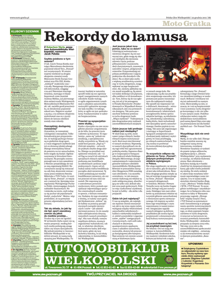 www.moto.gratka.pl Polska Głos Wielkopolski | 22 grudnia 2011 | 21 Moto Gratka a 22 listopada.Automobilklub Wielkopolskiaktywniewłączyłsię wobchodyŚwiatowegoDniaPamięci OfiarWypadkówKomunikacyjnych. Zaprosiłdoswejsiedzibyw Poznaniu przyul.Towarowej35/37wszystkich, którzychcieliposzerzyćswąwiedzę wzakresie udzielaniapierwszejpomocy. Często właśniew tensposóbrozpoczyna sięratowanieżycialubzdrowia. Wobchodyangażująsięiwspierająje: ONZ,ŚwiatowaOrganizacjaZdrowiaWHO orazEuropejskaFederacjaOfiar WypadkówDrogowychFEBR. a 26 listopada.Rozegrano„Rajd wciemno”,stanowiącyjednocześnie finałowąrundęMosińskichMistrzostw Motorowychsezonu2011.Organizatorem byłatamtejszadelegatura AutomobilklubuWielkopolski. Wieczorowąporąnastartna mosińskie targowiskoprzybyło36załóg. Poprzejechaniutrasy,próbach sprawnościowychiinnychzadaniach, wbazieimprezywLuboniuwręczono trofea. a 26–27 listopada.Przedstawiciele AutomobilklubuWielkopolski uczestniczyliwPoznaniuw seminarium zorganizowanymprzezGłównąKomisję BRDPZMwrazzZarządemOkręgowym PZMwPoznaniu.Dyskutowanoobieżącej działalnościorazplanachnaprzyszłość. Spotkanieuświetniłswojąobecnością panprof.BernardRzeczyński. a 2 grudnia.Minęły34lataod inauguracyjnegowyścigunaTorze „Poznań”.Dodziśjestonjedynymw Polsceprofesjonalnymtorem,którego systemybezpieczeństwakontrolowane przezFIAiUEMpozwalająna organizowaniewyścigówmotocyklowych isamochodowychwrandzeeuropejskiej. a 3 grudnia. 115załógpojawiłosię naTorze„Poznań”,abywziąćudziałwVII SuperOesie,któryzakończyłtegoroczny cykliwyłoniłjegozwycięzców. „ZdobywcomPodium”(szczegółyna www.aw.poznan.pl)serdecznie gratulujemy!Wartopokreślić,żeprzez całysezonkażdaedycjawyróżniałasię dużąliczbąstartujących.Trasypróbbyły nawierzchniowozróżnicowane,awięc przeztoi dynamiczne.Cieszylisięztego kierowcyjakrównieżimiłośnicy towarzyszącySuperOesowym zmaganiom. a 5 grudnia.WsaliCechuRzemiosła iMałejPrzedsiębiorczościw Gnieźnie przyul.Tumskiej15odbyłosięWalne ZebranieSprawozdawczezdziałalności w2011rokuGnieźnieńskiejDelegatury AutomobilklubuWielkopolski. Podsumowanotegorocznądziałalność orazomówionoplanynaprzyszłość. Wyróżniającymsiędziałaczomwręczono odznakikluboweiPZM. a 7 grudnia.RadaKlubuAutomobilklubu Wielkopolskizebrałasięna Torze „Poznań”.Omówiononajważniejsze wydarzeniamijającegoroku. Dyskutowanorównieżoplanachna rok 2012.Delegaturomsprawiono niespodziankiwpostacipneumatycznych braminamiotówdlajeszczelepszej wizerunkowejoprawyimprez AutomobilklubuWielkopolski. a 10 grudnia.Zgodnieztradycją zwycięzcy „Nocki”organizująjejkolejne wydanie.Triumfatorzyzroku2010–Jakub GoleciŁukaszPokrywkatakzachęcali doudziałuw tegorocznej edycji samochodowej„NocnejJazdy Konkursowej”:oddamy Dziadawszybkie ręce!NajstarszaimprezaAutomobilklubu Wielkopolskitowłaśnie„Nocka”,naktórej od49latspotykająsięzupełniamatorzyz mistrzamiPolskiirywalizująjakrówny zrównym „potrasie”,wykonujączadania orazatrakcyjnepróbysprawnościowe naTorze„Poznań”.Organizatorzy– zwracającsiędo69sklasyfikowanych załógwyrazilinadzieję,żeuczestnicy „Nocki”dobrzesiębawili,trasasię podobała,apróbybyłysatysfakcjonujące. Serdecznieteżpodziękowalipatronom, sponsoromiwszystkimosobom,które pomogłyprzyorganizacji„Nocki”! Wprzyszłymrokuorganizowaćjąbędą tegorocznizwycięzcyBłażejiRobert Krotoscy. a 11 grudnia.Organizator„Rajdu Gwiazdka”AutomobilklubWielkopolski zgromadziłnastarciewLuboniunaplacu przyul.Targowej27załóg.Metęmiałyone naTorze„Poznań”.Obecnetamdzieci, zupominkamiodAutomobilklubu Wielkopolski,odwiedziłgwiazdor. Potrasieporuszanosięwedługitinerera wykonującpróbysprawnościowe, pobierającwizynapunktachkontroli przejazduorazzgłaszającsięnapunktach kontroliczasu.Wręczającpuchary podsumowanoteżsezonw:Popularnych SamochodowychMistrzostwachOkręgu orazOkręgowegoPucharu ZmotoryzowanychTurystów. a 13grudnia.Uroczystewręczenie nagród„Medialna10-kaWielkopolski”, OddziałuWielkopolskiegoStowarzyszenia DziennikarzyRP,odbyłosięwKlubie „Krąg”przyulicyDmowskiego37 wPoznaniu.Uhonorowanym–wśródnich RobertowiWerle,prezesowi AutomobilklubuWielkopolski–wręczono certyfikatyi statuetki„PrzyjaznyMediom”. a 14 grudnia.PrzyulicyKrotowskiego16 wMosinie–siedzibietamtejszej DelegaturyAutomobilklubuWielkopolski, odbyłosię WalneZebranie Sprawozdawczezdziałalnościw2011 roku.Omówionoteżplanynarokprzyszły. a 16–17grudnia.NaTorze„Poznań” AutomobilklubWielkopolski zgromadził wszystkichspragnionychrajdowych zmagań,natradycyjnymSuperOesie Wigilijnym.Swobodniejszaopinia„mówi”, żegromadzionwszystkichchcących wykręcićsięodświątecznychporządków. Jesttoimprezadwudniowazetapem nocnymidziennymdającamożliwość sprawdzeniasięwskrajnieróżnych warunkach.Wtymrokuskorzystałoztego ponad100załógzcałejPolski. Rekordy do lamusa Z Robertem Werle, prezesem Automobilklubu Wielkopolski, rozmawia Jacek Pałuba Szybko jeżdżono w tym sezonie? O tak. Czech Tomas Kostka startujący Mercedesem dwukrotnie poprawiał rekord Toru „Poznań” aut turystycznych. W ostatni majowy weekend na drugim okrążeniu czwartej rundy Mistrzostw Strefy Europy Centralnej 2011 FIA CEZ, Kostka „wykręcił” znakomity czas – 1:24.483. Następnego dnia poprawił swój rezultat, osiągając 1:24.401! Natomiast trzeciego września, startujący w klasie Superstock 1000 Austriak Andreas Meklau, już pierwszego dnia szóstej rundy Wyścigowych Motocyklowych Mistrzostw Polski tak zaciekle gonił przeciwnika, że dwukrotnie poprawiał rekord toru. Najpierw uzyskał 1.33,054, a na szóstym okrążeniu wyśrubował czas na 1.33,037. Zatem do lamusa odesłane zostały stare rekordy. Oszczędniej, dostępniej, rozważniej? Oczywiście, że rozważniej i dostępniej i oszczędniej. Tylko formalnością jest przypomnienie, że wyścigi pachnące benzyną to 