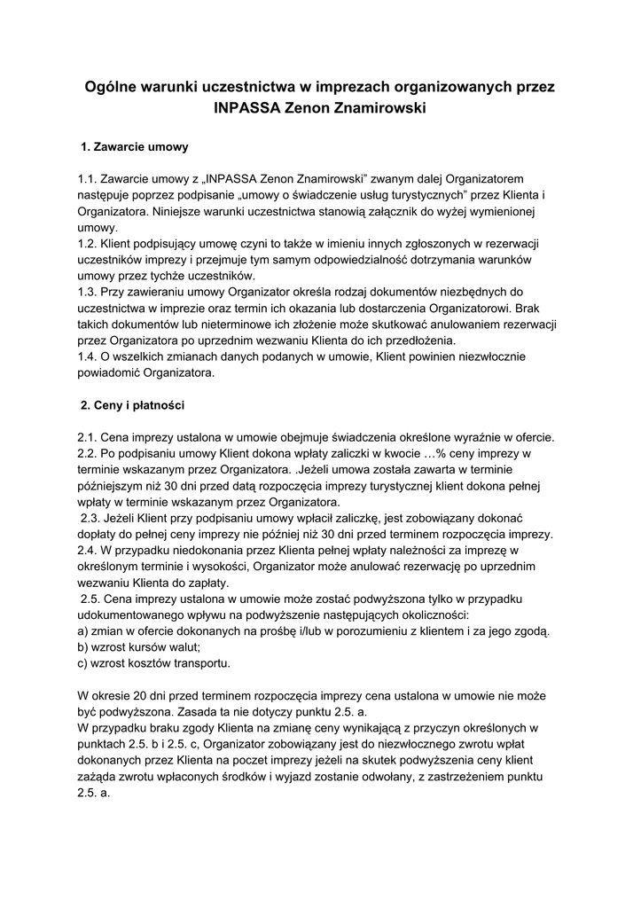 Ogólne warunki uczestnictwa w imprezach organizowanych przez INPASSA Zenon Znamirowski 1. Zawarcie umowy 1.1. Zawarcie umowy z „INPASSA Zenon Znamirowski” zwanym dalej Organizatorem następuje poprzez podpisanie „umowy o świadczenie usług turystycznych” przez Klienta i Organizatora. Niniejsze warunki uczestnictwa stanowią załącznik do wyżej wymienionej umowy. 1.2. Klient podpisujący umowę czyni to także w imieniu innych zgłoszonych w rezerwacji uczestników imprezy i przejmuje tym samym odpowiedzialność dotrzymania warunków umowy przez tychże uczestników. 1.3. Przy zawieraniu umowy Organizator określa rodzaj dokumentów niezbędnych do uczestnictwa w imprezie oraz termin ich okazania lub dostarczenia Organizatorowi. Brak takich dokumentów lub nieterminowe ich złożenie może skutkować anulowaniem rezerwacji przez Organizatora po uprzednim wezwaniu Klienta do ich przedłożenia. 1.4. O wszelkich zmianach danych podanych w umowie, Klient powinien niezwłocznie powiadomić Organizatora. 2. Ceny i płatności 2.1. Cena imprezy ustalona w umowie obejmuje świadczenia określone wyraźnie w ofercie. 2.2. Po podpisaniu umowy Klient dokona wpłaty zaliczki w kwocie …% ceny imprezy w terminie wskazanym przez Organizatora. .Jeżeli umowa została zawarta w terminie późniejszym niż 30 dni przed datą rozpoczęcia imprezy turystycznej klient dokona pełnej wpłaty w terminie wskazanym przez Organizatora. 2.3. Jeżeli Klient przy podpisaniu umowy wpłacił zaliczkę, jest zobowiązany dokonać dopłaty do pełnej ceny imprezy nie później niż 30 dni przed terminem rozpoczęcia imprezy. 2.4. W przypadku niedokonania przez Klienta pełnej wpłaty należności za imprezę w określonym terminie i wysokości, Organizator może anulować rezerwację po uprzednim wezwaniu Klienta do zapłaty. 2.5. Cena imprezy ustalona w umowie może zostać podwyższona tylko w przypadku udokumentowanego wpływu na podwyższenie następujących okoliczności: a) zmian w ofercie dokonanych na prośbę i/lub w porozumieniu z klientem i za jego zgodą. b) wzrost kursów walut; c) wzrost kosztów transportu. W okresie 20 dni przed terminem rozpoczęcia imprezy cena ustalona w umowie nie może być podwyższona. Zasada ta nie dotyczy punktu 2.5. a. W przypadku braku zgody Klienta na zmianę ceny wynikającą z przyczyn określonych w punktach 2.5. b i 2.5. c, Organizator zobowiązany jest do niezwłocznego zwrotu wpłat dokonanych przez Klienta na poczet imprezy jeżeli na skutek podwyższenia ceny klient zażąda zwrotu wpłaconych środków i wyjazd zostanie odwołany, z zastrzeżeniem punktu 2.5. a. 3. Zmiana warunków umowy, odwołanie imprezy 3.1. Organizator zastrzega sobie prawo zmiany istotnych warunków umowy, z zastrzeżeniem punktu 2.5. O każdej zmianie istotnych warunków umowy Organizator niezwłocznie powiadomi Klienta. 3.2. W takiej sytuacji Klient ma prawo: a) przyjąć proponowaną zmianę umowy albo, b) odstąpić od umowy za natychmiastowym zwrotem wszystkich wniesionych świadczeń. 3.3. Organizator zastrzega sobie prawo do odwołania imprezy z powodu działania siły wyższej. 3.4. Organizator może również odwołać imprezę ze względu na niewystarczającą ilość zgłoszeń i jest zobowiązany poinformować Klienta o tym fakcie niezwłocznie w formie pisemnej na adres e-mail Klienta, nie później jednak niż na 30 dni przed planowaną datą rozpoczęcia imprezy. Liczba zgłoszeń koniecznych dla realizacji imprezy określona jest każdorazowo w umowie z Klientem. 3.5. Klient nie może dochodzić odszkodowania za niewykonanie umowy, jeżeli odwołanie imprezy nastąpiło z powodu siły wyższej lub zgłoszenia się mniejszej liczby uczestników niż określona w umowie, a Organizator powiadomił o tym klienta w uzgodnionym terminie. W takim przypadku Klient otrzyma niezwłocznie zwrot wszystkich wniesionych wpłat. 4. Rezygnacja z uczestnictwa w imprezie, zmiana uczestnika 4.1. Jeżeli Klient zrezygnuje z udziału w imprezie z przyczyn nie leżących po stronie Organizatora może zostać obciążony kosztami poniesionymi przez Organizatora dla przygotowania imprezy. 4.2. Organizator zaleca zawarcie przez Klienta umowy ubezpieczenia od kosztów rezygnacji z udziału w imprezie. 4.3. Oświadczenie Klienta o rezygnacji z imprezy przed jej rozpoczęciem, niezależnie od przyczyny, może nastąpić wyłącznie na piśmie na adres email Organizatora. Za datę rezygnacji przyjmuje się datę otrzymania przez Organizatora stosownego oświadczenia Klienta. 4.4. Po otrzymaniu oświadczenia o rezygnacji z udziału w imprezie Organizator dokona szczegółowego wyliczenia faktycznie poniesionych kosztów związanych z organizacją imprezy i przedstawi je Klientowi. 4.5. Klient może przenieść na osobę spełniającą warunki udziału w imprezie wszystkie przysługujące mu z tytułu umowy uprawnienia, jeżeli jednocześnie osoba ta przejmuje wszystkie wynikające z tej umowy obowiązki (potwierdzone na piśmie). 4.6. Przeniesienie uprawnień i przejęcie obowiązków z umowy jest skuteczne wobec Organizatora, jeżeli Klient zawiadomi go o tym a Organizator wyrazi na to zgodę. 4.7. Klient i osoba przejmująca jego uprawnienia solidarnie odpowiadają za: a) nie uiszczoną część ceny imprezy oraz b) wszystkie koszty poniesione przez Organizatora w wyniku zmiany uczestnika imprezy. 5. Odpowiedzialność stron 5.1. Organizator odpowiada za niewykonanie lub nienależyte wykonanie umowy, chyba że jest to spowodowane wyłącznie: a) działaniem lub zaniechaniem Klienta b) działaniem lub zaniechaniem osób trzecich, nie uczestniczących w wykonaniu usług przewidzianych w umowie, jeżeli tych działań lub zaniechań nie można było przewidzieć lub uniknąć, c) siłą wyższą 5.2. Organizator ogranicza swą odpowiedzialność za niewykonanie lub nienależyte wykonanie umowy do dwukrotności ceny imprezy względem każdego Klienta. 5.3. Klient / Uczestnik powinien: mieć aktu
