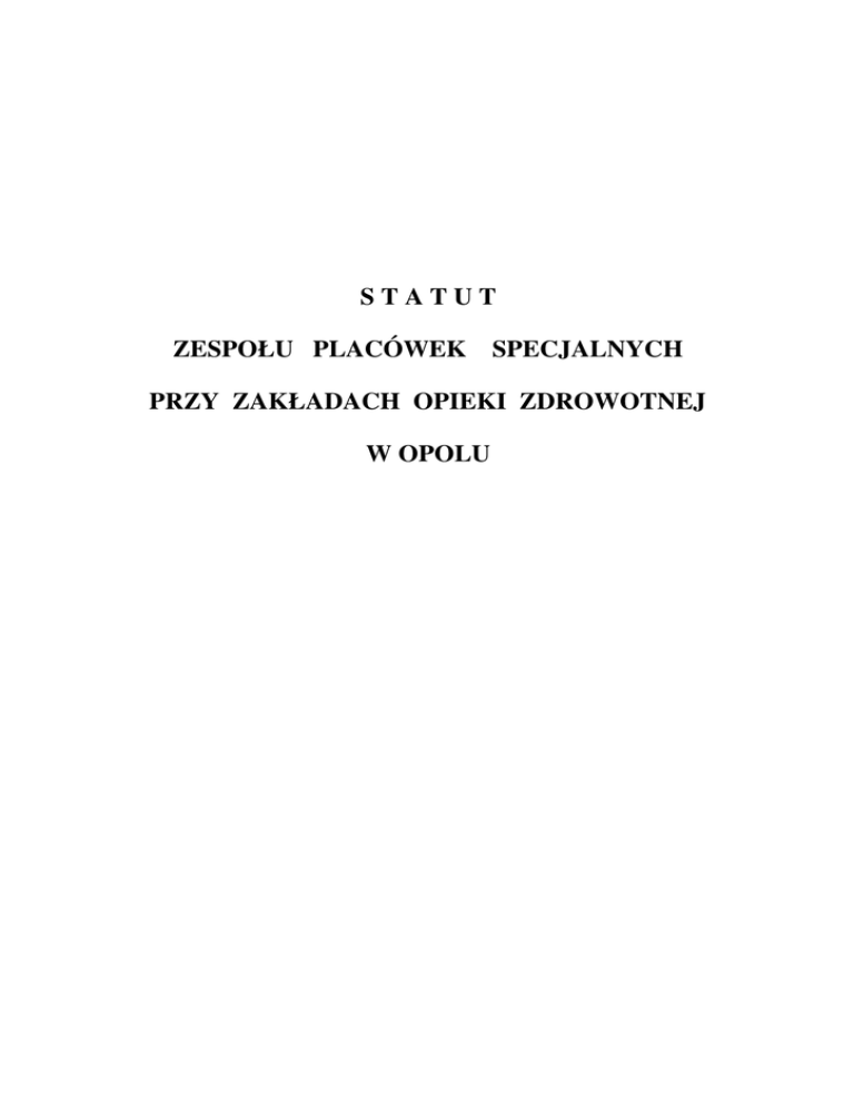 STATUT ZESPOŁU PLACÓWEK SPECJALNYCH PRZY ZAKŁADACH OPIEKI ZDROWOTNEJ W OPOLU STATUT ZESPOŁU PLACÓWEK SPECJALNYCH PRZY ZAKŁADACH OPIEKI ZDROWOTNEJ w OPOLU Rozdział I POSTANOWIENIA OGÓLNE §1 1.1 Szkoła nosi nazw : Zespół Placówek Specjalnych przy zakładach opieki zdrowotnej, zwany w dalszej tre ci statutu Zespołem. 1.2 Siedziba Zespołu: Opole, Al. Wincentego Witosa 26. 1.3 Organem prowadz cym Zespół jest Zarz d Województwa Opolskiego . 1.4 Organem sprawuj cym nadzór pedagogiczny jest Opolski Kurator O wiaty . 1.5 Zespół jest placówk publiczn i prowadzi swoje zadania nieodpłatnie. 1.6 Zespół jest jednostk bud etow , posiada rachunek bankowy i prowadzi gospodark finansow i materiałow okre lon odr bnymi przepisami. §2 2.1 W skład Zespołu wchodz szkoły przy nast puj cych zakładach opieki zdrowotnej: a) Wojewódzkie Centrum Medyczne w Opolu – Al. W. Witosa 26, b) Szpital Wojewódzki w Opolu - ul. Ko nego 53, c) Wojewódzki Specjalistyczny Zespół Neuropsychiatryczny w Opolu – ul. Wodoci gowa 4, d) Samodzielny Publiczny Zespół Szpitali Pulmonologiczno-Reumatologicznych z siedzib w Kup – ul. Karola Miarki 6 . §3 3.1. Zespół obejmuje opiek dzieci w wieku przedszkolnym, szkoły podstawowej oraz ucz szczaj ce do gimnazjum przebywaj ce na leczeniu w zakładach opieki zdrowotnej wymienionych w § 2. 3.2. Zespół organizuje proces dydaktyczno - wychowawczy dla dzieci: a) przewlekle chorych, b) niepełnosprawnych ruchowo, c) upo ledzonych umysłowo, d) z upo ledzeniami sprz onymi, e) niedostosowanych społecznie, f) zagro onych uzale nieniami, g) z zaburzeniami zachowa . 3.3. Programy nauczania z poszczególnych przedmiotów realizowane s wybiórczo, w zale no ci od czasu pobytu dziecka w szpitalu i jego mo liwo ci percepcyjnych. Rozdział II CELE I ZADANIA ZESPOŁU PLACÓWEK SPECJALNYCH §4 4.1. Osi gni cie mo liwie wszechstronnego rozwoju uczniów w dost pnym im zakresie za pomoc specjalnych metod. 4.2. Sprawowanie opieki nad uczniami,odpowiednio do ich potrzeb oraz mo liwo ci szkoły. 4.3. Wspomaganie procesu leczenia szpitalnego w sposób dost pny nauczycielom wychowawcom, zgodnie z aktualnymi metodami pracy, pedagogiki leczniczej i rewalidacji. i §5 5.1 .Sprawowanie opieki pedagogicznej nad dzie mi przebywaj cymi na leczeniu szpitalnym z uwzgl dnieniem ich potrzeb i mo liwo ci psychofizycznych w: przedszkolu, szkole podstawowej, gimnazjum, grupie wychowawczej, zespole pozalekcyjnych zaj wychowawczych: a) zapewnienie ci gło ci uczenia si , zapobieganie powstawaniu zaległo ci w nauce, b) kształtowanie pozytywnego stosunku do szkoły, niwelowanie l ków i fobii szkolnych, c) zmniejszanie stresu jaki powoduje choroba i izolacja od rodowiska, d) budzenie szacunku do ycia człowieka, kultury i pi kna jako warto ci nadrz dnych, e) szerzenie wiedzy o warto ci zdrowia fizycznego i psychicznego, f) kształtowanie nawyków higieny, oddziaływanie prozdrowotne i proekologiczne, g) rozwijanie zainteresowa leczniczej i rewalidacji. uczniów z zastosowaniem aktualnych metod pracy, pedagogiki 5.2 .Organizowanie specjalistycznej opieki psychologiczno - pedagogicznej (rehabilitacja, rewalidacja). 5.3 .Rozwijanie poczucia to samo ci narodowej, etnicznej, religijnej. Rozdział III ORGANY ZESPOŁU PLACÓWEK SPECJALNCH §6 6.1 .Organami Zespołu s : a) Dyrektor „Zespołu”, b) Rada Pedagogiczna. 6.2 .Dyrektor Zespołu kieruje działalno ci szkoły, odpowiada za całokształt pracy dydaktyczno – wychowawczo - opieku czej szkoły i reprezentuje j na zewn trz. 6.3 Kompetencje dyrektora dotycz w szczególno ci: a) opracowania szczegółowej organizacji nauczania, wychowania (arkusz organizacji szkoły), b) zapewnienia warunków dla pełnej realizacji zada dydaktyczno – wychowawczych, c) nadzorowania realizacji planu pracy szkoły, d) sprawowania nadzoru pedagogicznego, ustalania oceny pracy nauczycieli, e) decydowania o organizacji zaj f) pozalekcyjnych, decydowania o przydziale godzin nauczania i czynno ci dodatkowych dla nauczycieli, g) nawi zywanie stałej współpracy i współdziałania z personelem medycznym, w szczególno ci w zakresie zapewnienia warunków dla mo liwie pełnej realizacji zada Zespołu wynikaj cych z planu pracy szkoły, h) realizowania uchwał rady pedagogicznej lub ich wstrzymania, je li s niezgodne z prawem, i) dysponowania rodkami finansowymi oraz ich prawidłowe wykorzystanie, j) zatrudniania, urlopowania, zwalniania, zawieszania w czynno ciach nauczycieli, k) przyznawania nagród dyrektora, l) wymierzania kar porz dkowych nauczycielom, m) wnioskowania w sprawie odznacze , nagród i wyró nie , n) inicjowania szkole i doskonalenia zawodowego nauczycieli, o) realizacji zada , wyznaczonych przez organy : prowadz cy i nadzoruj cy , 6.4 .W Zespole Placówek Specjalnych przy zakładach opieki zdrowotnej działa Rada Pedagogiczna- kolegialny organ szkoły w zakresie realizacji zada statutowych, dotycz cych kształcenia, wychowania i opieki. 6.5 6.6 .W skład rady pedagogicznej wchodz wszyscy pracownicy pedagogiczni Zespołu bez wzgl du na wymiar czasu pracy. . Przewodnicz cym rady pedagogicznej jest dyrektor: „Zespołu”. 6.7 . Zebrania plenarne Rady Pedagogicznej s organizowane przed rozpocz ciem roku szkolnego ,na zako czenie ka dego semestru oraz w miar bie cych potrzeb. Zebrania mog by organizowane na wniosek organu sprawuj cego nadzór pedagogiczny z inicjatywy przewodnicz cego , organu prowadz cego szkoł , albo co najmniej 1/3 członków rady pedagogicznej. 6.8 . W posiedzeniach rady mog uczestniczy z głosem doradczym zainteresowani przedstawiciele personelu medycznego, na zaproszenie przewodnicz cego rady lub z własnej inicjatywy za jego zgod . 6.9. Rada pedagogiczna ustala regulamin swojej działalno ci, zebrania rady s protokołowane. 6.10. Uchwały podejmowane s zwykł wi kszo ci głosów w obecno ci co najmniej ½ członków rady, którzy s zobowi zani do przestrzegania tajemnicy słu bowej. 6.11. Kompetencje rady pedagogicznej: 