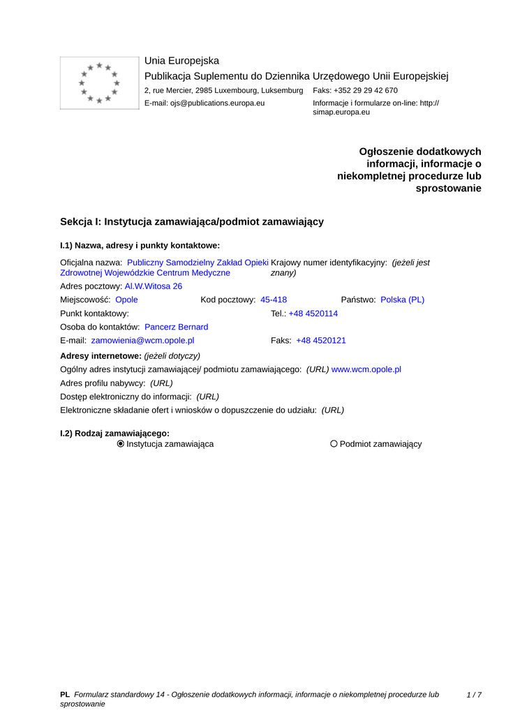 Unia Europejska Publikacja Suplementu do Dziennika Urzędowego Unii Europejskiej 2, rue Mercier, 2985 Luxembourg, Luksemburg Faks: +352 29 29 42 670 E-mail: [email protected] Informacje i formularze on-line: http:// simap.europa.eu Ogłoszenie dodatkowych informacji, informacje o niekompletnej procedurze lub sprostowanie Sekcja I: Instytucja zamawiająca/podmiot zamawiający I.1) Nazwa, adresy i punkty kontaktowe: Oficjalna nazwa: Publiczny Samodzielny Zakład Opieki Krajowy numer identyfikacyjny: (jeżeli jest Zdrowotnej Wojewódzkie Centrum Medyczne znany) _____ Adres pocztowy: Al.W.Witosa 26 Miejscowość: Opole Kod pocztowy: 45-418 Punkt kontaktowy: _____ Państwo: Polska (PL) Tel.: +48 4520114 Osoba do kontaktów: Pancerz Bernard E-mail: [email protected] Faks: +48 4520121 Adresy internetowe: (jeżeli dotyczy) Ogólny adres instytucji zamawiającej/ podmiotu zamawiającego: (URL) www.wcm.opole.pl Adres profilu nabywcy: (URL) _____ Dostęp elektroniczny do informacji: (URL) _____ Elektroniczne składanie ofert i wniosków o dopuszczenie do udziału: (URL) _____ I.2) Rodzaj zamawiającego: Instytucja zamawiająca Podmiot zamawiający PL Formularz standardowy 14 - Ogłoszenie dodatkowych informacji, informacje o niekompletnej procedurze lub sprostowanie 1/7 Sekcja II: Przedmiot zamówienia II.1.1) Nazwa nadana zamówieniu: Zakup, dostawa, montaż i uruchomienie aparatu RTG jezdnego oraz przeszkolenie personelu z zakresu jego obsługi. II.1.2) Krótki opis zamówienia lub zakupu: (podano w pierwotnym ogłoszeniu) Zakup, dostawa, montaż i uruchomienie aparatu RTG jezdnego oraz przeszkolenie personelu z zakresu jego obsługi. II.1.3) Wspólny Słownik Zamówień (CPV) Główny przedmiot Słownik główny 33111000 Słownik uzupełniający (jeżeli dotyczy) PL Formularz standardowy 14 - Ogłoszenie dodatkowych informacji, informacje o niekompletnej procedurze lub sprostowanie 2/7 Sekcja IV: Procedura IV.1)Rodzaj procedury (podano w pierwotnym ogłoszeniu) Otwarta Ograniczona Ograniczona przyspieszona Negocjacyjna Negocjacyjna przyspieszona Dialog konkurencyjny Negocjacyjna z uprzednim ogłoszeniem Negocjacyjna bez uprzedniego ogłoszenia Negocjacyjna z publikacją ogłoszenia o zamówieniu Negocjacyjna bez publikacji ogłoszenia o zamówieniu Udzielenie zamówienia bez uprzedniej publikacji ogłoszenia o zamówieniu w Dzienniku Urzędowym Unii Europejskiej IV.2)Informacje administracyjne IV.2.1)Numer referencyjny: (podano w pierwotnym ogłoszeniu) TLZP/2-23/233/3/17 IV.2.2)Dane referencyjne ogłoszenia w przypadku ogłoszeń przesłanych drogą elektroniczną: Pierwotne ogłoszenie przesłane przez eNotices TED eSender Login: ENOTICES_wcm Dane referencyjne ogłoszenia: 2017-017510 rok i numer dokumentu IV.2.3)Ogłoszenie, którego dotyczy niniejsza publikacja: Numer ogłoszenia w Dz.U.: 2017/S 028-050691 z dnia: 09/02/2017 (dd/mm/rrrr) IV.2.4)Data wysłania pierwotnego ogłoszenia: 07/02/2017 (dd/mm/rrrr) PL Formularz standardowy 14 - Ogłoszenie dodatkowych informacji, informacje o niekompletnej procedurze lub sprostowanie 3/7 Sekcja VI: Informacje uzupełniające VI.1) Ogłoszenie dotyczy: Procedury niepełnej Sprostowania Informacji dodatkowych VI.2) Informacje na temat niepełnej procedury udzielenia zamówienia: Postępowanie o udzielenie zamówienia zostało przerwane Postępowanie o udzielenie zamówienia uznano za nieskuteczne Zamówienia nie udzielono Zamówienie może być przedmiotem ponownej publikacji VI.3) Informacje do poprawienia lub dodania : VI.3.1) Zmiana oryginalnej informacji podanej przez instytucję zamawiającą Publikacja w witrynie TED niezgodna z oryginalną informacją, przekazaną przez instytucję zamawiającą Oba przypadki VI.3.2) W ogłoszeniu pierwotnym W odpowiedniej dokumentacji przetargowej (więcej informacji w odpowiedniej dokumentacji przetargowej) W obu przypadkach (więcej informacji w odpowiedniej dokumentacji przetargowej) VI.3.3) Tekst, który należy poprawić w pierwotnym ogłoszeniu Miejsce, w którym znajduje się Zamiast: zmieniany tekst: Informacje i formalności konieczne III.2.1 do dokonania oceny spełnienia wymogów: a) informacji z Krajowego Rejestru Karnego w zakresie określonym w art. 24 ust. 1 pkt 13, 14 i 21 PZP, wystawionej nie wcześniej niż 6 miesięcy przed upływem terminu składania, b) zaświadczenia właściwego naczelnika urzędu skarbowego potwierdzającego, że Wykonawca nie zalega z opłacaniem podatków, wystawionego nie wcześniej niż 3 miesiące przed upływem terminu składania ofert, lub innego dokumentu potwierdzającego, że wykonawca zawarł porozumienie z właściwym organem podatkowym w sprawie spłat tych należności wraz z ewentualnymi odsetkami lub grzywnami, w szczególności uzyskał przewidziane prawem zwolnienie, odroczenie lub rozłożenie na raty zaległych płatności lub wstrzymanie Powinno być: Informacje i formalności konieczne do dokonania oceny spełnienia wymogów: a) informacji z Krajowego Rejestru Karnego w zakresie określonym w art. 24 ust. 1 pkt 13, 14 i 21 PZP, wystawionej nie wcześniej niż 6 miesięcy przed upływem terminu składania, b) zaświadczenia właściwego naczelnika urzędu skarbowego potwierdzającego, że Wykonawca nie zalega z opłacaniem podatków, wystawionego nie wcześniej niż 3 miesiące przed upływem terminu składania ofert, lub innego dokumentu potwierdzającego, że wykonawca zawarł porozumienie z właściwym organem podatkowym w sprawie spłat tych należności wraz z ewentualnymi odsetkami lub grzywnami, w szczególności uzyskał przewidziane prawem zwolnienie, odroczenie lub rozłożenie na raty zaległych płatności lub wstrzymanie PL Formularz standardowy 14 - Ogłoszenie dodatkowych informacji, informacje o niekompletnej procedurze lub sprostowanie 4/7 w całości wykonania decyzji w całości wykonania decyzji właściwego organu, właściwego organu, c) zaświadczenia właściwej c) zaświadczenia właściwej terenowej jednostki organizacyjnej