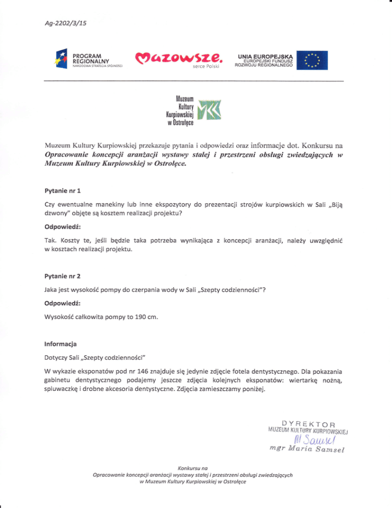 Aq-2202/3/15 PRoGRAM REcloNALNY NARoDoWA STMTE6lA spóJNoścl il,*ł f;urpiowrkiui włlttltlęcł w§ §ffi Muzeum Kultury Kurpiowskiej przekazuje pytania i odpowiedzi oraz informacje dot. Konkursu na Opracowanie koncepcji aranżacji wystawy stałej i przestrzeni obsługi zwiedzajqcych w Muzeum Kultury Kurpiowskiej w Ostrołęce. Pytanie nr 1 Czy ewentualne manekiny lub inne ekspozytory do prezentacji strojów kurpiowskich w Sali ,,Biją dzwony" objęte są kosztem realizacji projektu? Odpowiedź: Tak, Koszty te, jeślibędzie taka potrzeba wynikająca z koncepcji aranżacji, należy uwzględnić w kosztach realizacji projektu. Pytanie nr 2 Jaka jest wysokośćpompy do czerpania wody w Sali ,,Szepty codzienności"? Odpowiedź: Wysokośćcałkowita pompy to 190 cm. lnformacja Dotyczy Sa l i,,Szepty codzienności" W wykazie eksponatów pod nr 146 znajduje się jedynie zdjęcie fotela dentystycznego, Dla pokazania gabinetu dentystycznego podajemy jeszcze zdjęcia kolejnych eksponatów: wiertarkę nożną, spluwaczkę i drobne akcesoria dentystyczne. Zdjęcia zamieszczamy poniżej. DYREKToR MUZFUM KUtTURY [1,1 xunńoi,risrtrl \auwl mgr fuIaria Sansel konkursu na Opracowanie koncepcji aranżacji wystawy stałej i przestrzeni obsługi zwiedzajqcych w Muzeum Kultury Kurpiowskiej w Ostrołęce