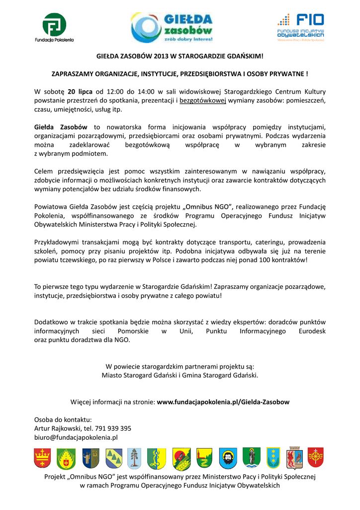 GIEŁDA ZASOBÓW 2013 W STAROGARDZIE GDAŃSKIM! ZAPRASZAMY ORGANIZACJE, INSTYTUCJE, PRZEDSIĘBIORSTWA I OSOBY PRYWATNE ! W sobotę 20 lipca od 12:00 do 14:00 w sali widowiskowej Starogardzkiego Centrum Kultury powstanie przestrzeń do spotkania, prezentacji i bezgotówkowej wymiany zasobów: pomieszczeń, czasu, umiejętności, usług itp. Giełda Zasobów to nowatorska forma inicjowania współpracy pomiędzy instytucjami, organizacjami pozarządowymi, przedsiębiorcami oraz osobami prywatnymi. Podczas wydarzenia można zadeklarować bezgotówkową współpracę w wybranym zakresie z wybranym podmiotem. Celem przedsięwzięcia jest pomoc wszystkim zainteresowanym w nawiązaniu współpracy, zdobycie informacji o możliwościach konkretnych instytucji oraz zawarcie kontraktów dotyczących wymiany potencjałów bez udziału środków finansowych. Powiatowa Giełda Zasobów jest częścią projektu „Omnibus NGO”, realizowanego przez Fundację Pokolenia, współfinansowanego ze środków Programu Operacyjnego Fundusz Inicjatyw Obywatelskich Ministerstwa Pracy i Polityki Społecznej. Przykładowymi transakcjami mogą być kontrakty dotyczące transportu, cateringu, prowadzenia szkoleń, pomocy przy pisaniu projektów itp. Podobna inicjatywa odbywała się już na terenie powiatu tczewskiego, po raz pierwszy w Polsce i zawarto podczas niej ponad 100 kontraktów! To pierwsze tego typu wydarzenie w Starogardzie Gdańskim! Zapraszamy organizacje pozarządowe, instytucje, przedsiębiorstwa i osoby prywatne z całego powiatu! Dodatkowo w trakcie spotkania będzie można skorzystać z wiedzy ekspertów: doradców punktów informacyjnych sieci Pomorskie w Unii, Punktu Informacyjnego Eurodesk oraz punktu doradztwa dla NGO. W powiecie starogardzkim partnerami projektu są: Miasto Starogard Gdański i Gmina Starogard Gdański. Więcej informacji na stronie: www.fundacjapokolenia.pl/Gielda-Zasobow Osoba do kontaktu: Artur Rajkowski, tel. 791 939 395 [email protected] Projekt „Omnibus NGO” jest współfinansowany przez Ministerstwo Pacy i Polityki Społecznej w ramach Programu Operacyjnego Fundusz Inicjatyw Obywatelskich Zarejestruj się na Giełdę Zasobów! Od 5 lipca trwa rejestracja na jedyną w swoim rodzaju imprezę. Nie przegap okazji, zrób dobry interes - zarejestruj się już dziś! Po raz pierwszy w powiecie starogardzkim: Giełda Zasobów 20 lipca 2013 (sobota): Starogardzkie Centrum Kultury Aleja Jana Pawła II 3, Starogard Gdański godz. 12:00 - 14:00 Do kogo skierowana jest Giełda? Organizacje pozarządowe. Przykładowe zasoby: prowadzenie szkoleń, organizacja imprez, uroczystości, umiejętności artystyczne, wykonywanie kart świątecznych, rękodzieło, wolontariusze, przygotowanie potraw, znajomość środowiska lokalnego, kontakty do poszczególnych grup społecznych, świetlice, kluby itp. Instytucje. Przykładowe zasoby: sale, infrastruktura (rzutnik multimedialny, pomoce edukacyjne), pomoc specjalistyczna, transport, osobowość prawna, poręczenia, rekomendacje, dane statystyczne, badania, infrastruktura kultury (nagłośnienie, sprzęt muzyczny), radcy prawni, księgowość, infrastruktura biurowa: drukarki, poczta itp. Firmy. Przykładowe zasoby: produkty (spożywcze, odzież, art. budowlane, meble itp.), transport, sprzęt komputerowy, biurowy, specjaliści np. PR, marketing, reklama, zasoby merytoryczne (np. zaplanowanie wakacji dla dzieci przez biuro podróży, przygotowanie kampanii promocyjnej projektu s[społecznego, wykonanie projektu architektonicznego), rabaty, kupony upominkowe itp. Osoby indywidualne. Przykładowe zasoby: talenty (rzeźbienie, muzyczne, plastyczne, rękodzieło), umiejętności (organizacyjne, graficzne, komputerowe), czas, kompetencje (pedagogiczne, techniczne, instruktorskie, finansowe, medyczne) i wiele innych.... Giełda Zasobów: Co należy zrobić żeby wziąć udział? Wypełnij formularz zgłoszeniowy i odeślij na dres: [email protected] do 18 lipca. UWAGA: Istnieje także możliwość rejestracji w dniu imprezy; od godz. 11:00! Więcej informacji oraz formularz zgłoszeniowy na stronie: www.fundacjapokolenia.pl/Gielda-Zasobow Projekt „Omnibus NGO” jest współfinansowany przez Ministerstwo Pacy i Polityki Społecznej w ramach Programu Operacyjnego Fundusz Inicjatyw Obywatelskich