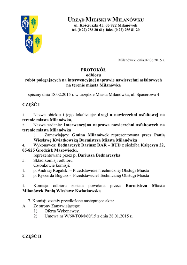 URZĄD MIEJSKI W MILANÓWKU ul. Kościuszki 45, 05 822 Milanówek tel. (0 22) 758 30 61; faks. (0 22) 755 81 20 Milanówek, dnia.02.06.2015 r. PROTOKÓŁ odbioru robót polegających na interwencyjnej naprawie nawierzchni asfaltowych na terenie miasta Milanówka spisany dnia 18.02.2015 r. w urzędzie Miasta Milanówka, ul. Spacerowa 4 CZĘŚĆ I Nazwa obiektu i jego lokalizacja: drogi o nawierzchni asfaltowej na terenie miasta Milanówka, 2. Nazwa zadania: Interwencyjna naprawa nawierzchni asfaltowych na terenie miasta Milanówka 3. Zamawiający: Gmina Milanówek reprezentowana przez Panią Wiesławę Kwiatkowską Burmistrza Miasta Milanówka 4. Wykonawca: Bednarczyk Dariusz DAR – BUD z siedzibą Kałęczyn 22, 05-825 Grodzisk Mazowiecki, reprezentowane przez p. Dariusza Bednarczyka 5. Skład komisji odbioru Członkowie komisji: 1. p. Andrzej Rogalski – Przedstawiciel Technicznej Obsługi Miasta 2. p. Ryszarda Bogusz - Przedstawiciel Technicznej Obsługi Miasta 1. Komisja odbioru została powołana Milanówek Panią Wiesławę Kwiatkowską 1. przez: Burmistrza 7. Komisji zostały przedłożone następujące akta: A. Ze strony Zamawiającego: 1) Oferta Wykonawcy, 2) Umowa nr W/60/TOM/60/15 z dnia 28.01.2015 r., CZĘŚĆ II Miasta USTALENIA KOMISJI DOTYCZĄCEJ ODBIORU ROBÓT Na podstawie przedstawionych dokumentów i szczegółowego zapoznania się oraz dokładnej kontroli obiektu komisja ustaliła, że: Przedmiot odbioru, stanowią roboty o wartości 13.736,76 zł brutto (słownie: trzynaście tysięcy siedemset trzydzieści sześć złotych 76/100) 1. Lp . Roboty zostały wykonane w następującym zakresie: Kalkulacja indywidualna Opis Jednostk a miary Ilość Cena jednostko wa Obiekt: Drogi stanowiące własność Gminy Milanówek Element: Interwencyjne naprawy nawierzchni asfaltowych na terenie miasta Milanówka Ludna - (8, 41a) 29,44 45,00 1. 2. 3. 4. 5. 6. 7. 8. 9. 10. 11. 12. 13. 14. 15. 16. 17. 18. 19. 20. 21. 22. 23. 24 25 26 Podgórna - (104, 37, przy pierwszej posesji od ul. Kościuszki, 23A, 23x2, 2, 12) Razem 1.324,80 9,59 45,00 431,55 Podleśna - (51, 100x2) Piasta - (30) Literacka - (2, studzienka koło szkoły) 3,86 0,56 45,00 45,00 173,70 25,20 1,5 45,00 67,50 Mickiewicza - (21, 15, 8A, 6, 7) Brzozowa - (7A, 7) Królowej Jadwigi /Starodęby Krakowska - (naprzeciwko szkoły, 15) Królewska/Grudowska Nadarzyńska (Królewska/Nadarzyńska, 37, naprzeciwko sklepu, 68, 82bc, na skrzyżowaniu na końcu ulicy) Podleśna - 27a x 2 Podgórna - 37, 39, Podgórna/wigury, za nr 100 Mała - 9 Wojska Polskiego - 76, 42a Mickiewicza - 23 Piasta - 21 Literacka - 2 Królowej Jadwigi - początek ulicy Starodęby przy przystanku Grabowa/ Okólna Łąkowa/Zielna Podwiejska - 38 Piotra Skargi Podleśna Skrzyżowanie Łącznej/Okrzei 8,63 4,74 3,74 45,00 45,00 45,00 388,35 213,30 168,30 5 45,00 225,00 1 45,00 45,00 8,87 45,00 399,15 2,7 45,00 121,50 12,04 45,00 541,80 8,2 3,24 12,86 3,95 5,08 1,43 2,99 3 3,75 2,39 17,6 26,02 66 248,18 45,00 45,00 45,00 45,00 45,00 45,00 45,00 45,00 45,00 45,00 45 45 45 369,00 145,80 578,70 177,75 228,60 64,35 134,55 135,00 168,75 107,55 792 1.170,9 2.970,00 Naprawa nawierzchni asfaltowych poprzez uzupełnienie warstwy ścieralnej z mieszanek mineralno - bitumicznych, i uzupełnienie podbudowy tłuczniem zagęszczonym mechanicznie 2 m Razem Razem zł netto 11.168,10 Podatek VAT 2.568,66 Razem zł brutto 13.736,76 2. Jakość robót i użytych materiałów uznaje się za dobrą. Członkowie komisji podpisali na oryginale CZĘŚĆ III Inne wnioski komisji: Brak Protokół sporządzono w 3 egzemplarzach z przeznaczeniem dla: 3) Jeden dla Wykonawcy 4) Dwa dla Inwestora Członkowie Komisji: Wykonawca: 1. …………………………. 2. ……………………….... 1. ……………………………..